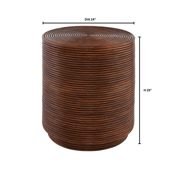 The Papeete collection is a nod to the beauty of island life and the natural world. Named after the capital of Tahiti, each piece within this collection features uniform walnut-stained rattan strands, tightly wound around an MDF substrate form and then coiled onto the top of the design. This intricate technique reflects the skill and dedication of Philippine artisans who handcraft these unique pieces. A walnut-stained recessed plinth creates a cohesive design that resonates with the spirit of nature. This end table is an artistic representation of the beauty of tropical life.