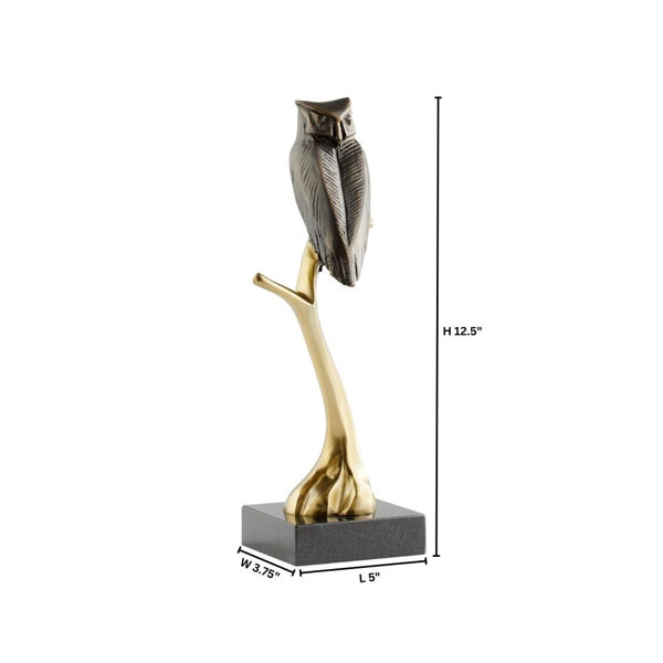 The sand-cast Nocturnal sculpture is a fusion of artistry and elegance. This hand-sculpted owl, finished in a rich antique bronze, gracefully perches on a polished brass stand. Resting on a sleek black marble base, this sculpture is perfect for those who appreciate the finer things in life. Elevate your decor with this captivating symbol of wisdom and beauty