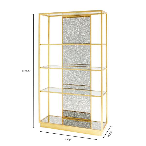 Classic, beautiful - this etagere carries an iconic duo of antiqued mirrored glass and a gold leaf finish. Four sizeable shelves compliment a slender iron frame that supports a mirrored panel that runs down the center, leaving the corners open to a versatile grouping of styling options. Add class to your space by placing the Etagere in a formal dining, living area, or bedroom.