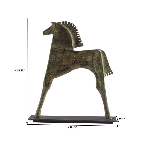 The Etruscan steed sculpture is an iconic representation of strength and power, capturing the essence of an ancient symbol in a contemporary form. These remarkable pieces pay homage to the Etruscan horse, an enduring emblem of might and grace. The verdigris finish of the Etruscan steed adds an air of timeless beauty and allure, evoking the patina of age and history. Each horse stands gracefully atop a black metal platform base, offering stability and contrast.