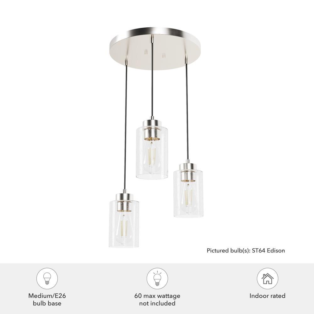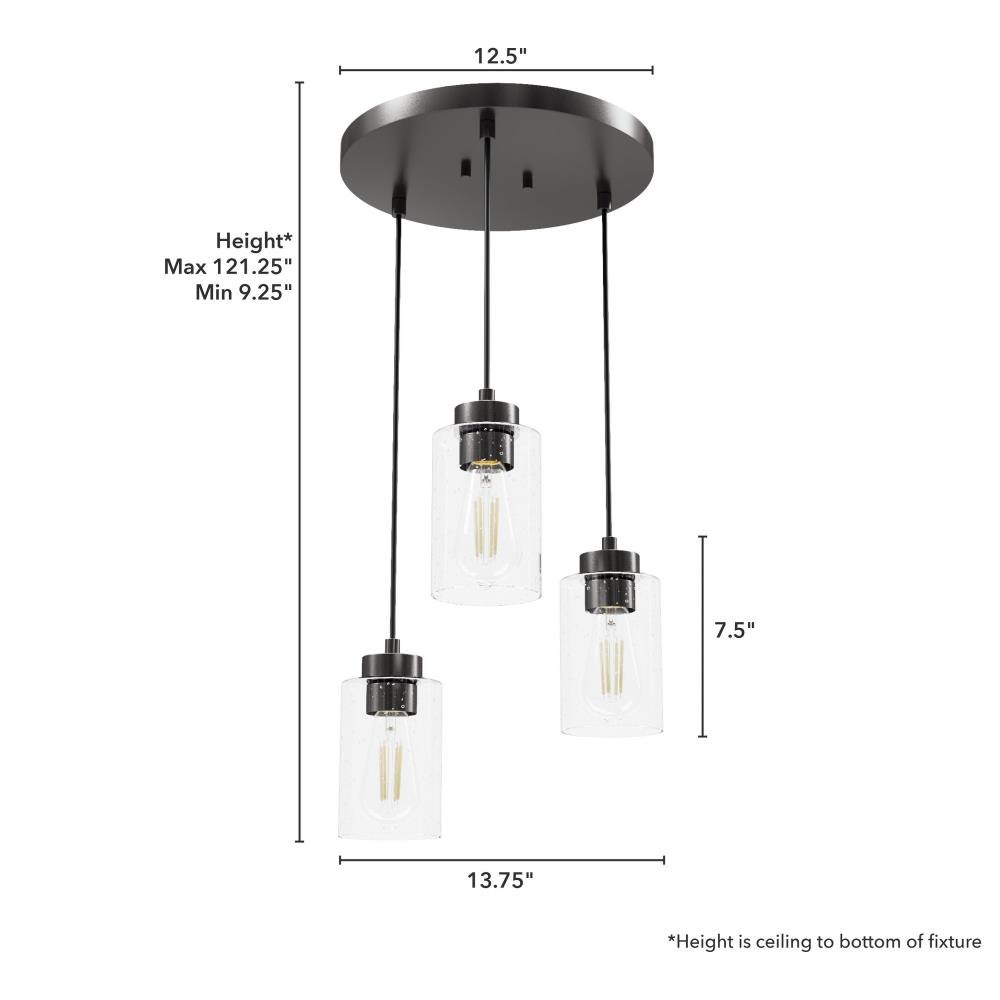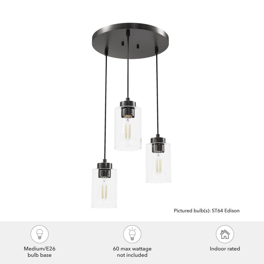 The Hartland round cluster is a fixture for all styles. Whether your taste is farmhouse, industrial or bohemian, the Hartland fixture will suit your style. The organic look of the glass shades hanging from the metal base forms a glow that will light your evenings beautifully. The finish options help you find the perfect look for your space. Create a more cohesive look by adding other lights from the Hartland collection or mix and match with fixtures from our other collections.. Rated for indoor use only. Requires 3 E26 bulbs. Bulbs not included.. MADE FOR INDOORS: For use in indoor spaces like kitchens, bedrooms, living rooms, dining rooms, and entryways.. BULB RECOMMENDATION: Maximum 60 W per light bulb or equivalent LED bulb. Bulbs not included.. PICTURED HERE: Match our image using ST64 Edison light bulbs.. CUSTOMIZABLE HANGING OPTIONS: With the minimum required cord, the hanging length is inches. When using all of the included cord, the maximum hanging length is inches.. WARRANTY: One-year limited warranty backed by the trusted experts at Hunter.