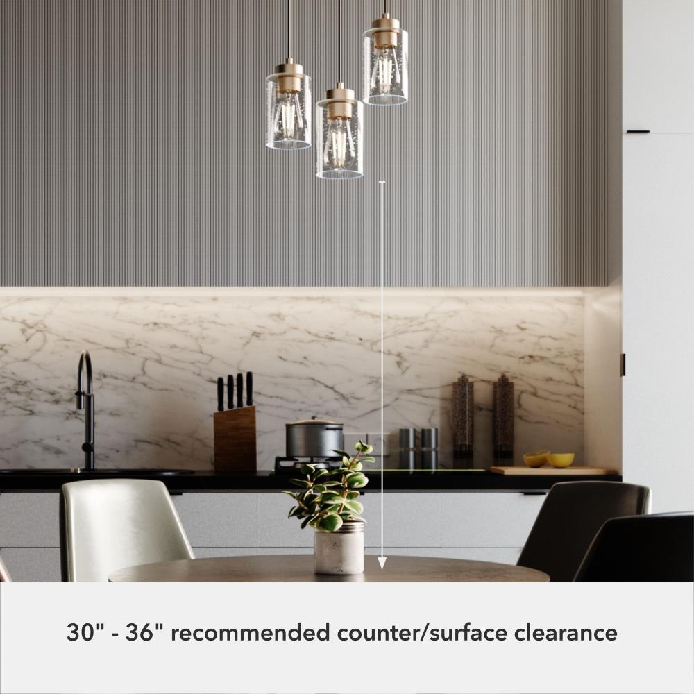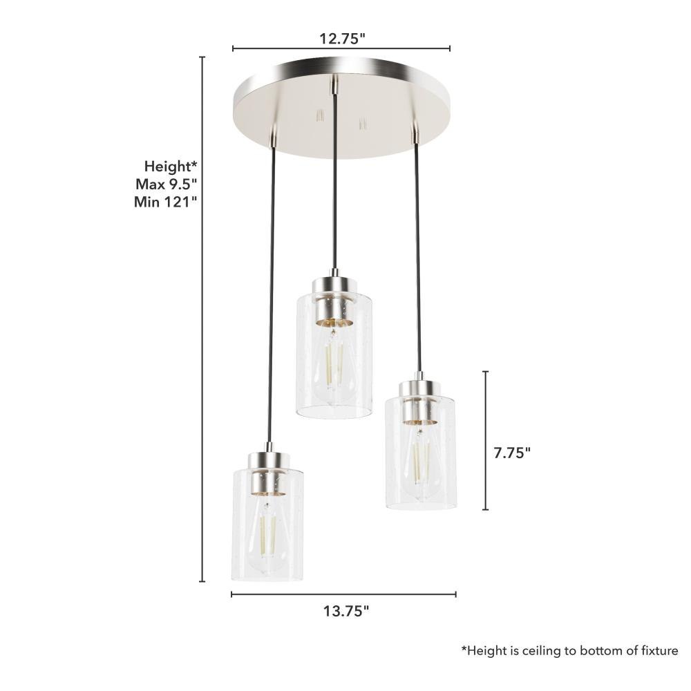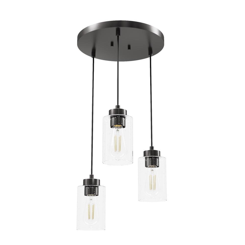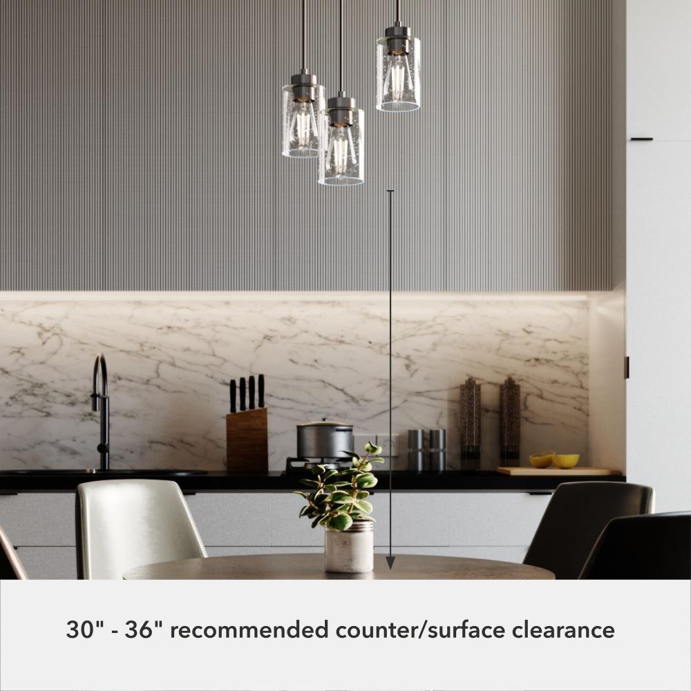 The Hartland round cluster is a fixture for all styles. Whether your taste is farmhouse, industrial or bohemian, the Hartland fixture will suit your style. The organic look of the glass shades hanging from the metal base forms a glow that will light your evenings beautifully. The finish options help you find the perfect look for your space. Create a more cohesive look by adding other lights from the Hartland collection or mix and match with fixtures from our other collections.. Rated for indoor use only. Requires 3 E26 bulbs. Bulbs not included.. MADE FOR INDOORS: For use in indoor spaces like kitchens, bedrooms, living rooms, dining rooms, and entryways.. BULB RECOMMENDATION: Maximum 60 W per light bulb or equivalent LED bulb. Bulbs not included.. PICTURED HERE: Match our image using ST64 Edison light bulbs.. CUSTOMIZABLE HANGING OPTIONS: With the minimum required cord, the hanging length is inches. When using all of the included cord, the maximum hanging length is inches.. WARRANTY: One-year limited warranty backed by the trusted experts at Hunter.