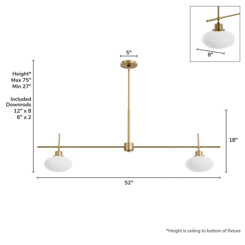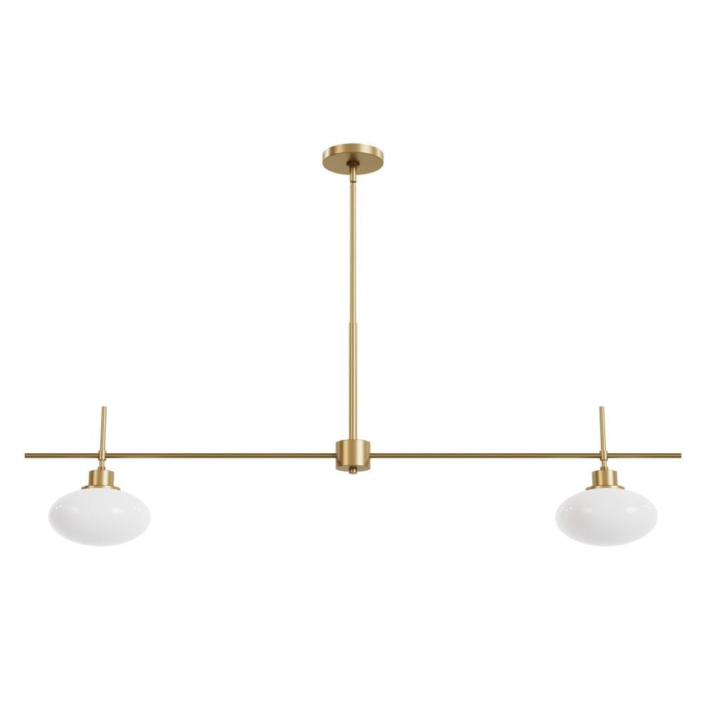 Capture the essence of modern luxury with the Getty 2 Light Island from the Jasmine Roth Collection. This 52" wide fixture, finished in Luxe Gold, is designed for those who appreciate both style and function. The uniquely crafted ellipse-shaped milk glass ensures an even wash of light, enhanced by its durable, scratch-resistant quality. Perfectly sized for long tables or islands, it’s the ultimate addition to elevate your space.