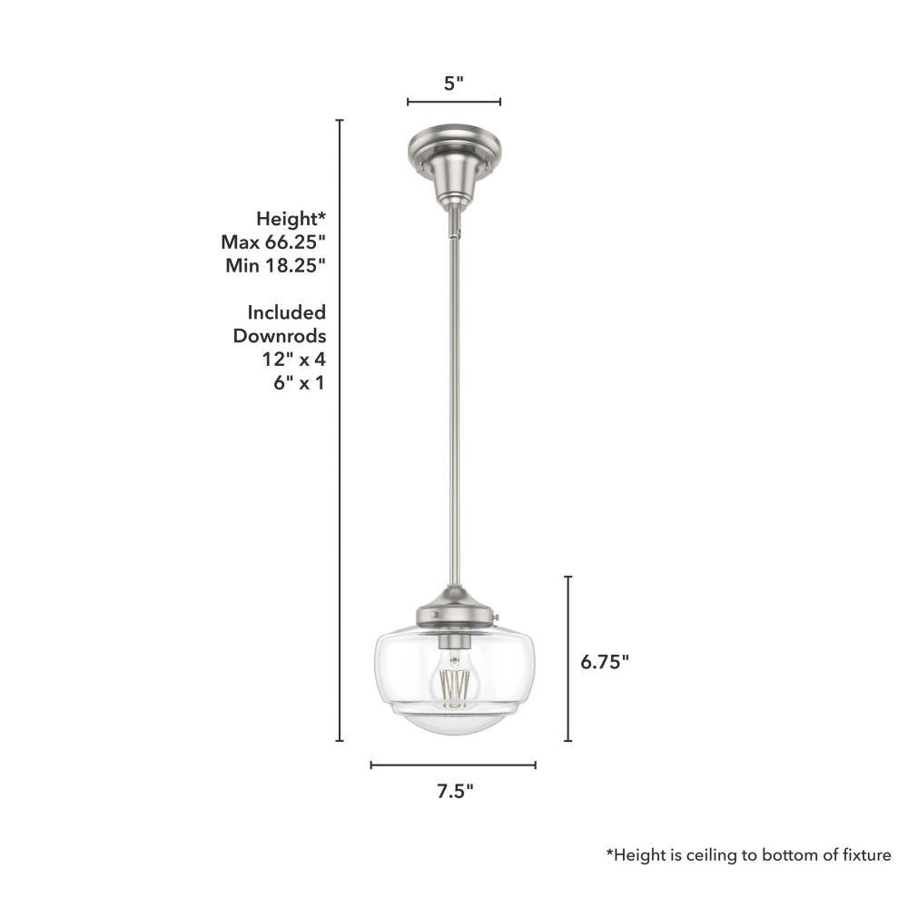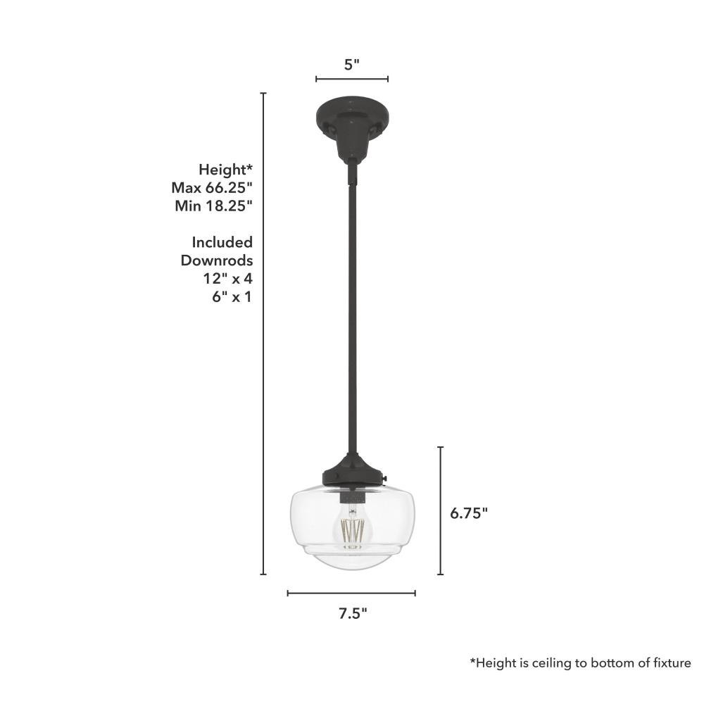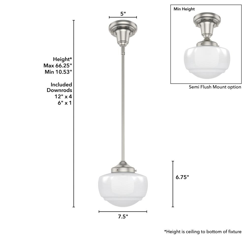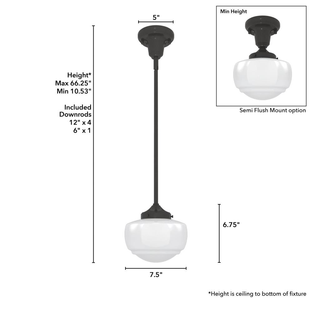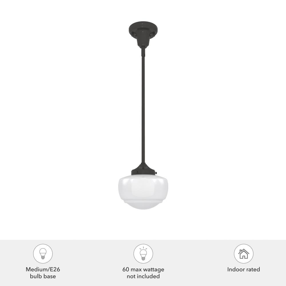 Traditional design. Elevated elements. The Saddle Creek mini pendant draws inspiration from the iconic American schoolhouse light but adds an updated touch with subtle detailing in the glass shade. For those who want all-in-one light fixtures, this schoolhouse-inspired mini pendant can also be installed as a semi-flush mount lighting. Rated for indoor use only Requires 1 E26 bulbs. Bulbs not included. MADE FOR INDOORS: For use in indoor spaces like kitchens, bedrooms, living rooms, dining rooms, and entryways. BULB RECOMMENDATION: Maximum 60 W per light bulb or equivalent LED bulb. Bulbs not included. CUSTOMIZABLE HANGING OPTIONS: With the minimum required downrod, the hanging length is 18.25 inches. When using all of the included downrod, the maximum hanging length is 66.25 inches.