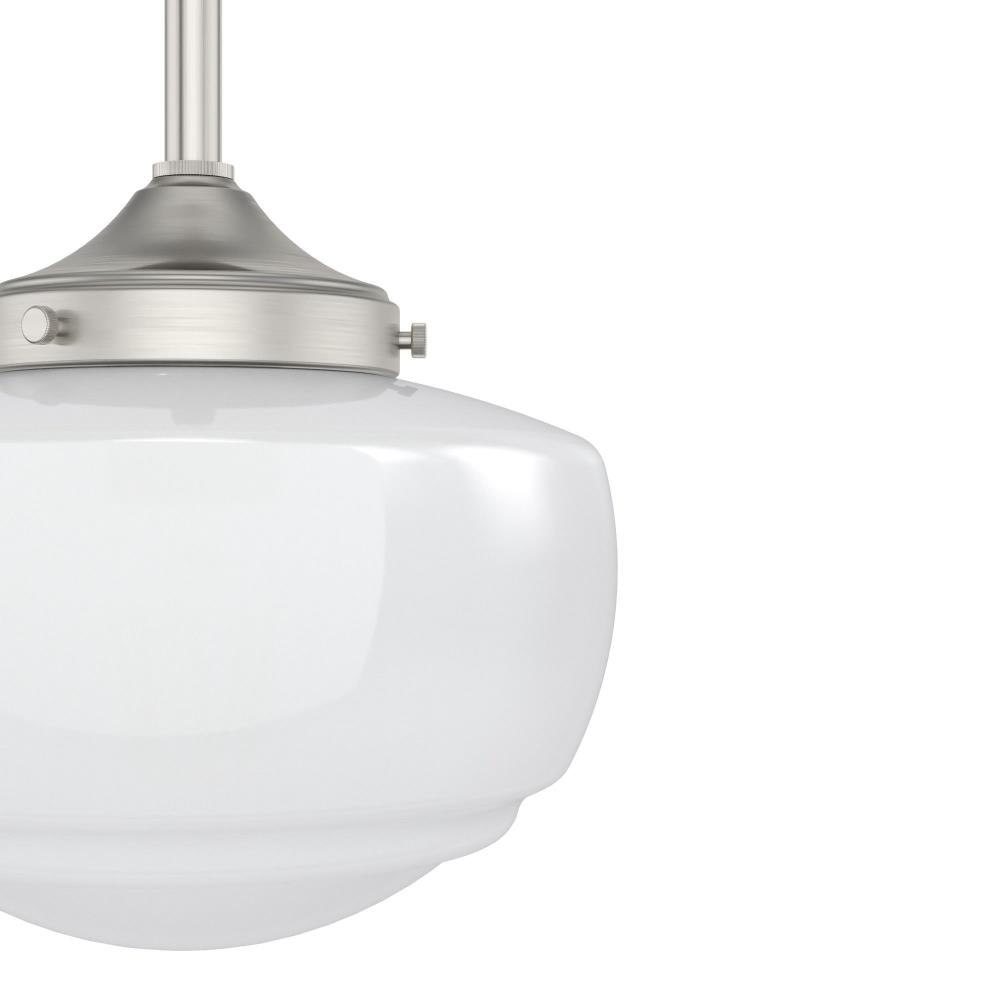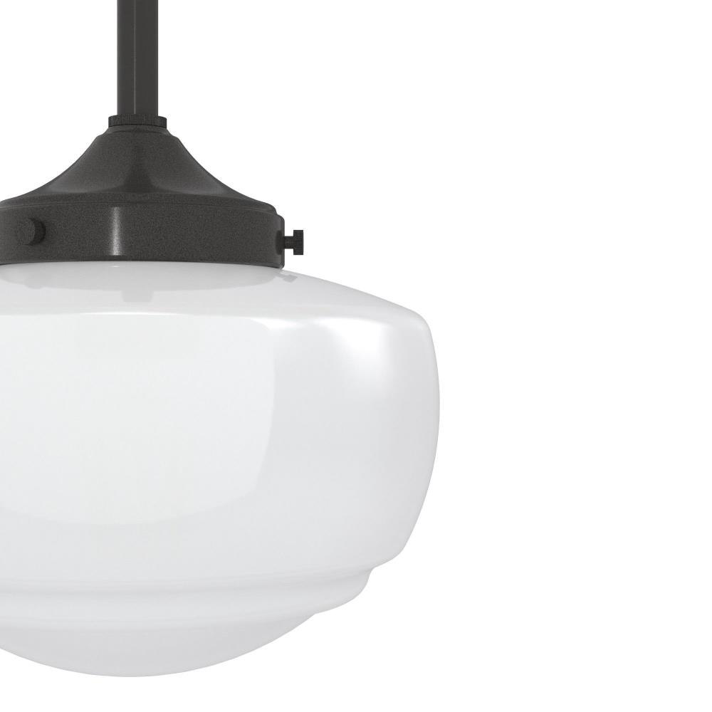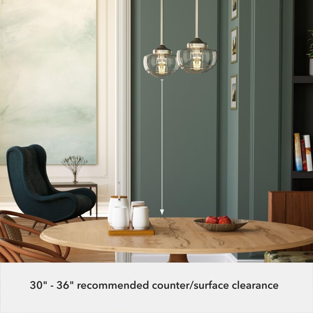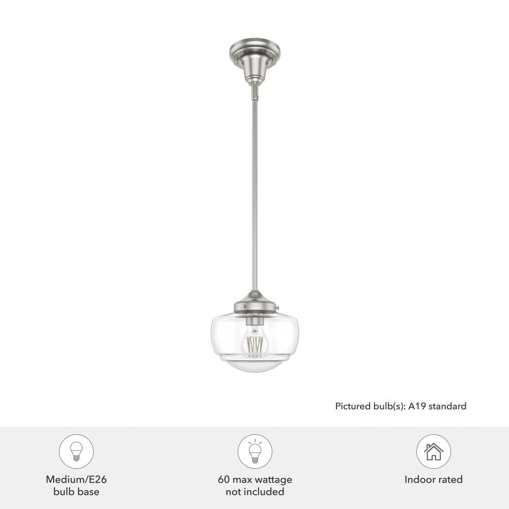 Traditional design. Elevated elements. The Saddle Creek mini pendant draws inspiration from the iconic American schoolhouse light but adds an updated touch with subtle detailing in the glass shade. For those who want all-in-one light fixtures, this schoolhouse-inspired mini pendant can also be installed as a semi-flush mount lighting. Rated for indoor use only Requires 1 E26 bulbs. Bulbs not included. MADE FOR INDOORS: For use in indoor spaces like kitchens, bedrooms, living rooms, dining rooms, and entryways. BULB RECOMMENDATION: Maximum 60 W per light bulb or equivalent LED bulb. Bulbs not included. CUSTOMIZABLE HANGING OPTIONS: With the minimum required downrod, the hanging length is 18.25 inches. When using all of the included downrod, the maximum hanging length is 66.25 inches.