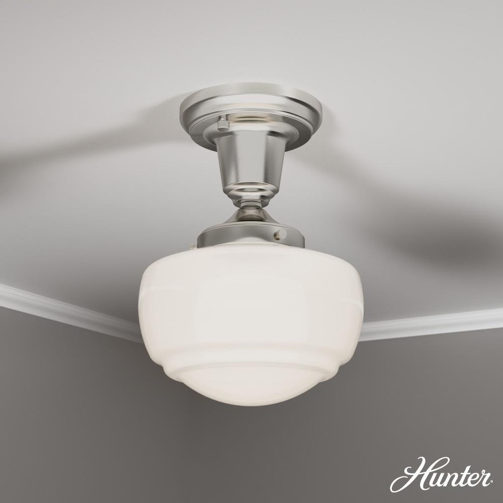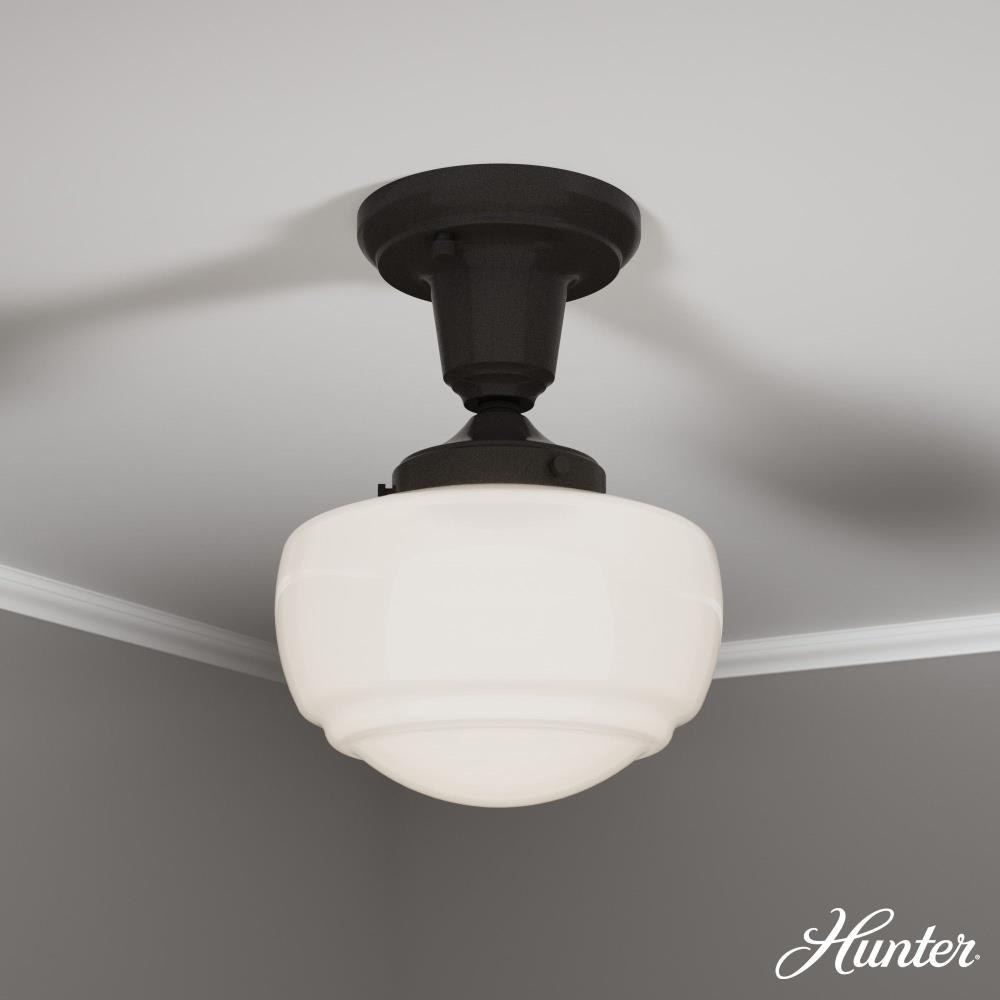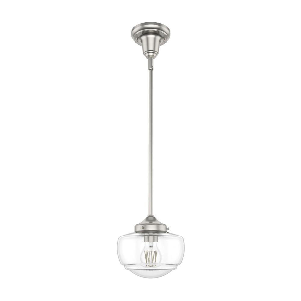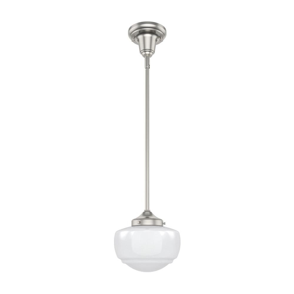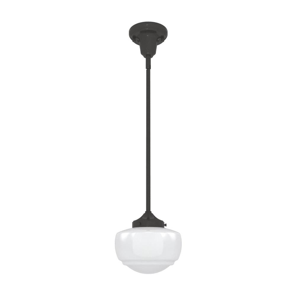 Traditional design. Elevated elements. The Saddle Creek mini pendant draws inspiration from the iconic American schoolhouse light but adds an updated touch with subtle detailing in the glass shade. For those who want all-in-one light fixtures, this schoolhouse-inspired mini pendant can also be installed as a semi-flush mount lighting. Rated for indoor use only Requires 1 E26 bulbs. Bulbs not included. MADE FOR INDOORS: For use in indoor spaces like kitchens, bedrooms, living rooms, dining rooms, and entryways. BULB RECOMMENDATION: Maximum 60 W per light bulb or equivalent LED bulb. Bulbs not included. CUSTOMIZABLE HANGING OPTIONS: With the minimum required downrod, the hanging length is 18.25 inches. When using all of the included downrod, the maximum hanging length is 66.25 inches.