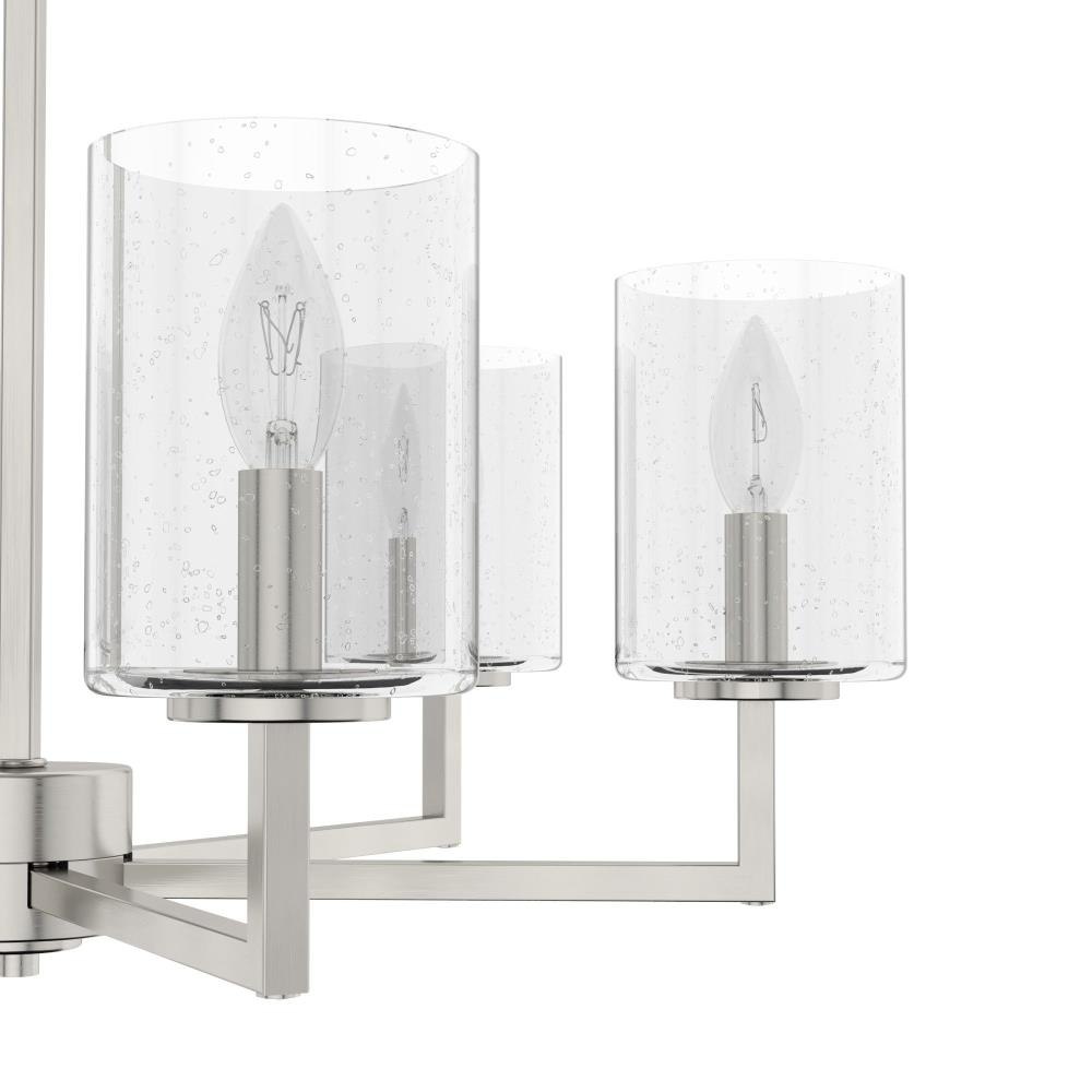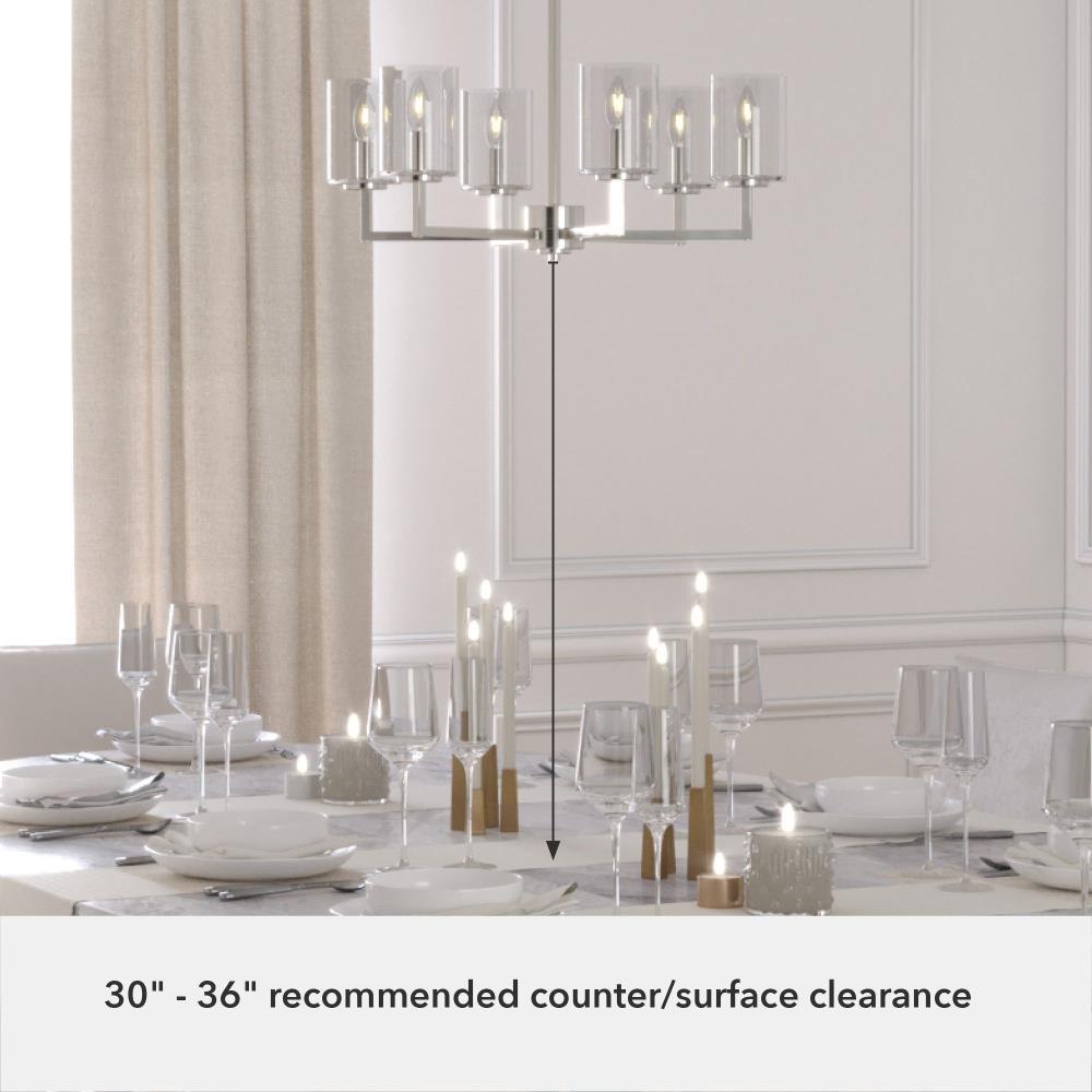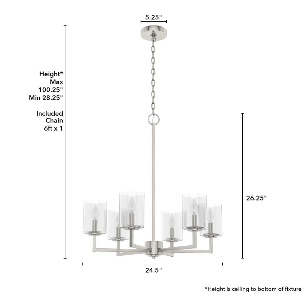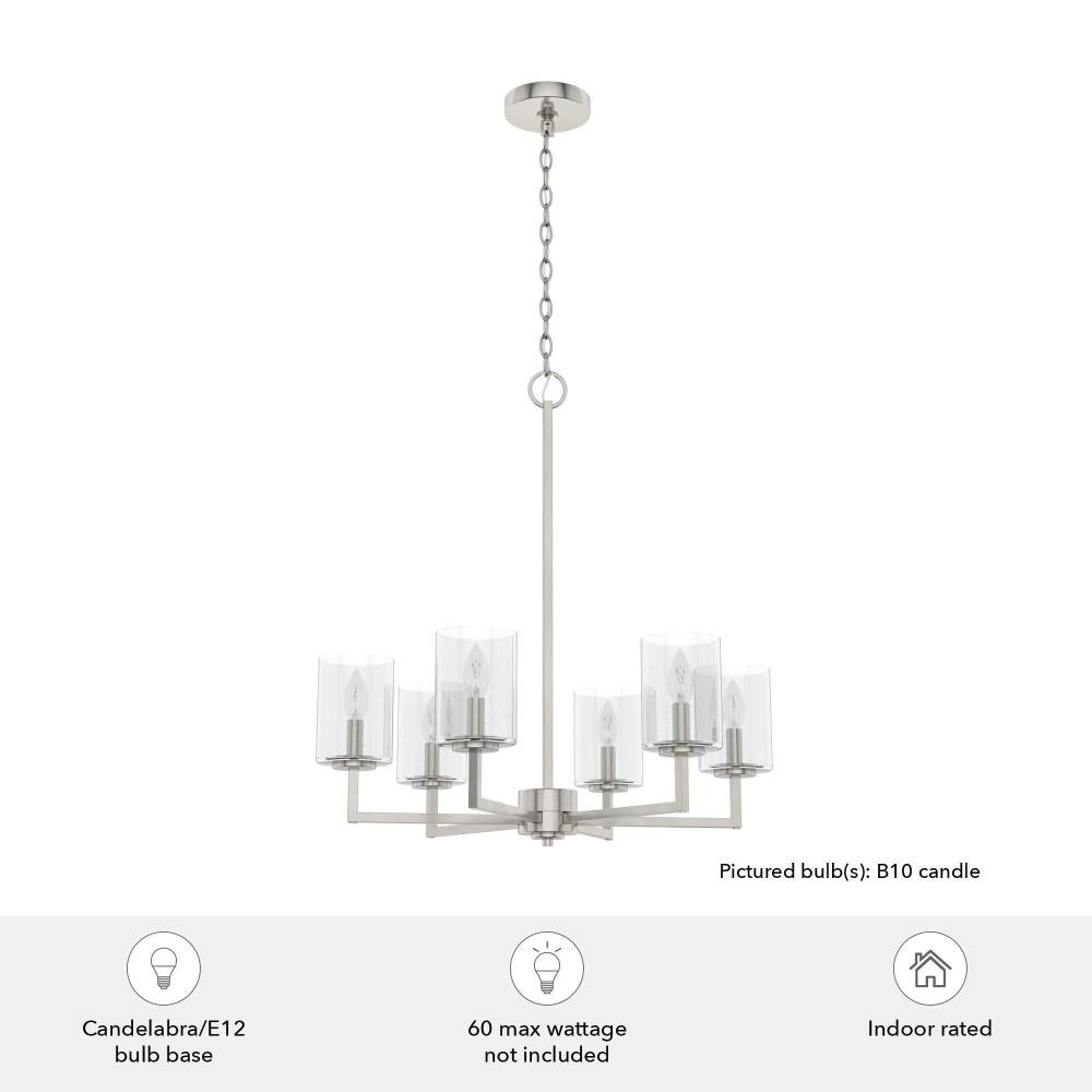 The transitional, modern style of this metal chandelier with geometric details and glass shades adds a modern grace to your space. Light up the nights as you enjoy dinner under the glow of the Kerrison chandelier. If you love modern touches, check out our whole collection of Kerrison lighting to finish all the rooms in your home. Mix and match with fans from our ceiling fan collections to fully finish your space.. Rated for indoor use only. Requires 6 E12 bulbs. Bulbs not included.. MADE FOR INDOORS: For use in indoor spaces like kitchens, bedrooms, living rooms, dining rooms, and entryways.. BULB RECOMMENDATION: Maximum 60 W per light bulb or equivalent LED bulb. Bulbs not included.. PICTURED HERE: Match our image using B10 Candle light bulbs.. CUSTOMIZABLE HANGING OPTIONS: With the minimum required chain, the hanging length is 28.25 inches. When using all of the included chain, the maximum hanging length is 100.25 inches.. WARRANTY: One-year limited warranty backed by the trusted experts at Hunter.