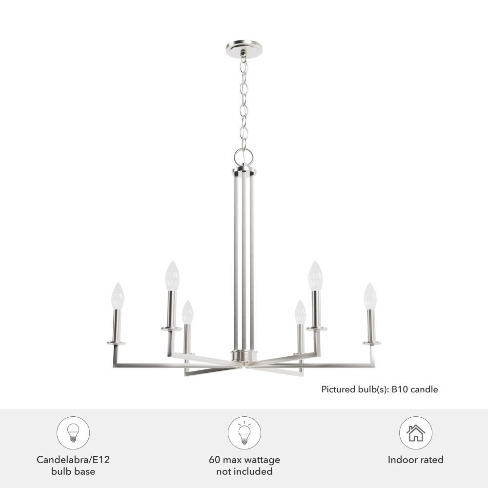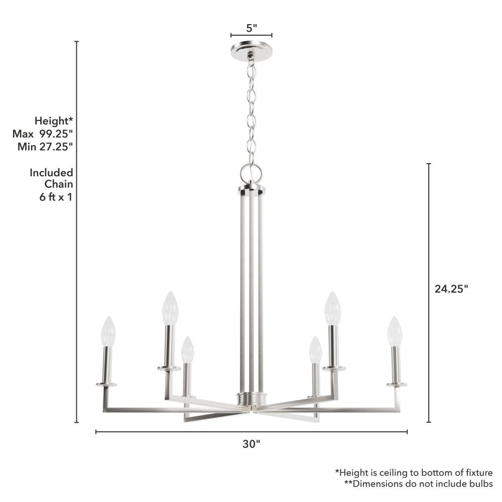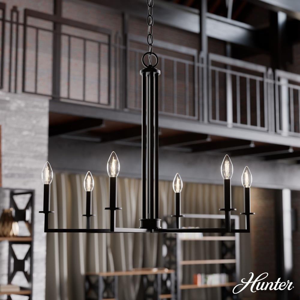 The perfect fixture for your living room, dining room, entryway or study, the Bearden chandelier coolly combines old-world elegance with industrial edge. Clean lines and crisp geometry make this chandelier an eye-catching accessory, while the fixture’s simple finish and casual charm are a match for most existing design schemes. Shine brightness through your home with the Bearden collection or find a fan that complements your decor.. Rated for indoor use only. Requires 6 E12 bulbs. Bulbs not included.. MADE FOR INDOORS: For use in indoor spaces like kitchens, bedrooms, living rooms, dining rooms, and entryways.. BULB RECOMMENDATION: Maximum 60 W per light bulb or equivalent LED bulb. Bulbs not included.. PICTURED HERE: Match our image using B10 Candle light bulbs.. CUSTOMIZABLE HANGING OPTIONS: With the minimum required chain, the hanging length is 27.25 inches. When using all of the included chain, the maximum hanging length is 99.25 inches.. WARRANTY: One-year limited warranty backed by the trusted experts at Hunter.