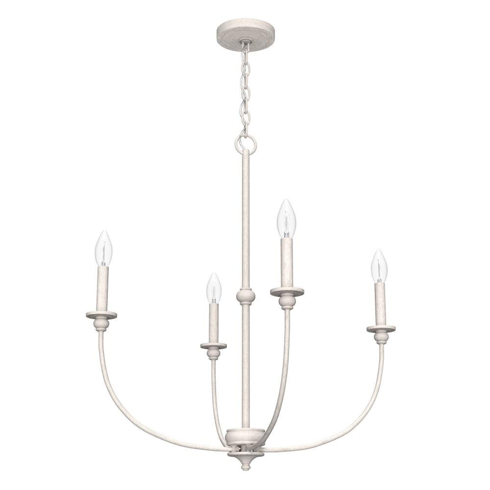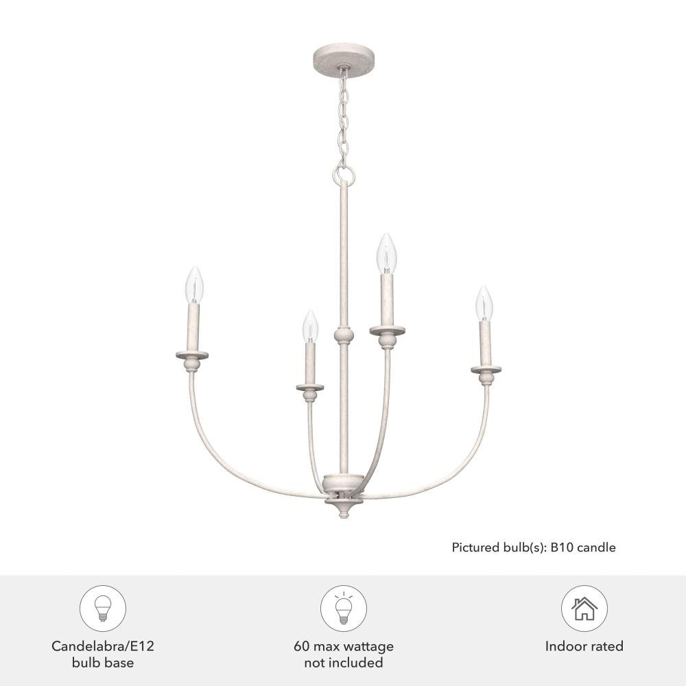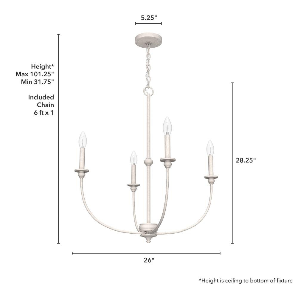 A bright balance of traditional design and modern style, the Southcrest 26 inch 4 light chandelier lends warmth to your living space while emphasizing your ceiling height. Casual enough to complement most existing aesthetics, the chandelier’s simple elegance will introduce an air of cottage charm to your décor. In larger rooms, install two fixtures side by side for a greater visual impact. Rated for indoor use only Requires 4 E12 bulbs. Bulbs not included. MADE FOR INDOORS: For use in indoor spaces like kitchens, bedrooms, living rooms, dining rooms, and entryways. BULB RECOMMENDATION: Maximum 60 W per light bulb or equivalent LED bulb. Bulbs not included. CUSTOMIZABLE HANGING OPTIONS: With the minimum required chain, the hanging length is 31.75 inches. When using all of the included chain, the maximum hanging length is 101.25 inches.