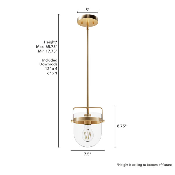 This 1-light pendant brightens any space-conscious dining table or kitchen island. Plus, its streamlined silhouette adds a sleek, modern feel to any room. Made from aluminum with a striking metallic finish, it holds a single bulb (sold separately) and its corresponding clear glass bell shade for a more traditional vibe. This pendant light hangs with the help of a height-adjustable rod and a canopy that's compatible with sloped ceilings. It also works with dimmer switches, moving you effortlessly from day to night.