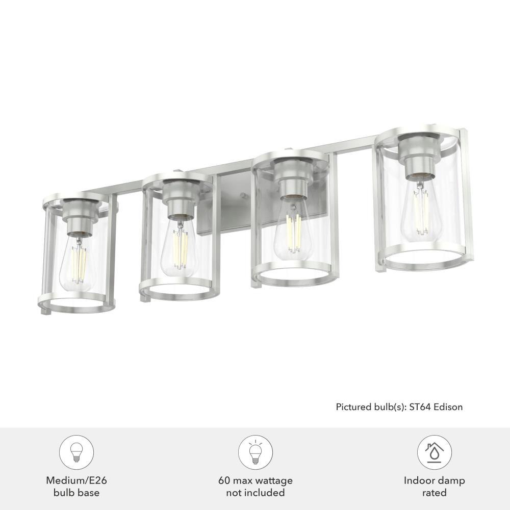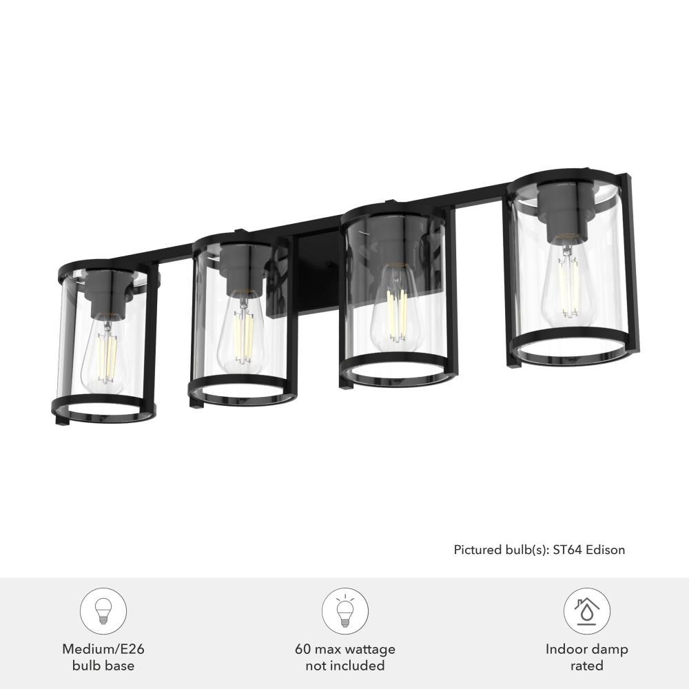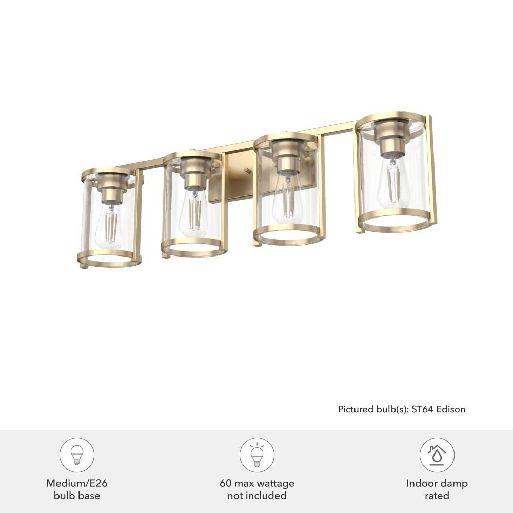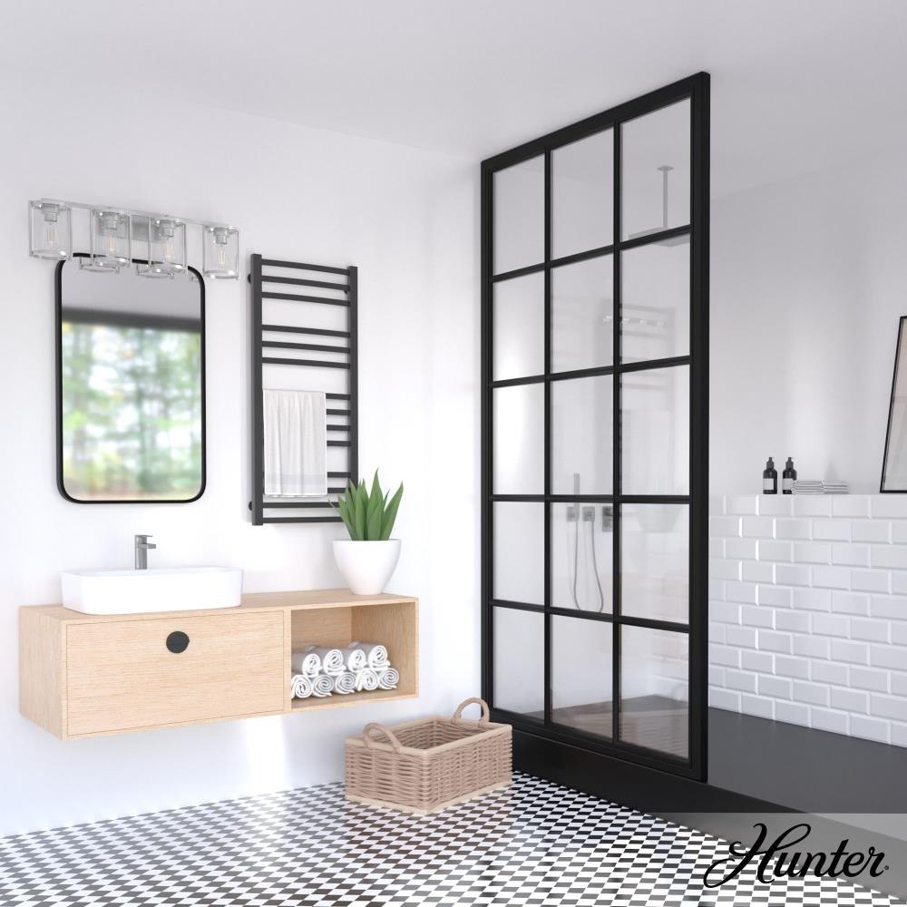 Enjoy small details on a big fixture. All the modern touches on the Astwood’s modern vanity light come together to form a memorable fixture. A part of our Astwood collection, this fixture stands out with its bold features and art deco-inspired design. Plus, its damp rating makes it a perfect addition to your moisture-prone spaces. mix andmatch with other fixtures from this collection or from our ceiling fan designs.. Rated for indoor spaces exposed to humidity. Requires 4 E26 bulbs. Bulbs not included.. INDOOR-DAMP RATED: For use in indoor spaces exposed to humidity like bathrooms and laundry rooms.. BULB RECOMMENDATION: Maximum 60 W per light bulb or equivalent LED bulb. Bulbs not included.. PICTURED HERE: Match our image using ST64 Edison light bulbs.. COORDINATING COLLECTION: Works with Astwood ceiling fan collection. WARRANTY: One-year limited warranty backed by the trusted experts at Hunter.