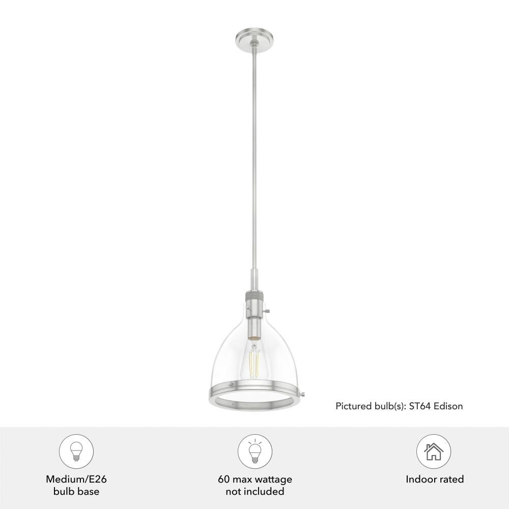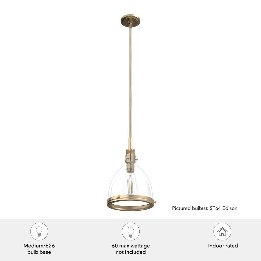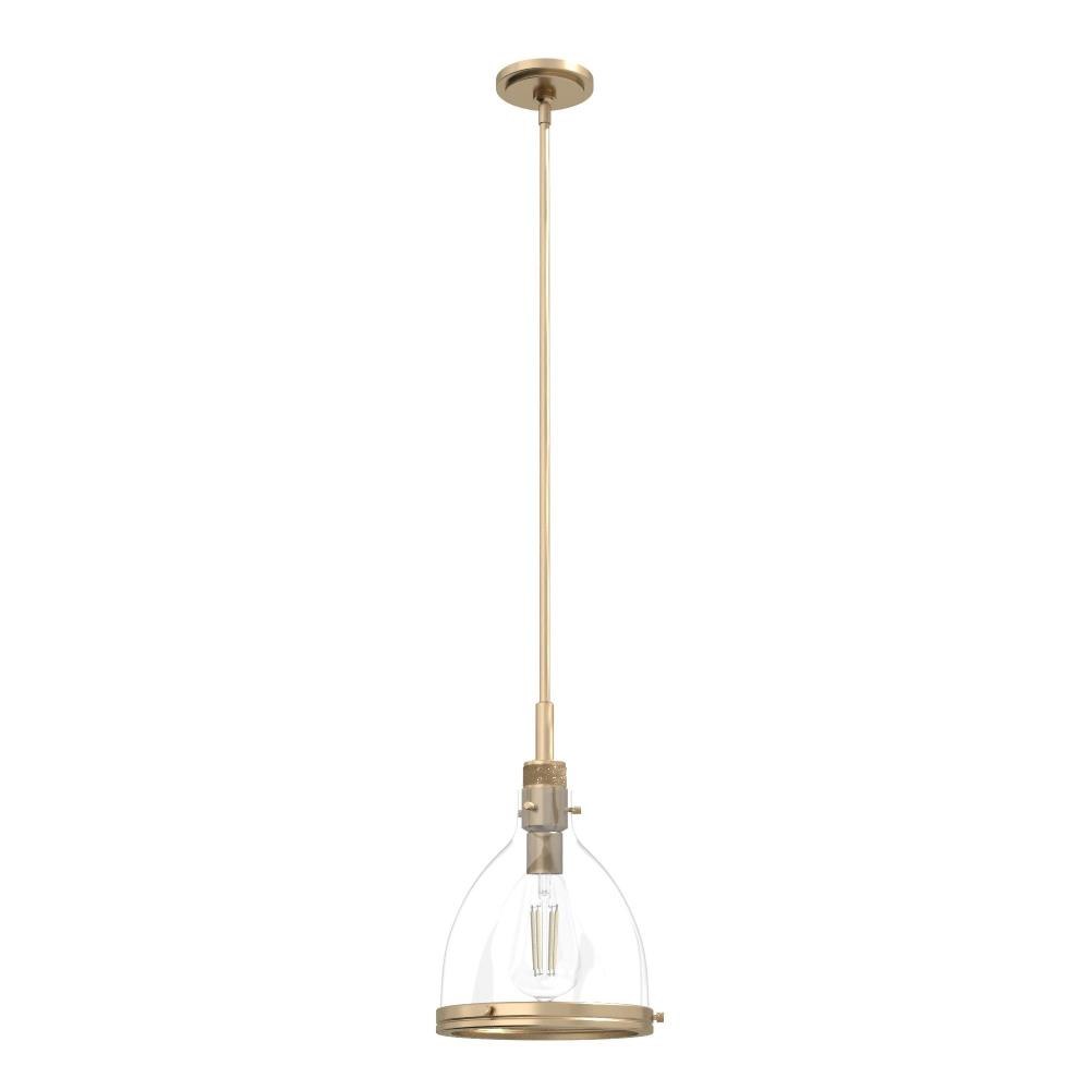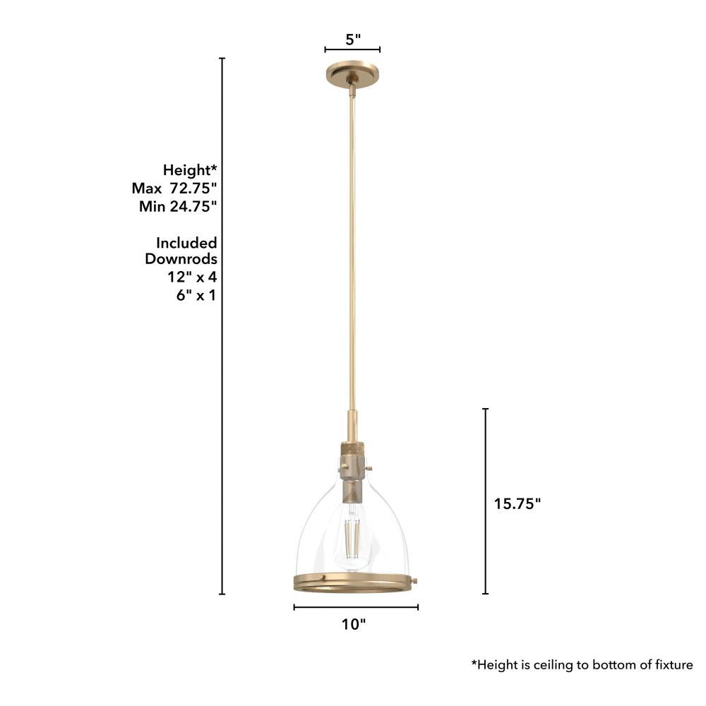 Industrial yet glamorous. The Van Nuys modern pendant light features metallic finishes that bring a luxe look to the industrial inspired detailing like the knurling and thumb screws. Uses for a small pendant light with simple form like the Van Nuys are seemingly endless, especially when paired with other fixtures from the collection.Includes one 6 inch downrod and four 12 inch downrods to allow height adjustments from 24.75 inches to 72.75 inches.Requires 1 bulb; bulb not includedMaximum wattage 60 per light bulb or equivalent LED bulbRated for indoor spaces onlyLight fixture diameter 10 inchesAlturas Gold finish