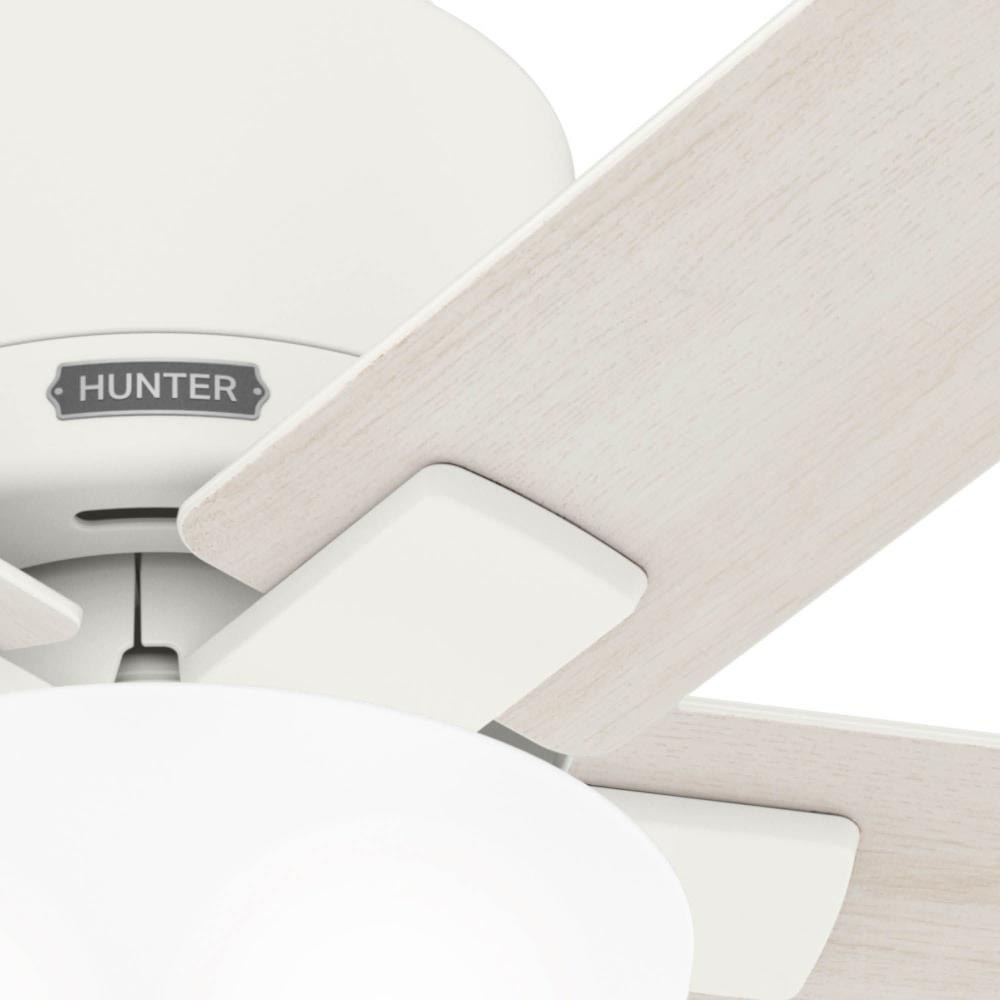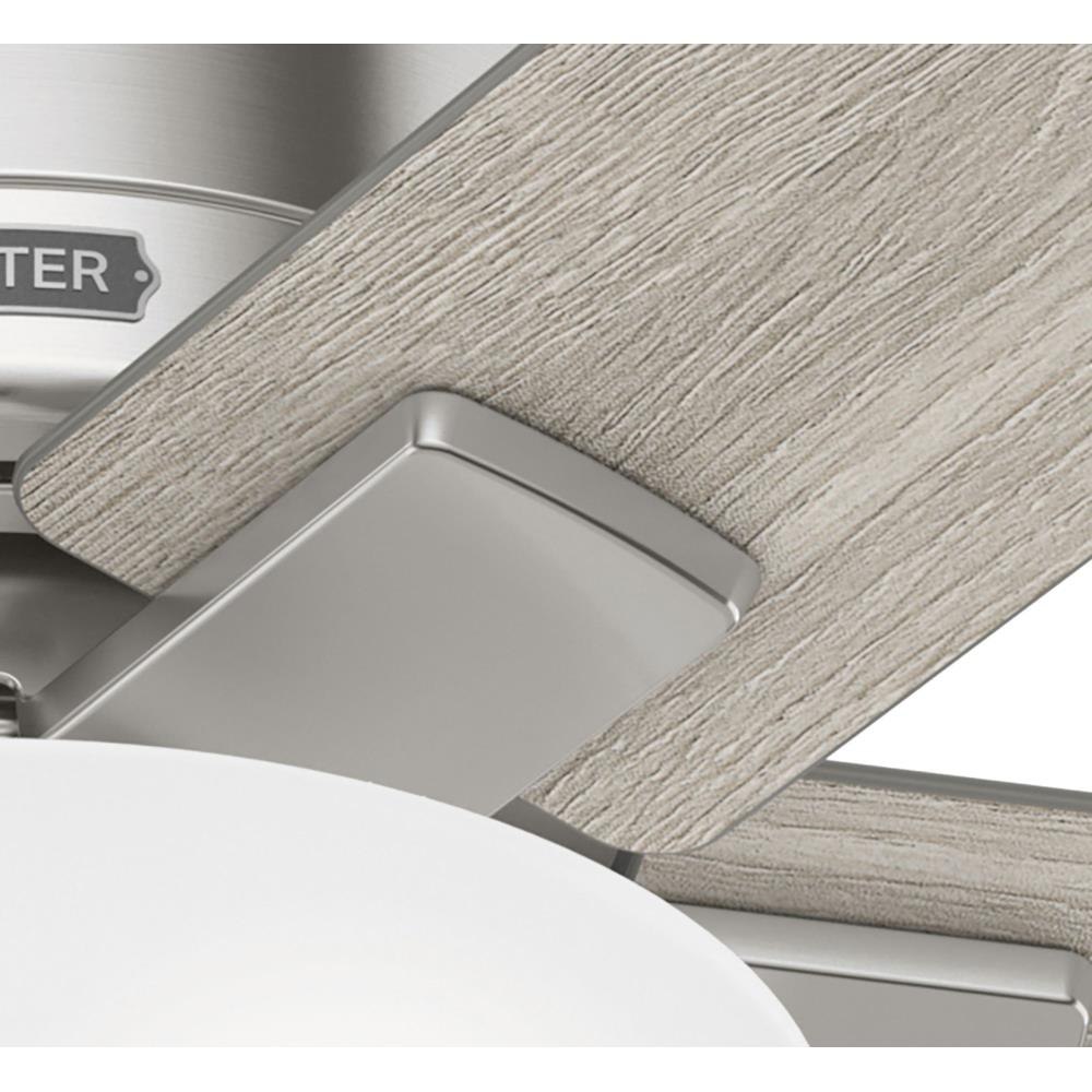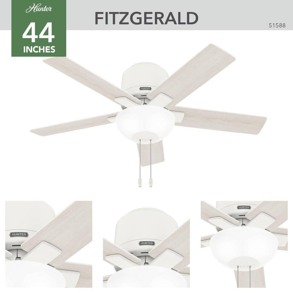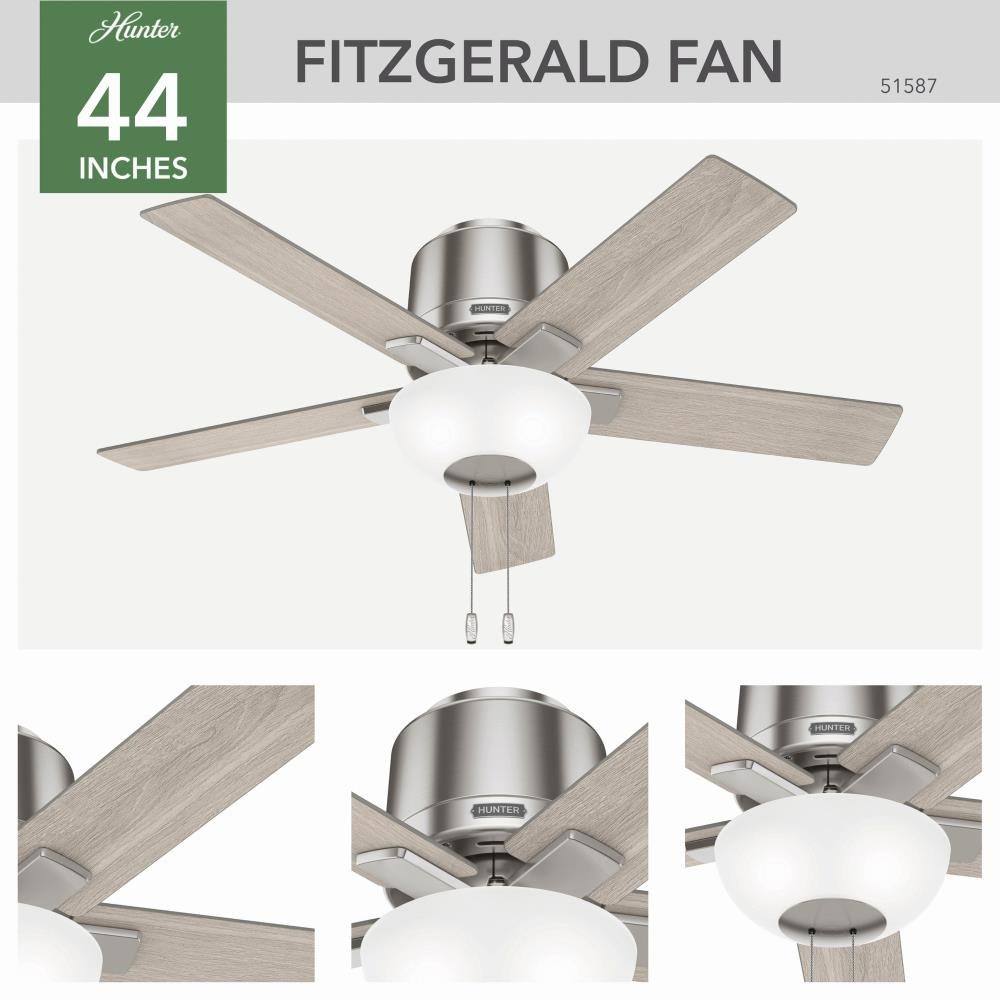 Capture attention in your small spaces. The 44-inch Fitzgerald packs style and performance into one fixture. This ceiling fans casual, modern design spruces up your favorite spaces, and our SureSpeed guarantee keeps you cool. Plus, the Fitzgeralds low profile design makes it ideal for low-clearance spaces.Exclusive SureSpeed GuaranteeRated for indoor use only3 bulbs includedPull chains includedAIRFLOW YOU FEEL: Built with our SureSpeed Guarantee to deliver over 33% higher air velocity than leading competitors* while maintaining quiet, wobble-free performance.WHISPER-QUIET MOTOR: 3-speed, WhisperWind reversible motor for optimal performance in summer and winter.SMALL ROOM FAN: Ideal size for home offices, laundry rooms, and bedrooms.LOW PROFILE MOUNTING: Designed to fit flush against ceilings less than 9 feet high.COMPATIBLE ACCESSORIES: Works with Hunter and Casablanca accessories, not including Hunter Original accessoriesWARRANTY: Limited Lifetime Motor Warranty backed by the only company with over 135 years in the fan business