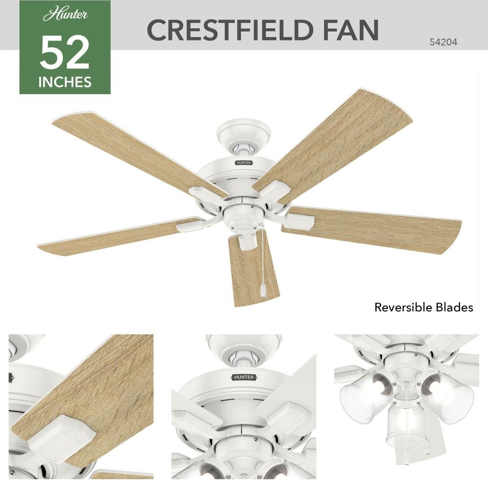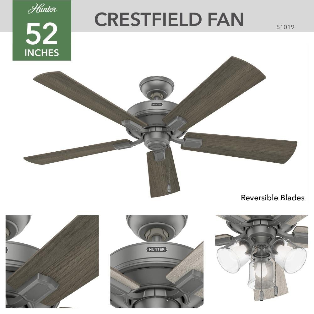 Subtle farmhouse and vintage details are seen throughout the Crestfield rustic ceiling fan. The Crestfield ceiling fan includes snap-on blades for easy installation. Featuring a three-speed motor and energy-efficient LED light bulbs, the Crestfield collection comes in a variety of sizes and finishes to allow you to customize the look of your indoor spaces while maintaining a consistent style throughout your home.