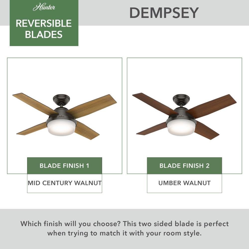 A contemporary fan with mass appeal, the Dempsey will fit flawlessly in your homes modern interior design. The beautiful, clean finish options work together with the high contrast of angles throughout the design to create a look that will keep your space looking current and inspired. Fully-dimmable, energy-efficient LED bulbs give you total control over your lighting, while the 44-inch blade span is ideal for small rooms. We have a full collection of Dempsey fans so you can maintain a consistent look while tailoring the size and features to each room in your house.