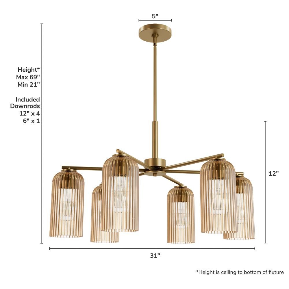 Infuse your dining room with luxury using the Beverly Glen 6 Light Chandelier from the Jasmine Roth Collection. Featuring a luxurious gold finish and plated, high-quality, scratch-resistant amber glass shades with trending ribbed glass, this chandelier exudes dining room glam with its stunning presence. Its formal modern design seamlessly blends classic elegance and modern sophistication, making it a perfect fit for any décor. Illuminate your space with warm, inviting light and add a touch of refined charm to your home. The Beverly Glen Chandelier is a statement piece that enhances your dining experience.