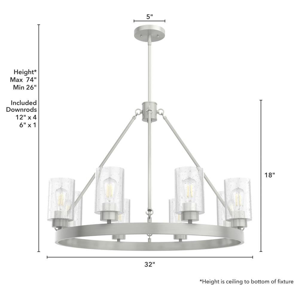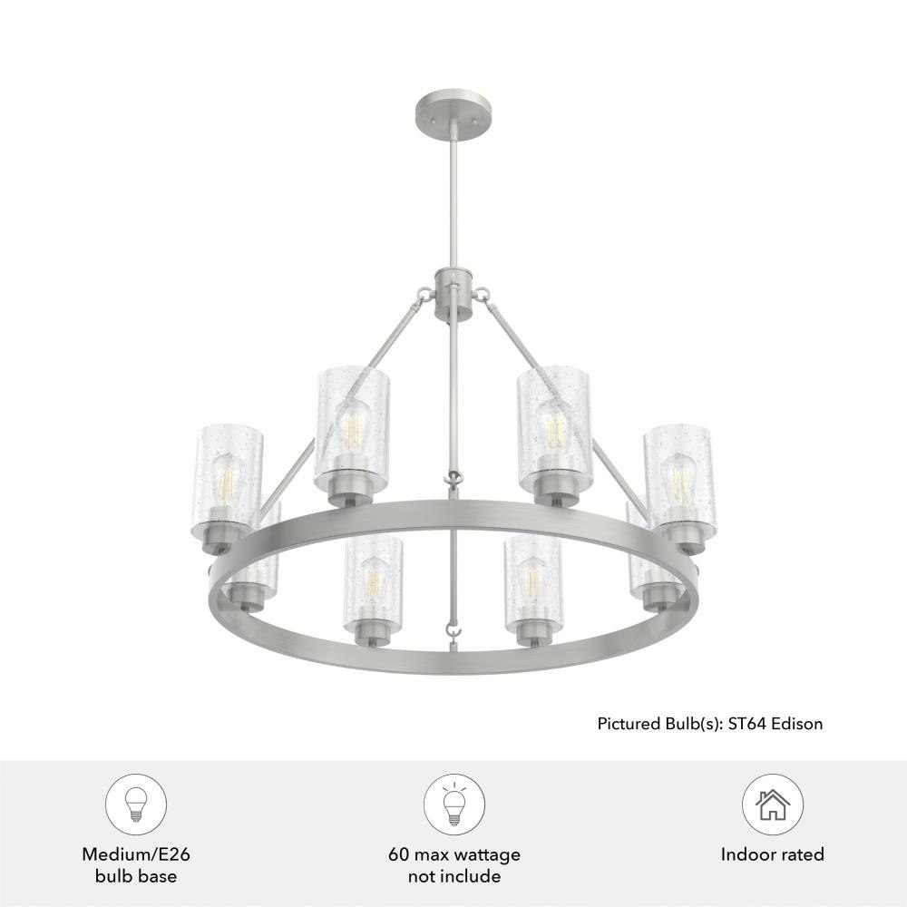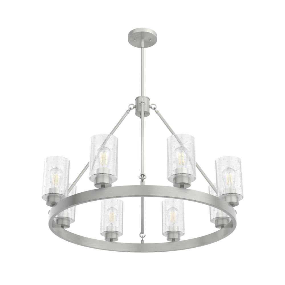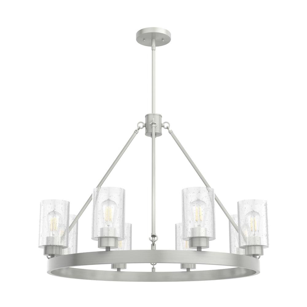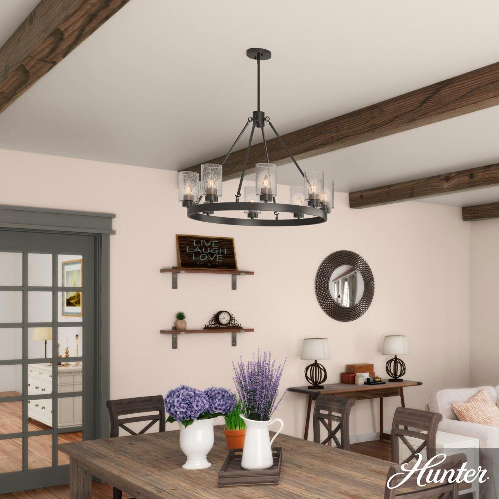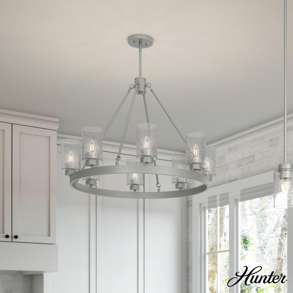 A revised classic design with statement-making elements. The Hartland round chandeliers showcase feature is the clear seeded glass shades. Relish the way the glass catches the light and sparkles in a beautiful effect with this 8-light chandelier. The textured glass and strong lines in this round chandelier make for a perfect finishing touch in your space.Coordinates with our Hartland ceiling fan collectionMounting system compatible with sloped or angled ceilingsOne 6 inch downrod and four 12 inch downrods allow height adjustments from 30.6 to 78.6 inches.Requires 8 bulbs; bulbs not includedMaximum wattage 60 per light bulb or equivalent LED bulbRated for indoor spaces onlyLight fixture diameter 32 inchesUL Listing ensures the safety and longevity of Hunter lighting products under normal wear and tear with everyday use.Clean with soft, dry cloth; no harsh chemicals or abrasive cleaning materials.