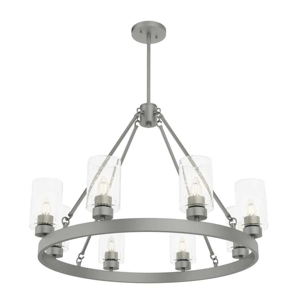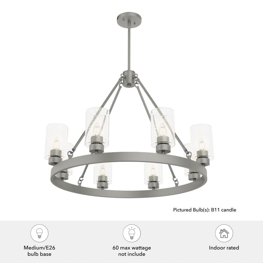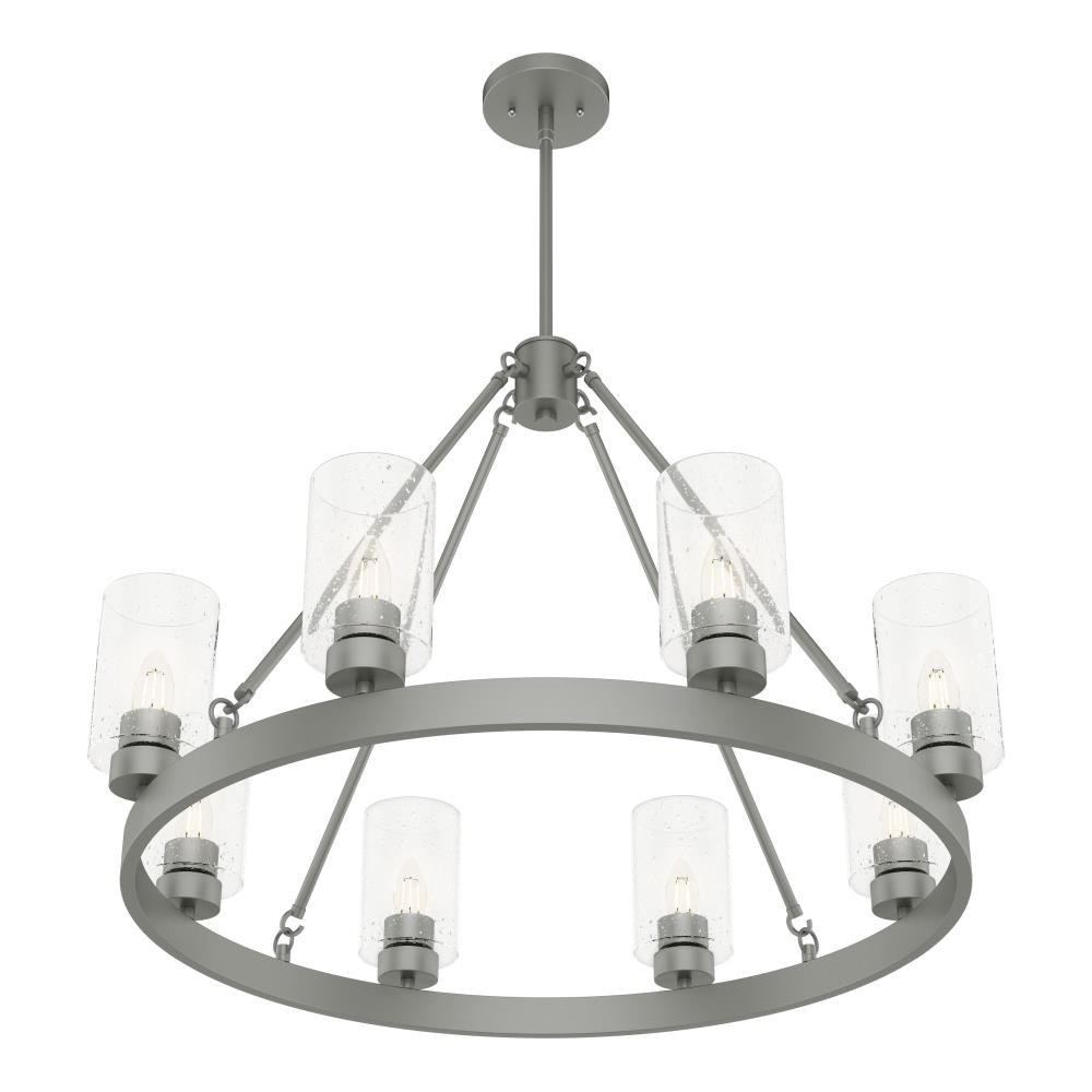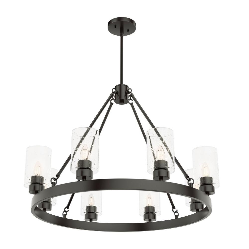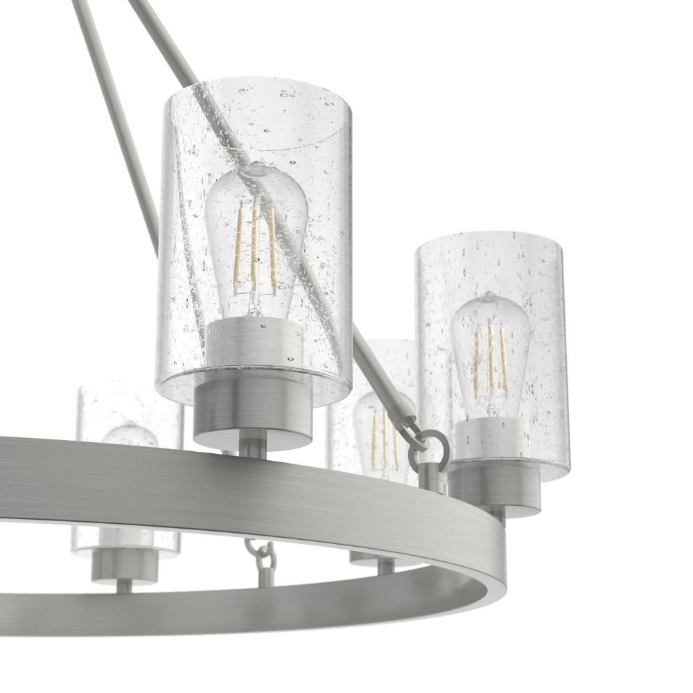 A revised classic design with statement-making elements. The Hartland round chandeliers showcase feature is the clear seeded glass shades. Relish the way the glass catches the light and sparkles in a beautiful effect with this 8-light chandelier. The textured glass and strong lines in this round chandelier make for a perfect finishing touch in your space.Coordinates with our Hartland ceiling fan collectionMounting system compatible with sloped or angled ceilingsOne 6 inch downrod and four 12 inch downrods allow height adjustments from 30.6 to 78.6 inches.Requires 8 bulbs; bulbs not includedMaximum wattage 60 per light bulb or equivalent LED bulbRated for indoor spaces onlyLight fixture diameter 32 inchesUL Listing ensures the safety and longevity of Hunter lighting products under normal wear and tear with everyday use.Clean with soft, dry cloth; no harsh chemicals or abrasive cleaning materials.