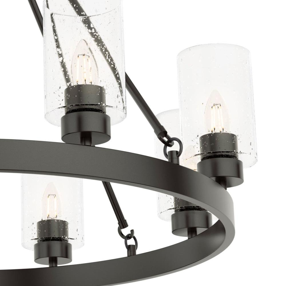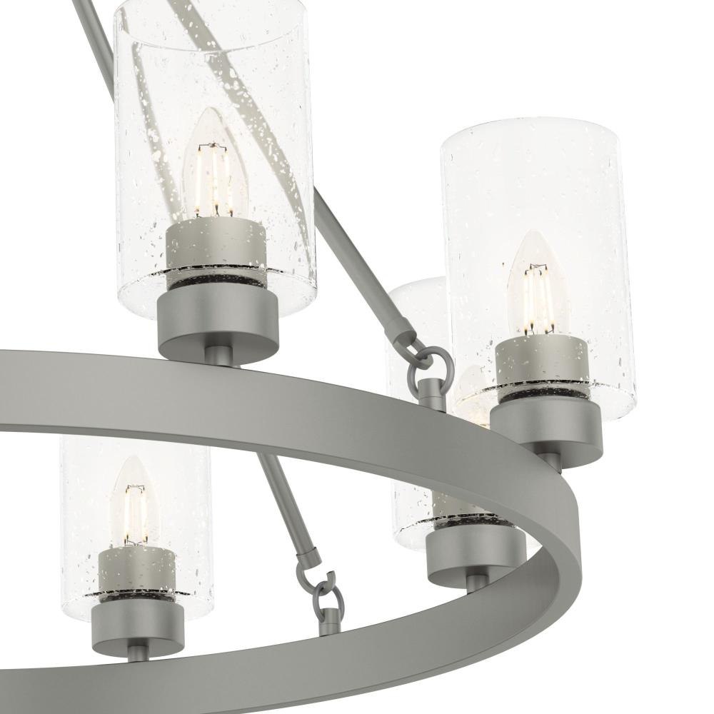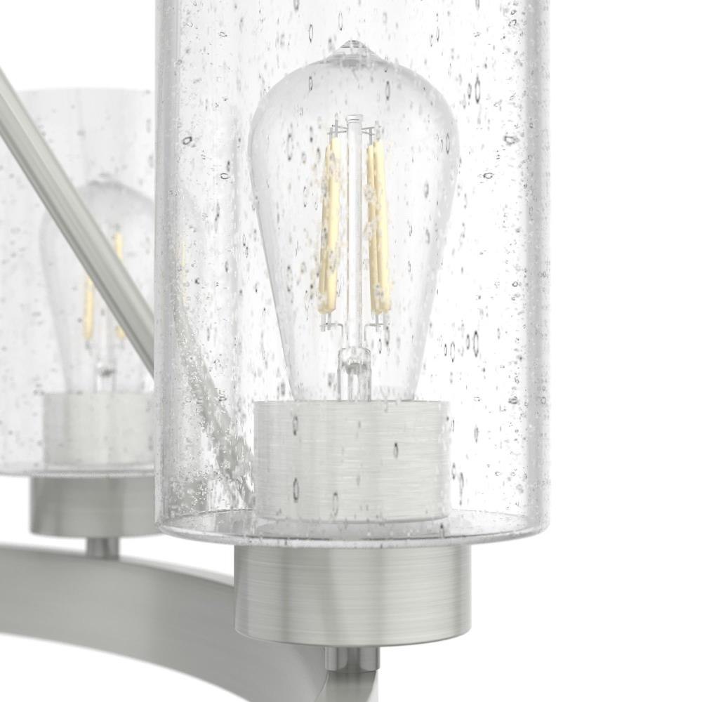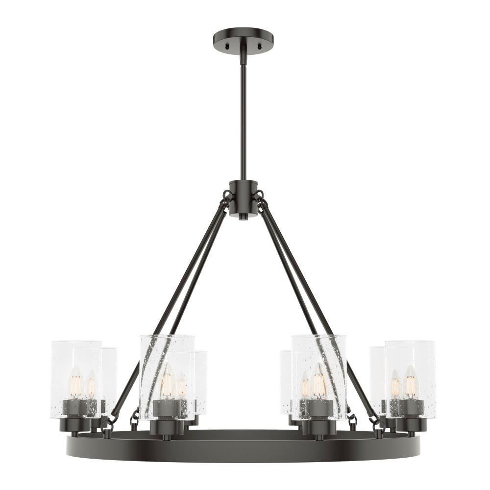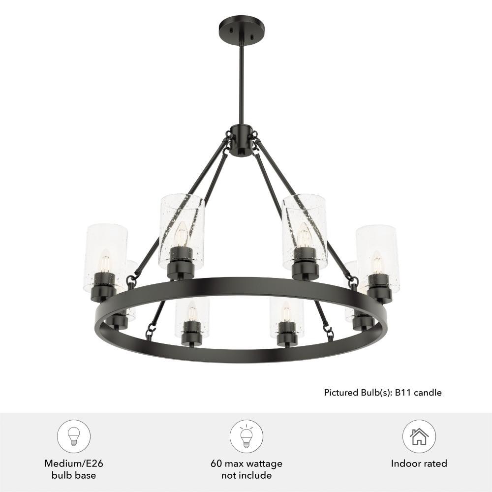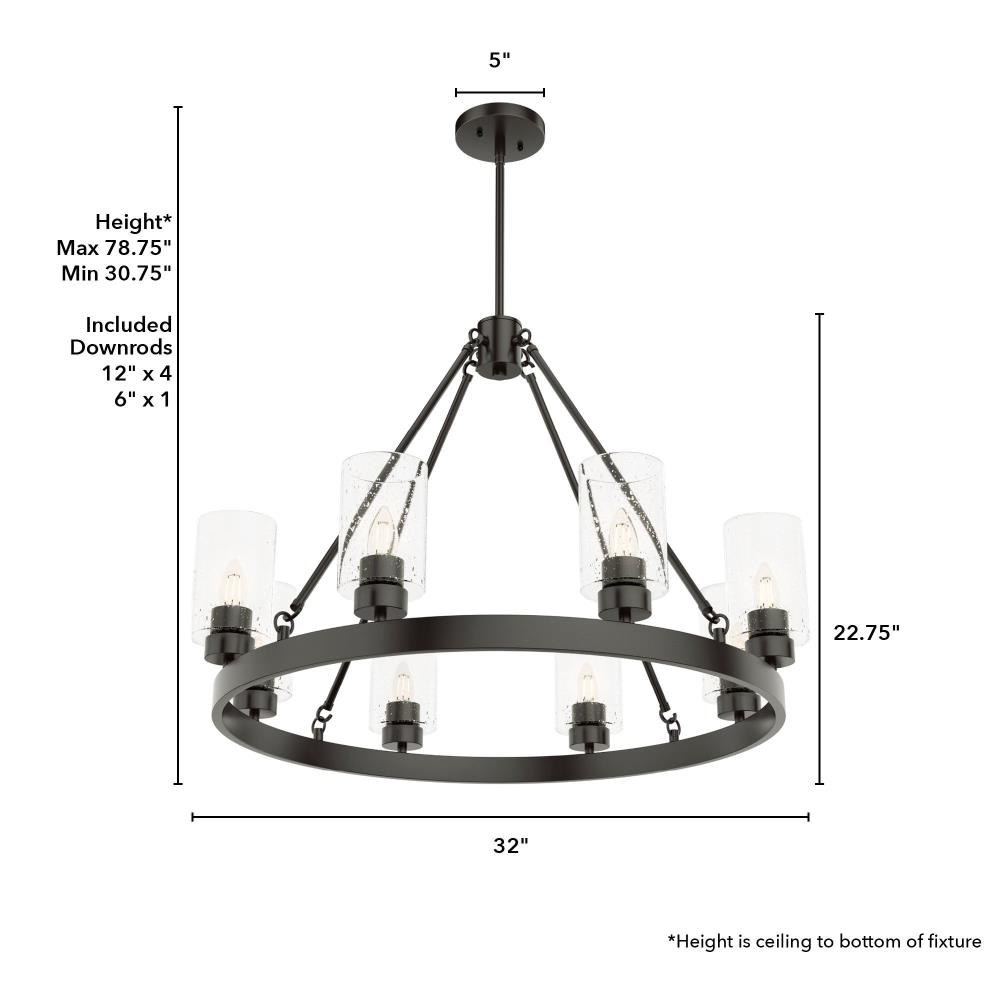 A revised classic design with statement-making elements. The Hartland round chandeliers showcase feature is the clear seeded glass shades. Relish the way the glass catches the light and sparkles in a beautiful effect with this 8-light chandelier. The textured glass and strong lines in this round chandelier make for a perfect finishing touch in your space.Coordinates with our Hartland ceiling fan collectionMounting system compatible with sloped or angled ceilingsOne 6 inch downrod and four 12 inch downrods allow height adjustments from 30.6 to 78.6 inches.Requires 8 bulbs; bulbs not includedMaximum wattage 60 per light bulb or equivalent LED bulbRated for indoor spaces onlyLight fixture diameter 32 inchesUL Listing ensures the safety and longevity of Hunter lighting products under normal wear and tear with everyday use.Clean with soft, dry cloth; no harsh chemicals or abrasive cleaning materials.