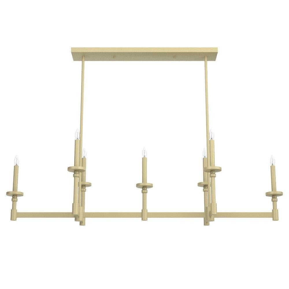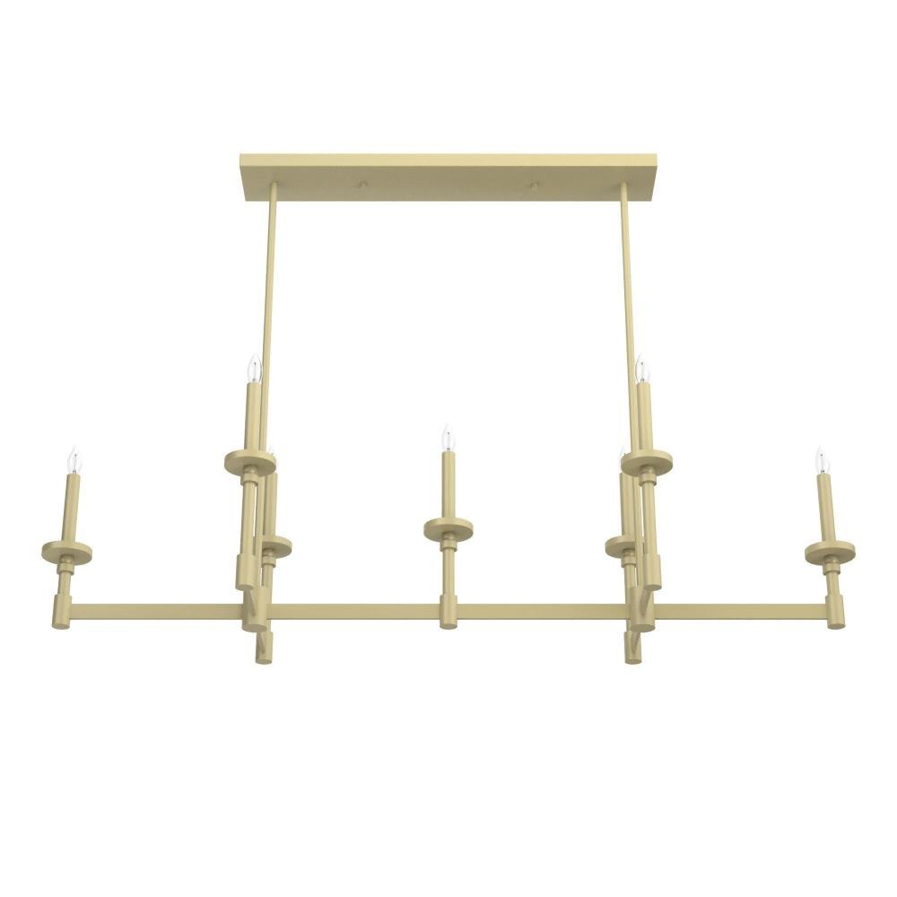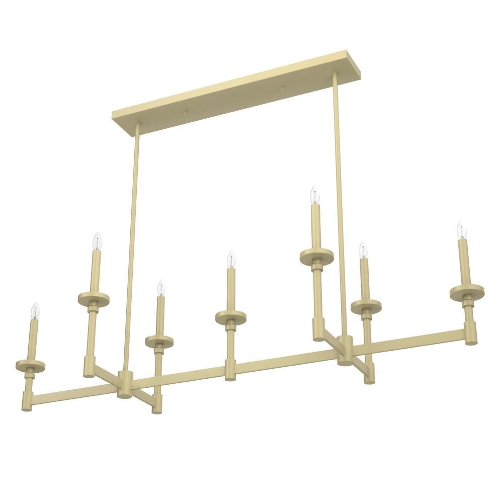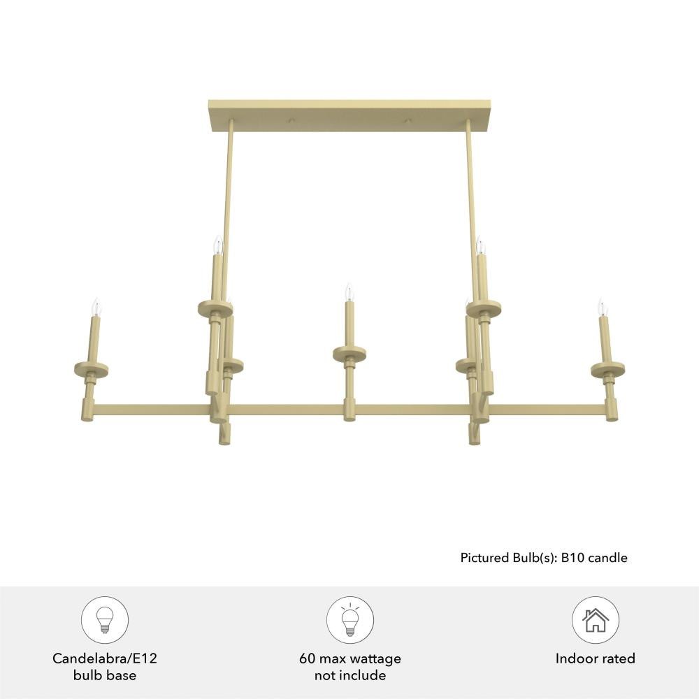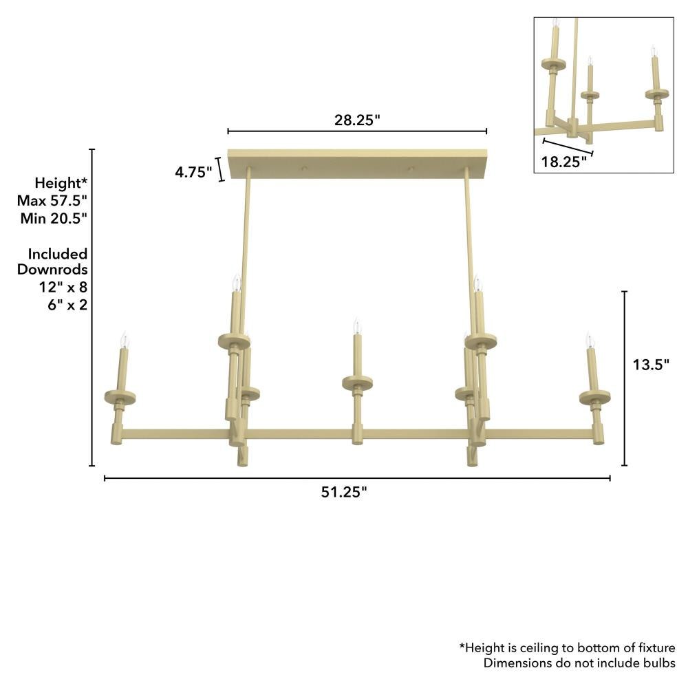 Minimal yet dramatic. The Briargrove linear chandelier features simple lines but the layered lights create a striking composition. Its an updated and modern take on the spindle chandelier. With ample opportunity for light, this 7-light linear chandelier makes a statement in any space.Two 6 inch downrods and eight 12 inch downrods allow height adjustments from 20.5 to 57.5 inchesRequires 7 bulbs; bulbs not includedMaximum wattage 60 per light bulb or equivalent LED bulbRated for indoor spaces onlyLight fixture diameter 18.25 inchesModern Brass finishUL Listing ensures the safety and longevity of Hunter lighting products under normal wear and tear with everyday use.Clean with soft, dry cloth; no harsh chemicals or abrasive cleaning materials.1 year limited Warranty