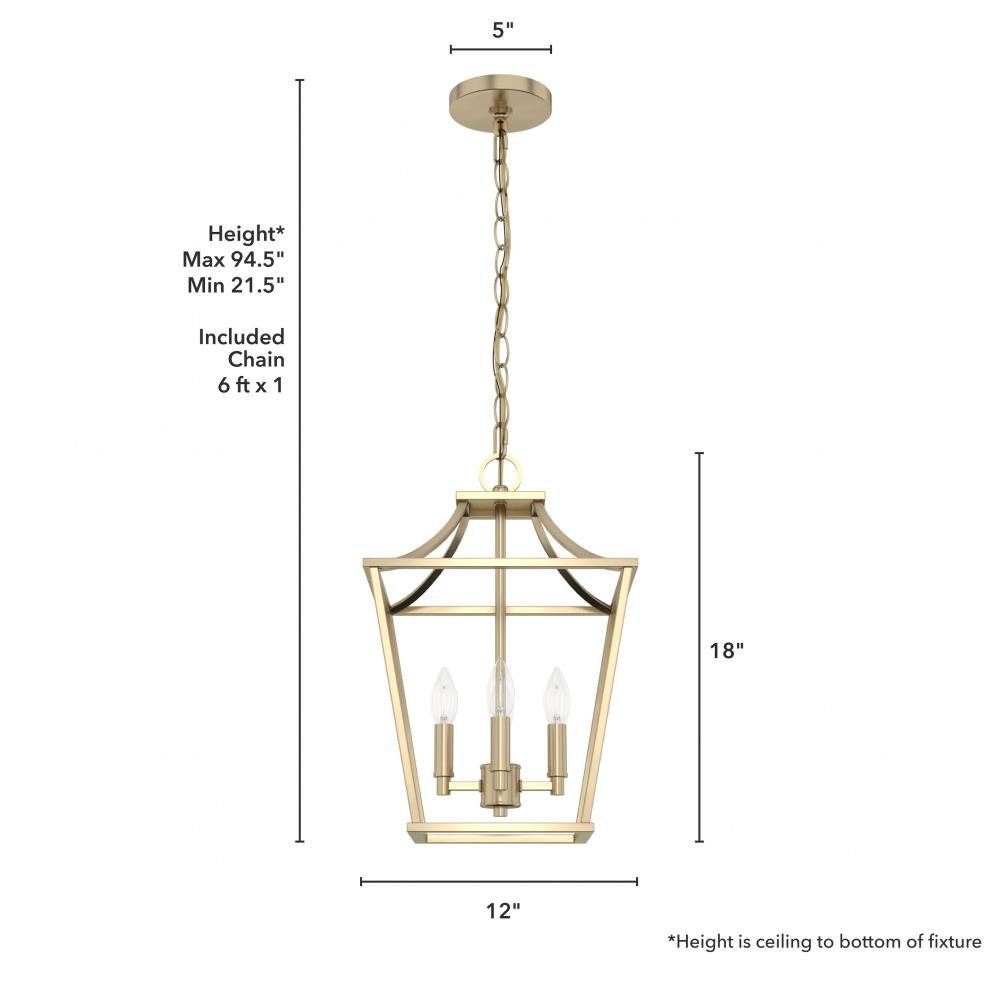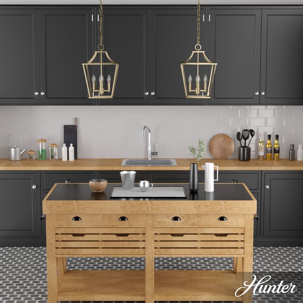 Modern and elegant, the Laurel Ridge 12-inch lantern inspired pendant lights open design adds softness to a form featuring strong lines. An updated take on traditional Georgian style silhouettes, the Laurel Ridge Collection is a fresh look in formal spaces.Rated for indoor use onlyRequires 4 E12 bulbs. Bulbs not included.MADE FOR INDOORS: For use in indoor spaces like kitchens, bedrooms, living rooms, dining rooms, and entryways.BULB RECOMMENDATION: Maximum 60 W per light bulb or equivalent LED bulb. Bulbs not included.PICTURED HERE: Match our image using B10 Candle light bulbs.CUSTOMIZABLE HANGING OPTIONS: With the minimum required chain, the hanging length is 21.5 inches. When using all of the included chain, the maximum hanging length is 94.5 inches.WARRANTY: One-year limited warranty backed by the trusted experts at Hunter.