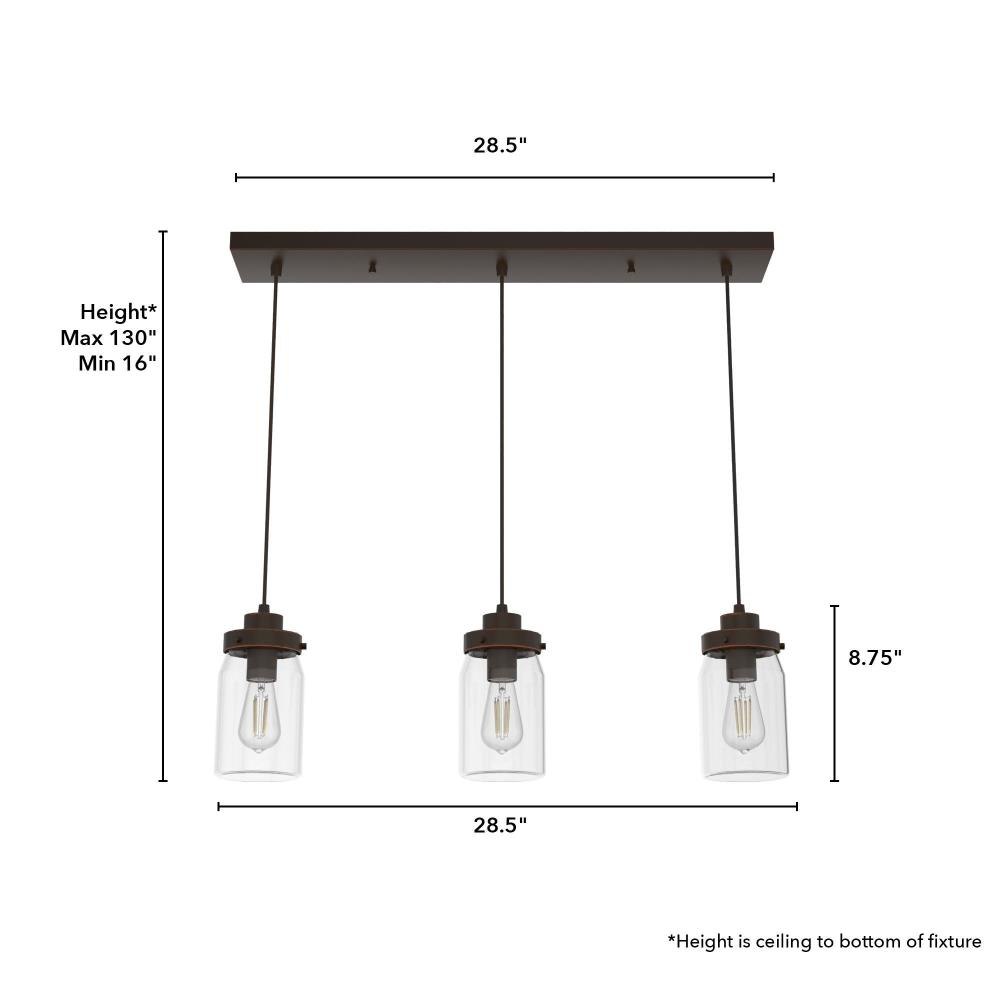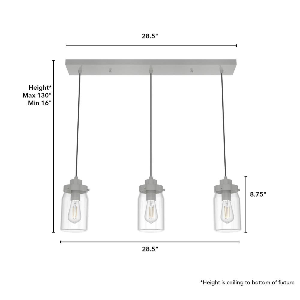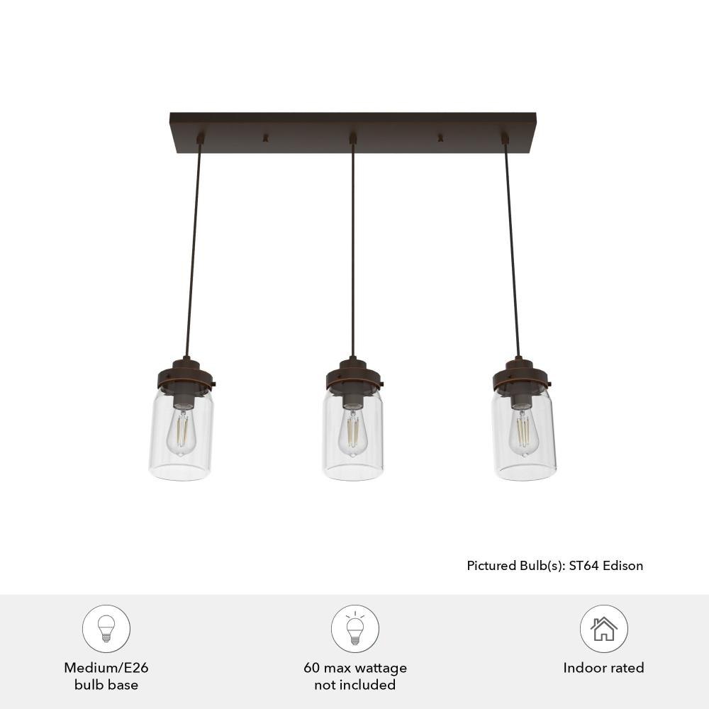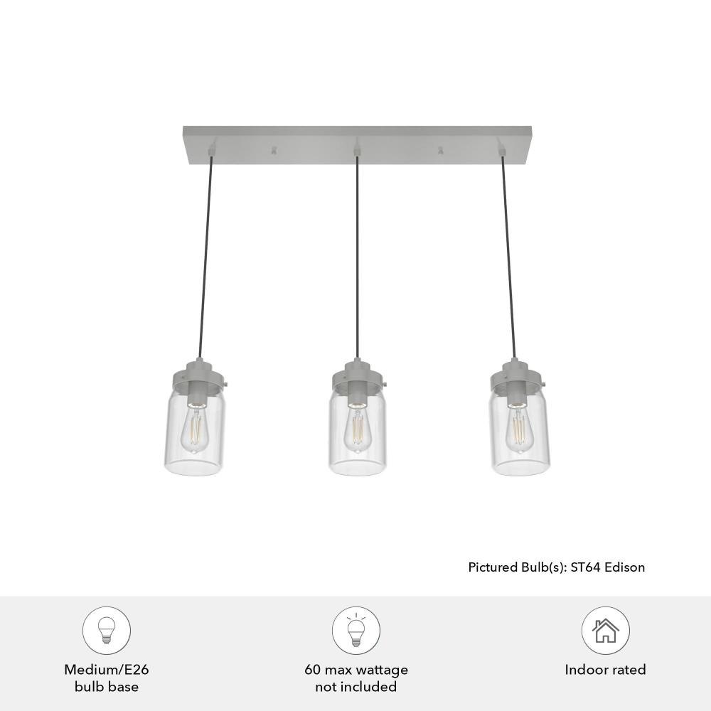 Subtle rustic detailing perfect for farmhouse spaces. Ball jar inspired glass shades on the Devon Park 3-light linear cluster light complete the look of coastal and farmhouse style spaces. Tailor the look for your space by varying the height of the mini pendant lights to fit your needs and style.Coordinates with our Devon Park ceiling fan collection.Mounting system designed for nonsloped ceilings.The adjustable cord length allows for height adjustments from 16 to 130 inches.Requires 3 E26 base bulbs; bulbs not included.Maximum wattage 60 per light bulb or equivalent LED bulbCan be fully dimmable when used with dimmable bulbs and compatible dimmer switch (sold seperately).UL Listing ensures the safety and longevity of Hunter lighting products under normal wear and tear with everyday use.Clean with soft, dry cloth; no harsh chemicals or abrasive cleaning materials.Rated for indoor, dry spaces only.