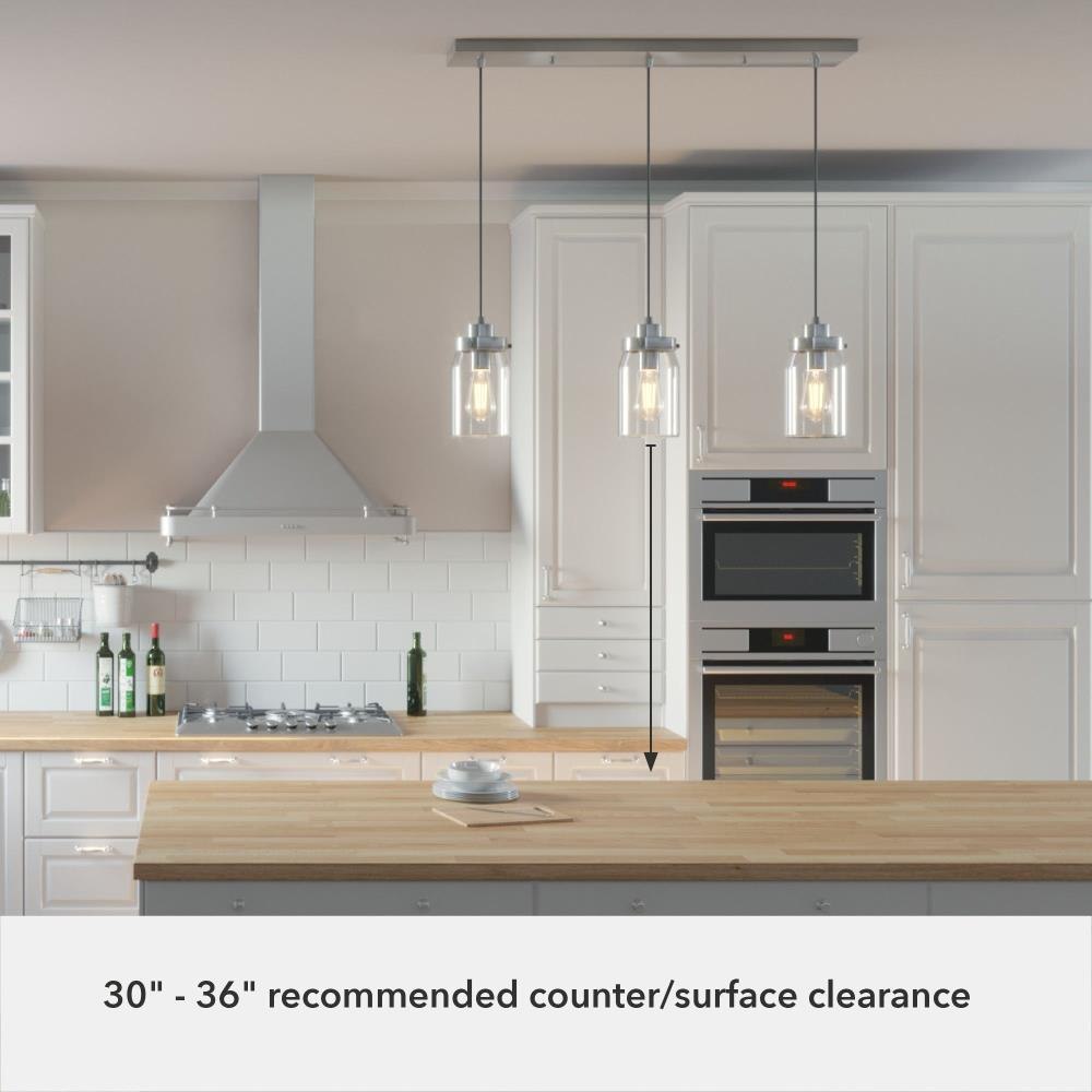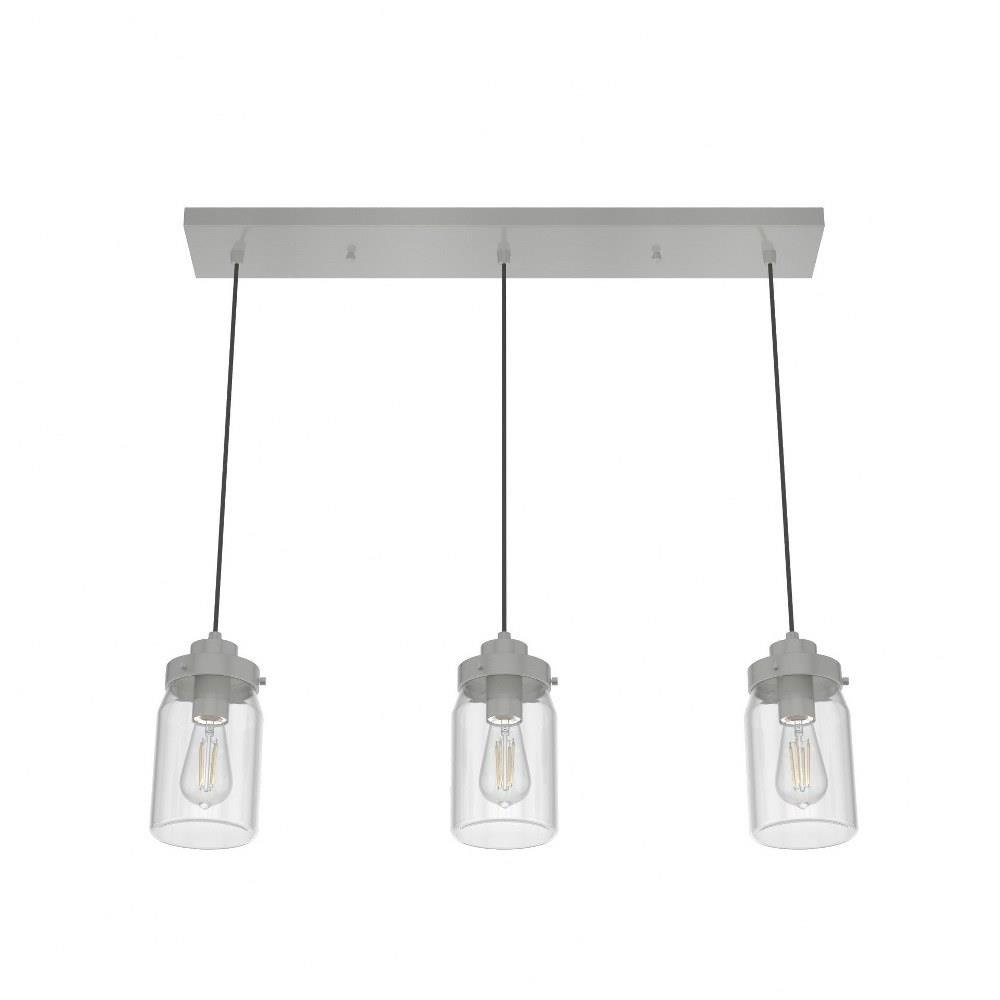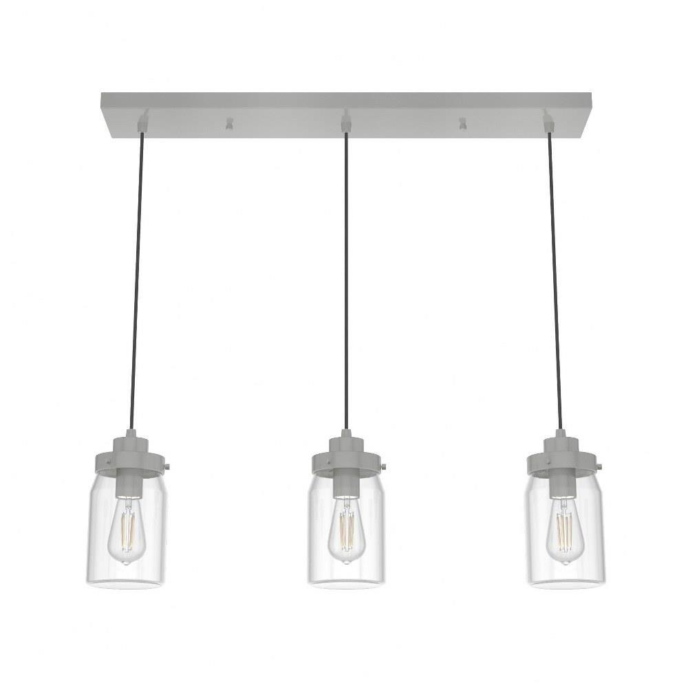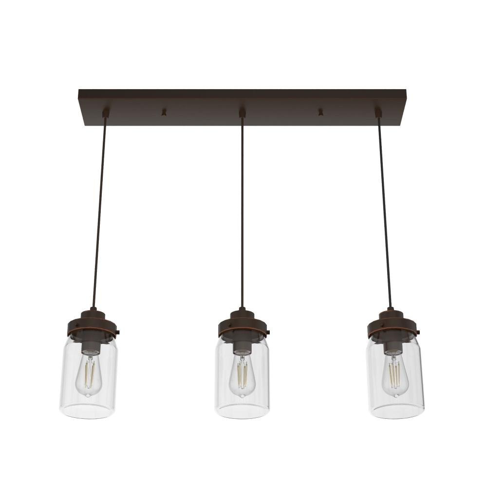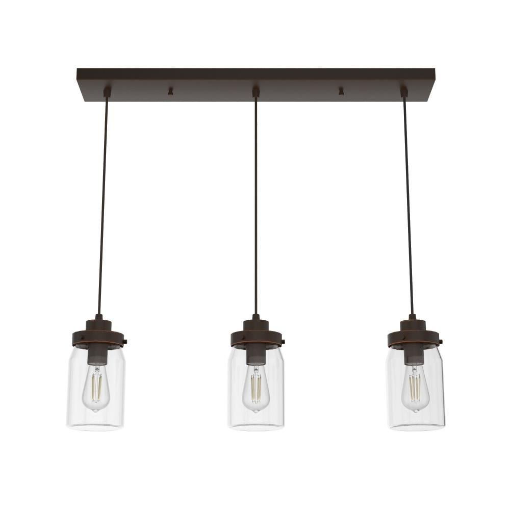 Subtle rustic detailing perfect for farmhouse spaces. Ball jar inspired glass shades on the Devon Park 3-light linear cluster light complete the look of coastal and farmhouse style spaces. Tailor the look for your space by varying the height of the mini pendant lights to fit your needs and style.Coordinates with our Devon Park ceiling fan collection.Mounting system designed for nonsloped ceilings.The adjustable cord length allows for height adjustments from 16 to 130 inches.Requires 3 E26 base bulbs; bulbs not included.Maximum wattage 60 per light bulb or equivalent LED bulbCan be fully dimmable when used with dimmable bulbs and compatible dimmer switch (sold seperately).UL Listing ensures the safety and longevity of Hunter lighting products under normal wear and tear with everyday use.Clean with soft, dry cloth; no harsh chemicals or abrasive cleaning materials.Rated for indoor, dry spaces only.