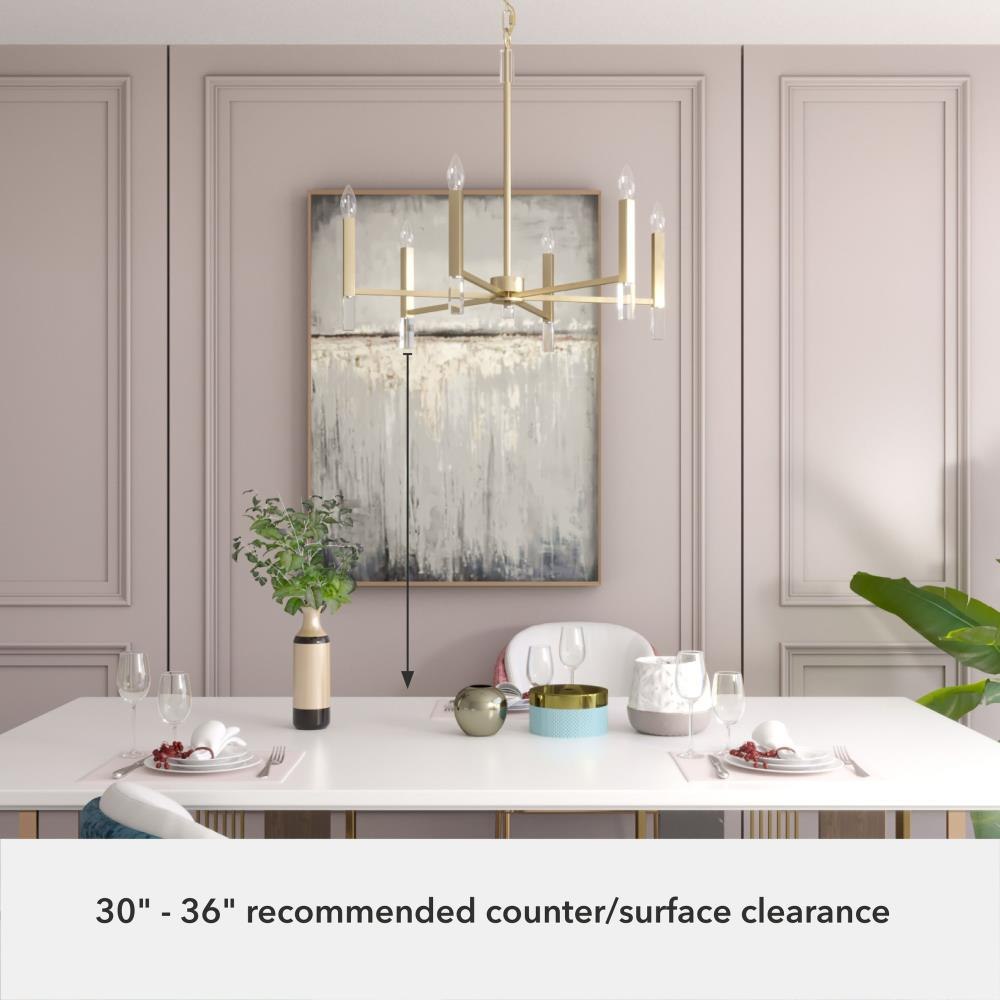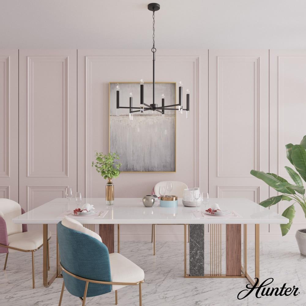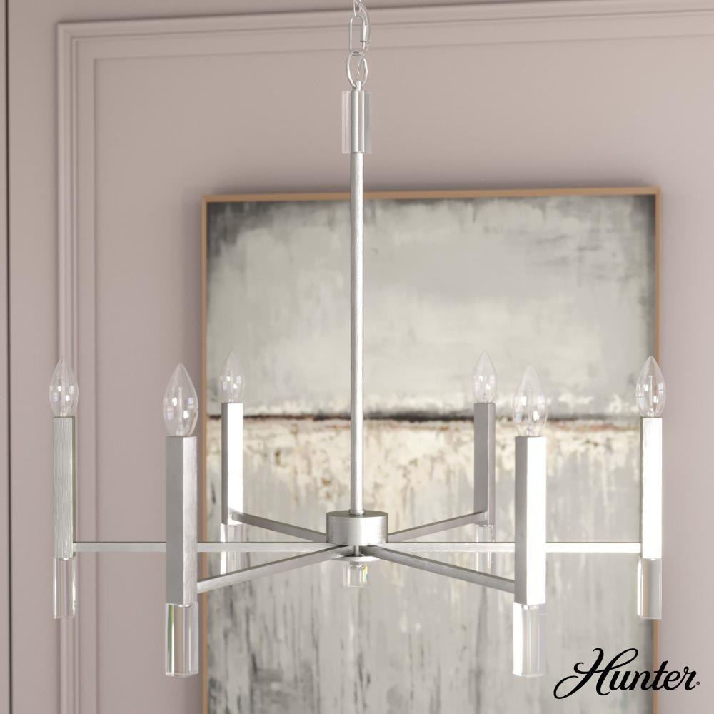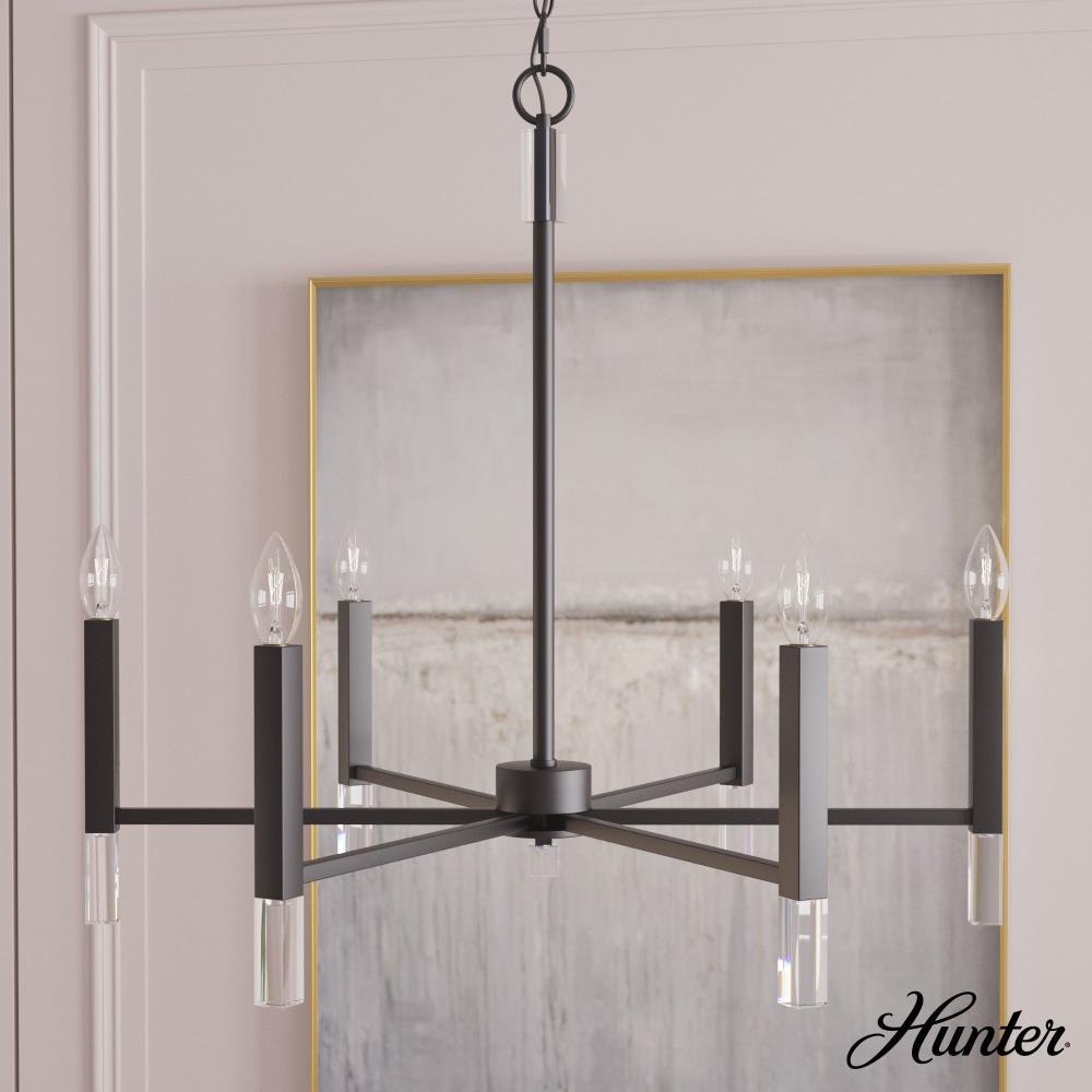 Your guests will be drawn to the beauty of the Sunjai 6 light chandelier. The perfect modern accent to your home’s living or dining room, your guests will be entertained by your style. Pairing the modern simplicity with elegant design and chic sparkling accents, the Sunjai chandelier is a wonderful way to light up your living space without overwhelming your home’s existing décor. Upgrade your aesthetic with the Sunjai.Rated for indoor use onlyRequires 6 E12 bulbs. Bulbs not included.MADE FOR INDOORS: For use in indoor spaces like kitchens, bedrooms, living rooms, dining rooms, and entryways.BULB RECOMMENDATION: Maximum 60 W per light bulb or equivalent LED bulb. Bulbs not included.PICTURED HERE: Match our image using B10 Candle light bulbs.CUSTOMIZABLE HANGING OPTIONS: With the minimum required chain, the hanging length is 33 inches. When using all of the included chain, the maximum hanging length is 69 inches.WARRANTY: One-year limited warranty backed by the trusted experts at Hunter.