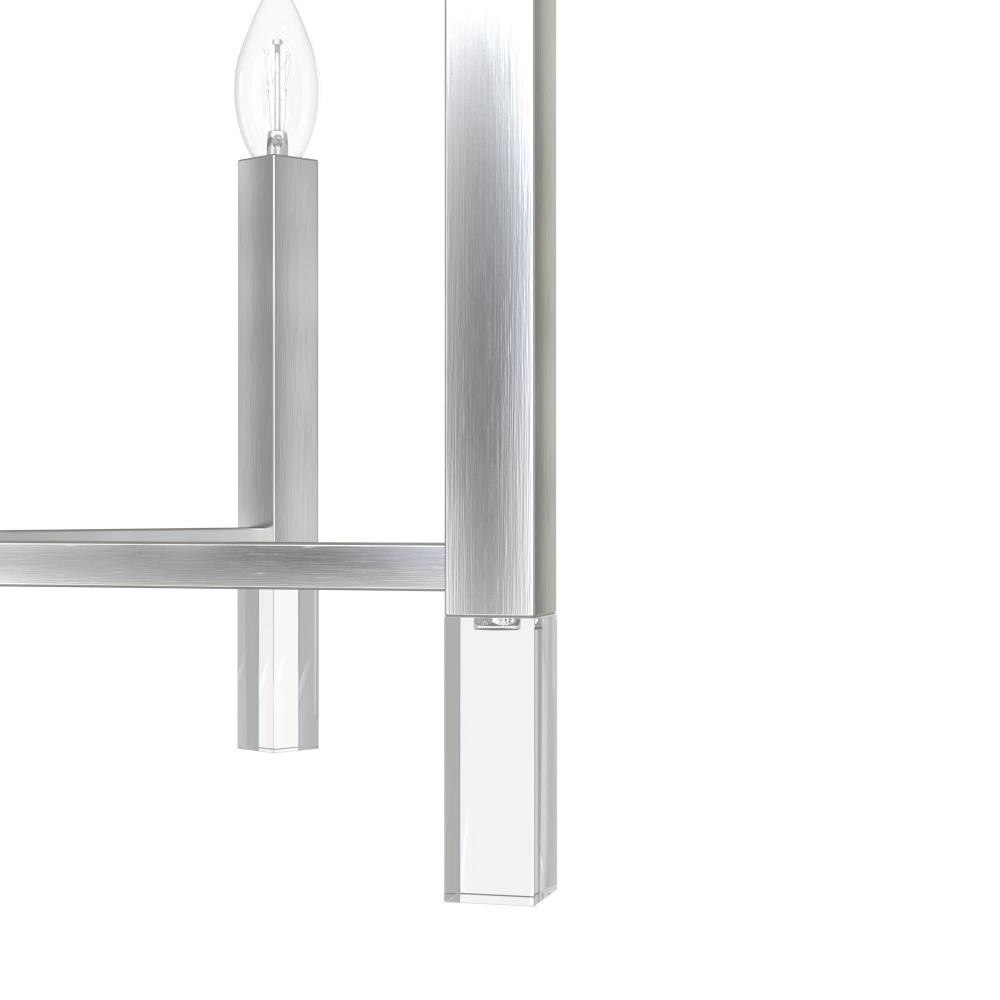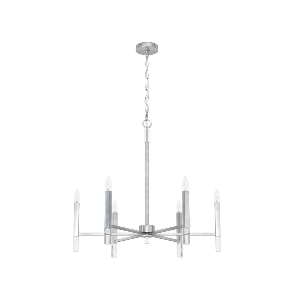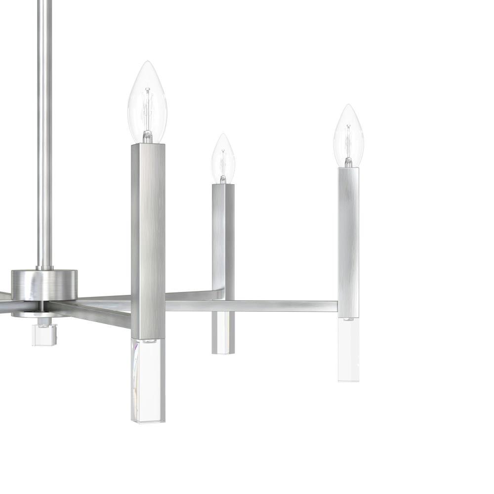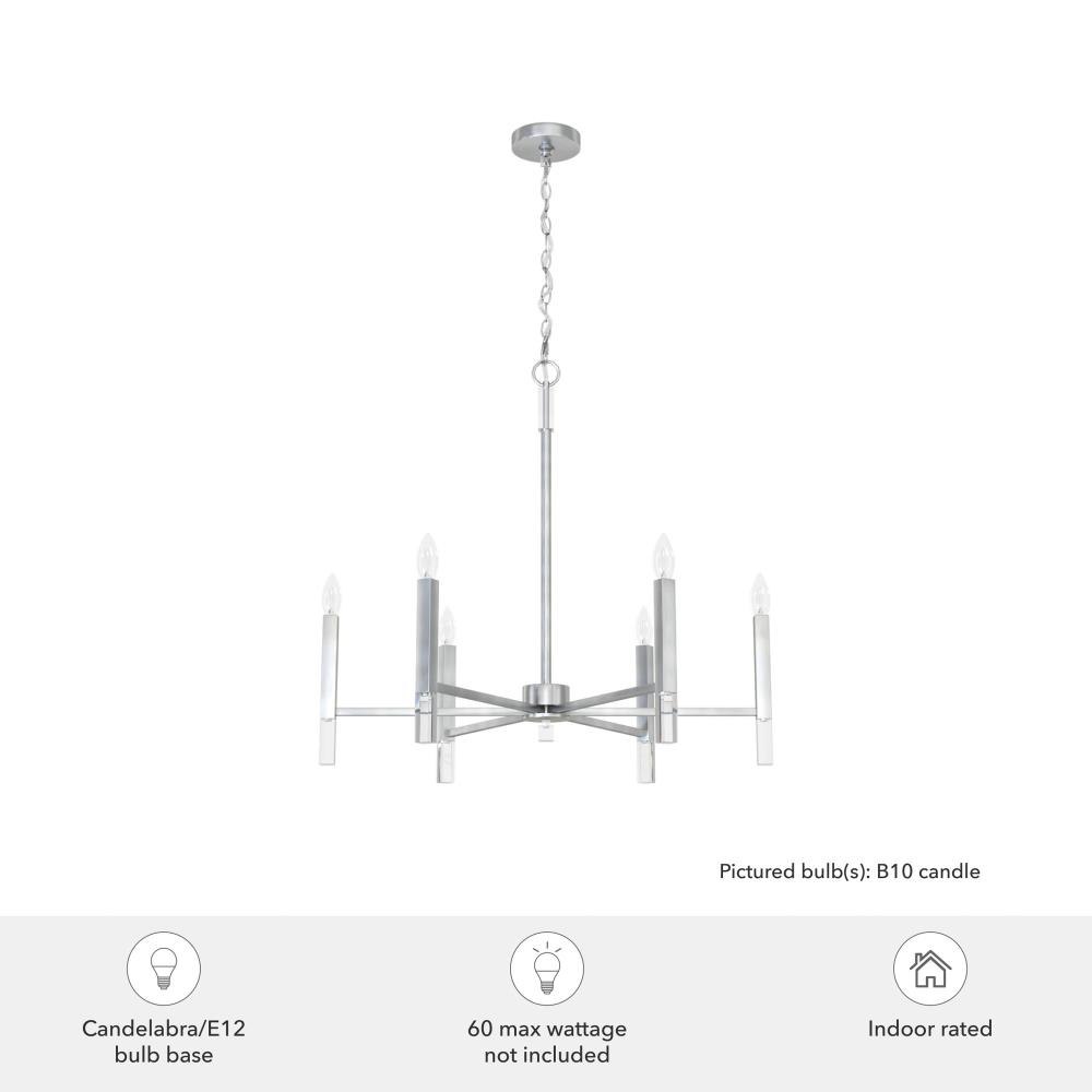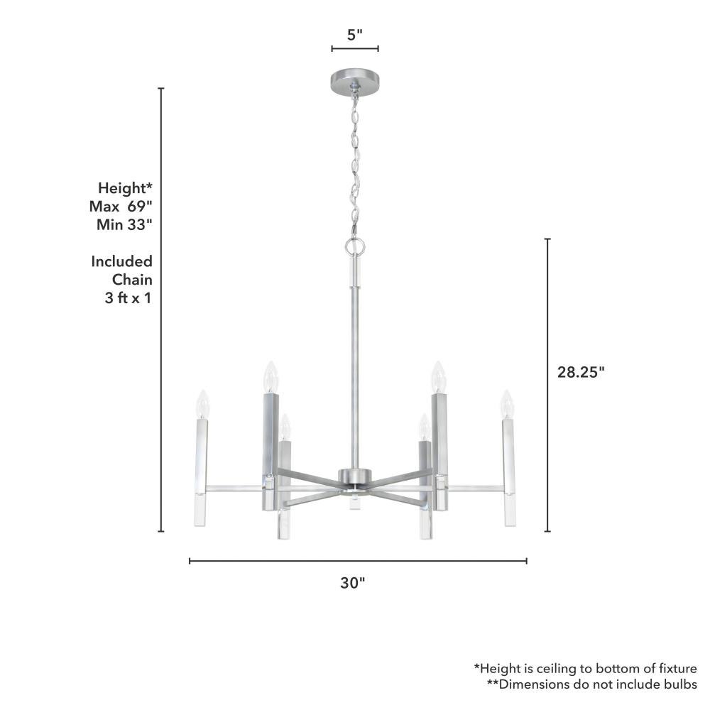 Your guests will be drawn to the beauty of the Sunjai 6 light chandelier. The perfect modern accent to your home’s living or dining room, your guests will be entertained by your style. Pairing the modern simplicity with elegant design and chic sparkling accents, the Sunjai chandelier is a wonderful way to light up your living space without overwhelming your home’s existing décor. Upgrade your aesthetic with the Sunjai.Rated for indoor use onlyRequires 6 E12 bulbs. Bulbs not included.MADE FOR INDOORS: For use in indoor spaces like kitchens, bedrooms, living rooms, dining rooms, and entryways.BULB RECOMMENDATION: Maximum 60 W per light bulb or equivalent LED bulb. Bulbs not included.PICTURED HERE: Match our image using B10 Candle light bulbs.CUSTOMIZABLE HANGING OPTIONS: With the minimum required chain, the hanging length is 33 inches. When using all of the included chain, the maximum hanging length is 69 inches.WARRANTY: One-year limited warranty backed by the trusted experts at Hunter.