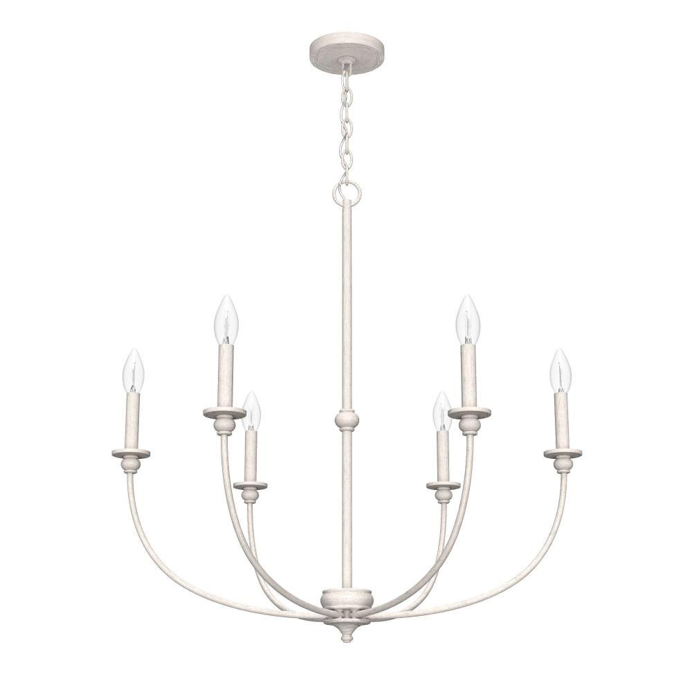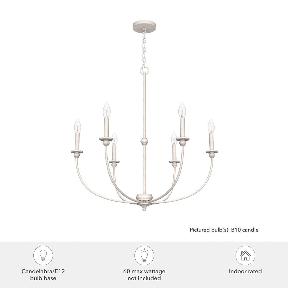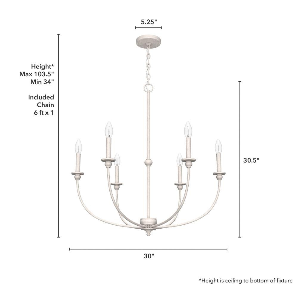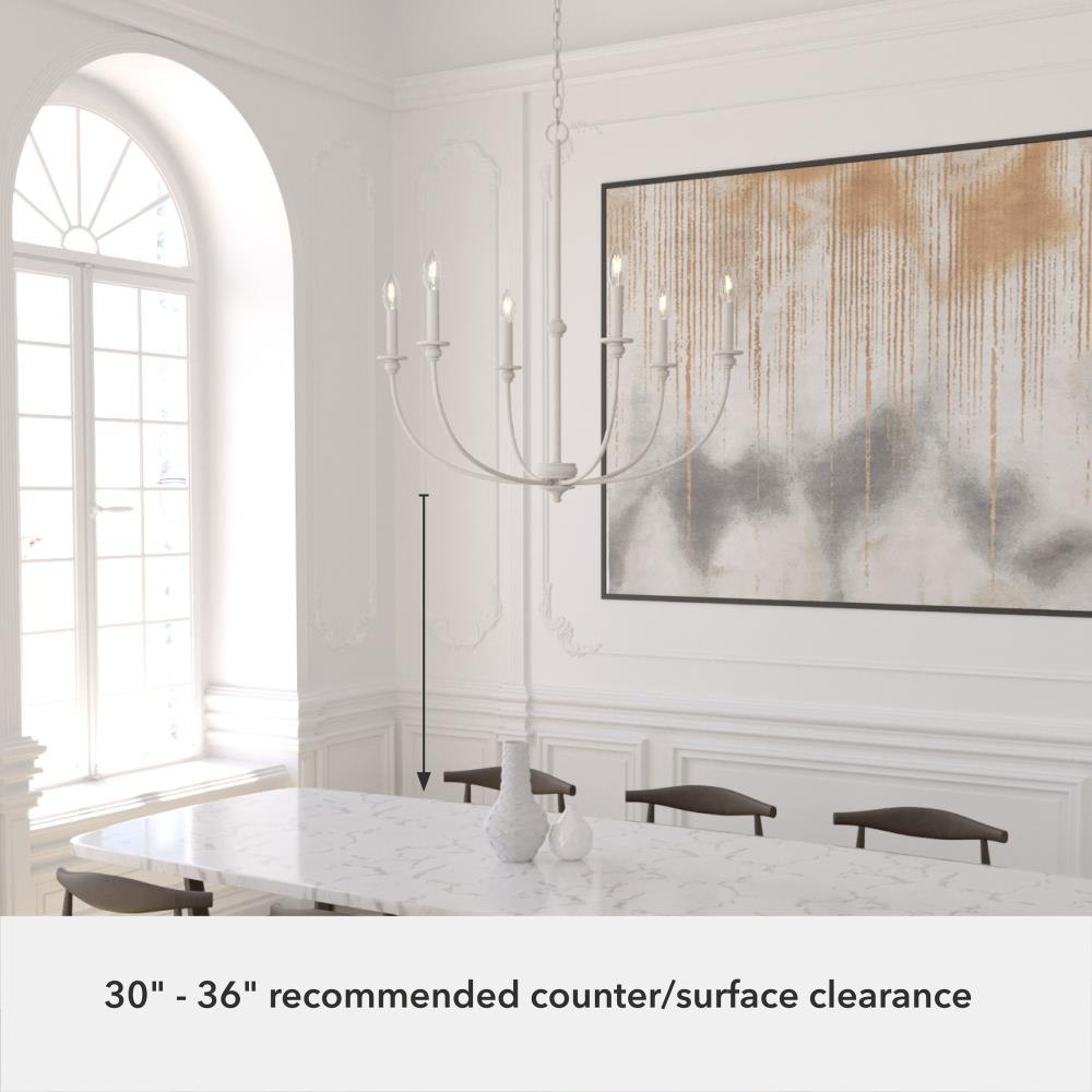 The Southcrest 6 light chandelier is an elegant accent piece that can brighten up any living or dining space. Classic design and cottage style converge in this candelabra-like chandelier with subtle curves and a vintage vibe. Available in flat matte black or distressed white, you can choose the fixture finish that perfectly complements your existing décor. Rated for indoor use only Requires 6 E12 bulbs. Bulbs not included. MADE FOR INDOORS: For use in indoor spaces like kitchens, bedrooms, living rooms, dining rooms, and entryways. BULB RECOMMENDATION: Maximum 60 W per light bulb or equivalent LED bulb. Bulbs not included. CUSTOMIZABLE HANGING OPTIONS: With the minimum required chain, the hanging length is 34 inches. When using all of the included chain, the maximum hanging length is 103.5 inches.
