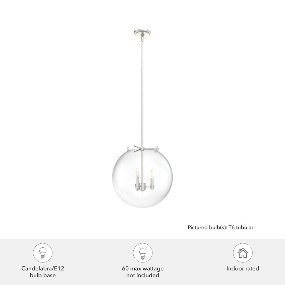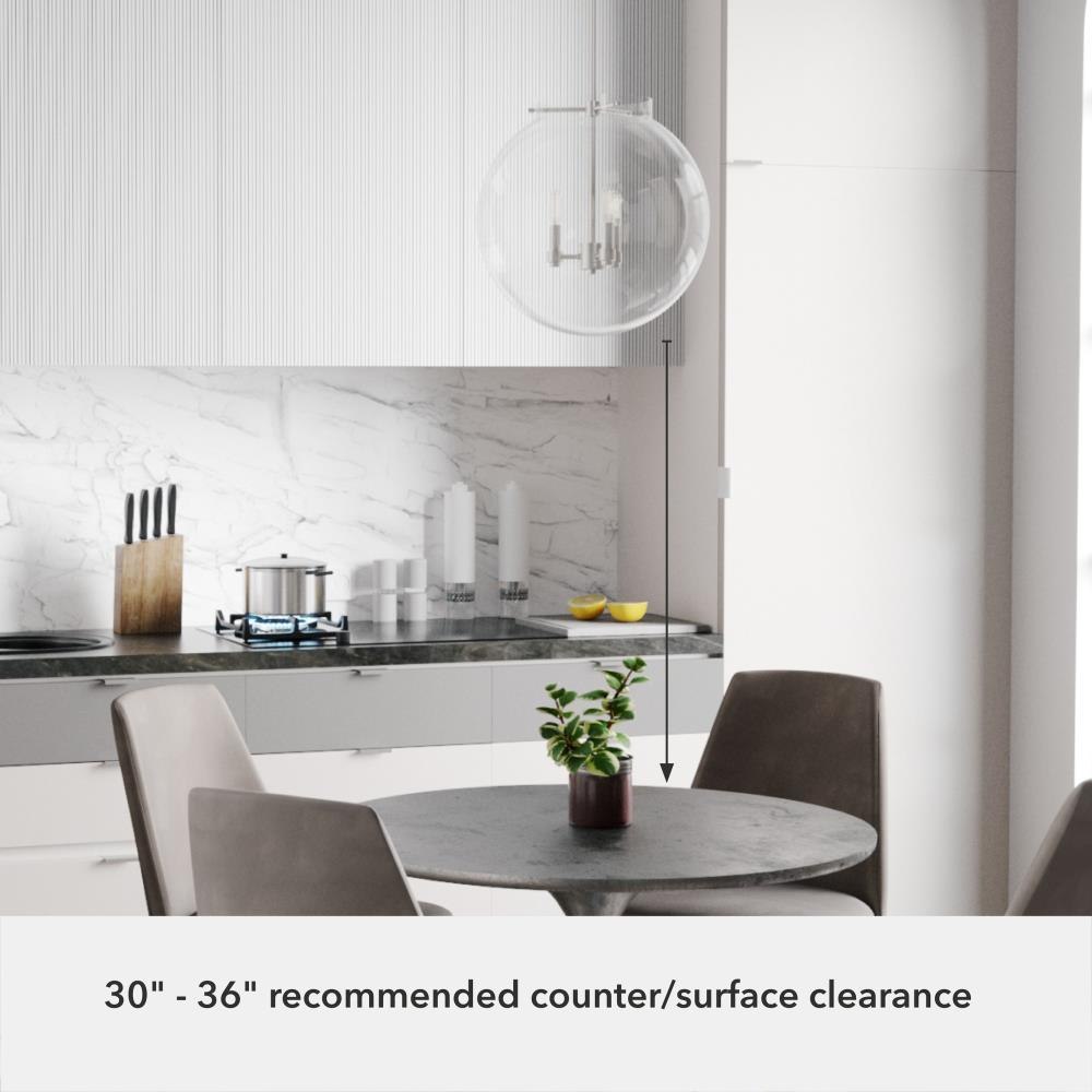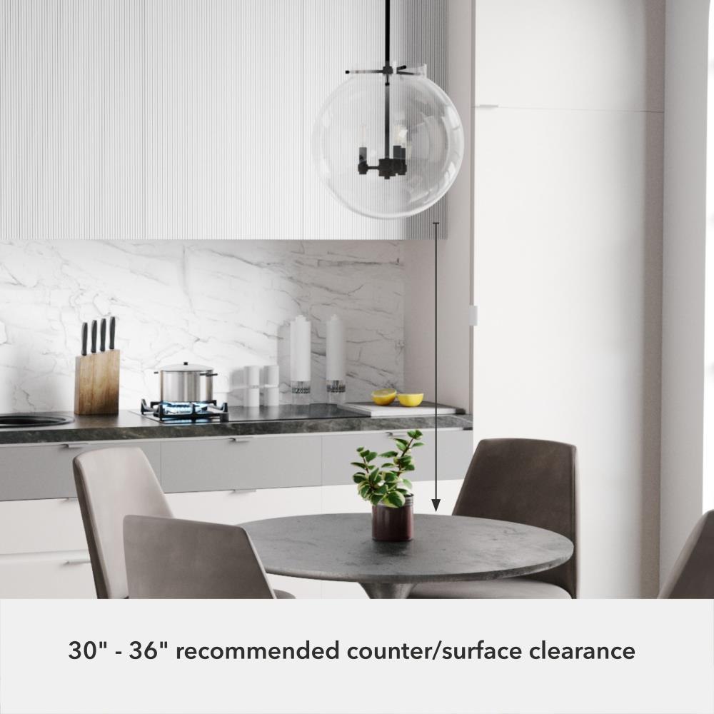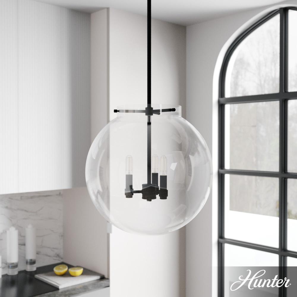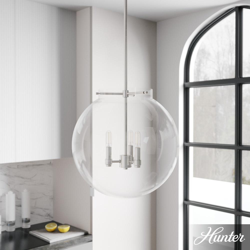 The Sacha globe pendant will give you a world of light in your dining space. Clear glass and clean lines make your modern space sophisticated and elegant. The simple glamour of this pendant exudes modern luxury and will make you want all the fixtures in the Sacha collection for your home.Rated for indoor use onlyRequires 3 E12 bulbs. Bulbs not included.MADE FOR INDOORS: For use in indoor spaces like kitchens, bedrooms, living rooms, dining rooms, and entryways.BULB RECOMMENDATION: Maximum W per light bulb or equivalent LED bulb. Bulbs not included.PICTURED HERE: Match our image using T6 Tubular light bulbs.CUSTOMIZABLE HANGING OPTIONS: With the minimum required downrods, the hanging length is 25.25 inches. When using all of the included downrods, the maximum hanging length is 73.25 inches.WARRANTY: One-year limited warranty backed by the trusted experts at Hunter.