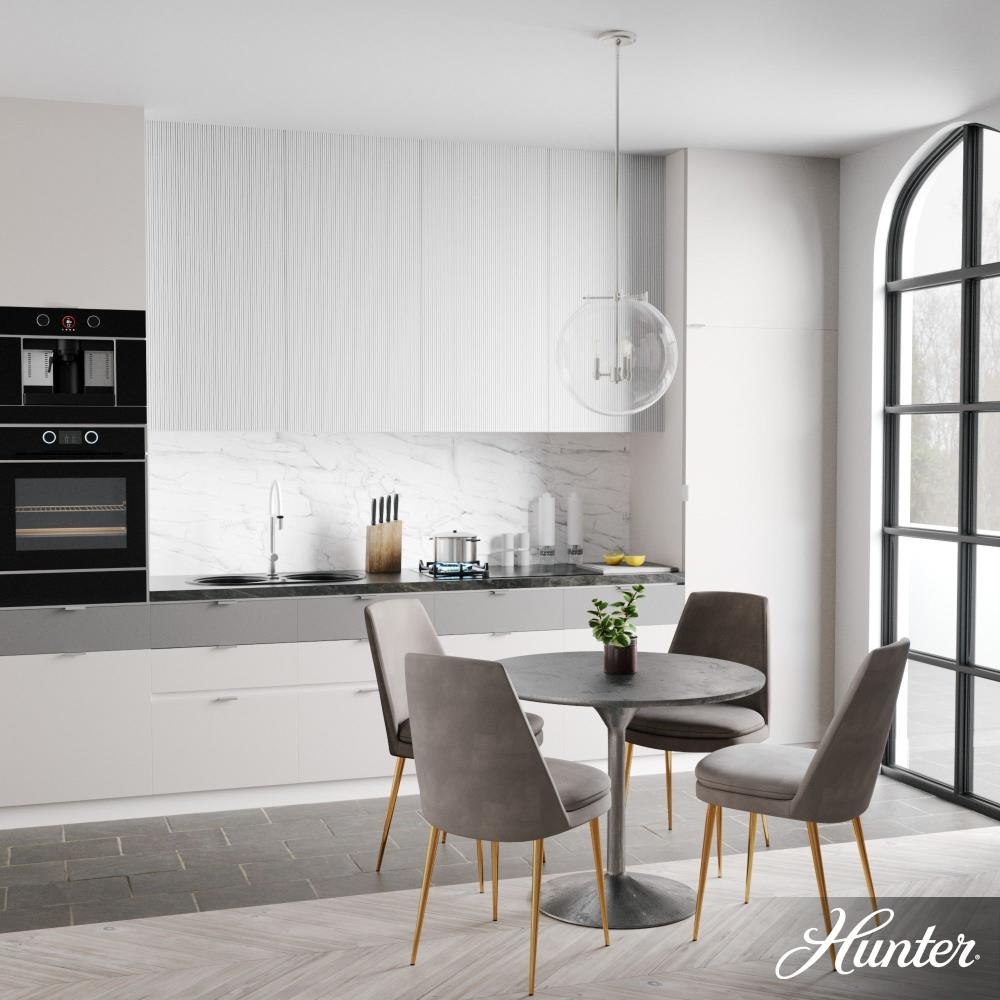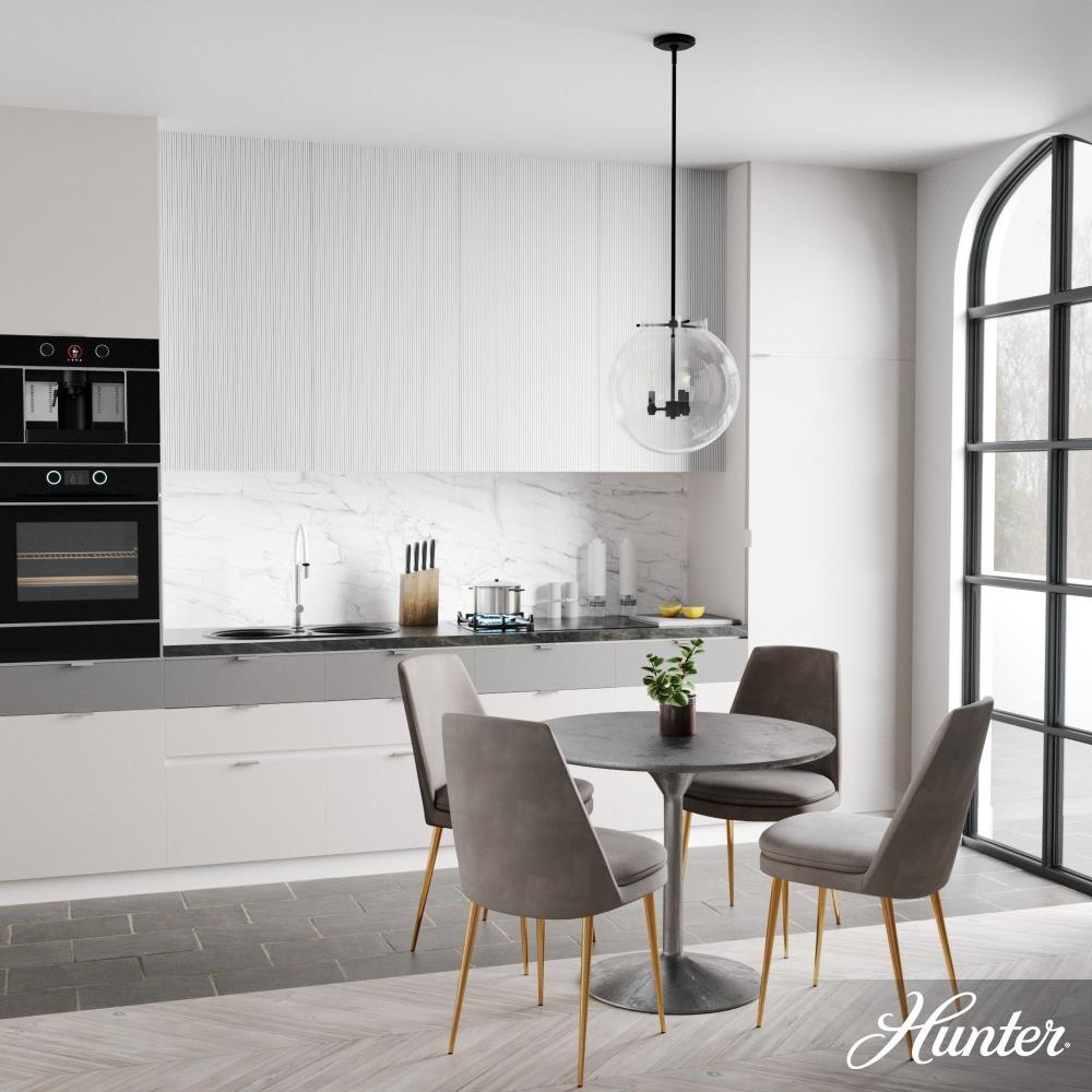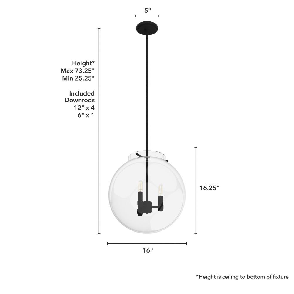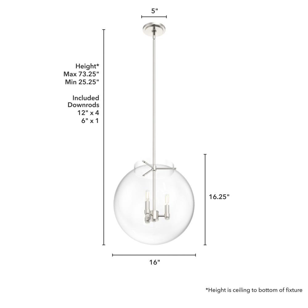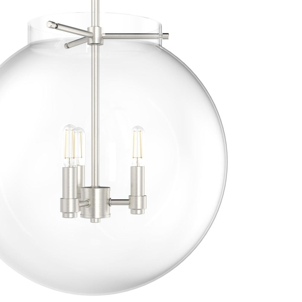 The Sacha globe pendant will give you a world of light in your dining space. Clear glass and clean lines make your modern space sophisticated and elegant. The simple glamour of this pendant exudes modern luxury and will make you want all the fixtures in the Sacha collection for your home.Rated for indoor use onlyRequires 3 E12 bulbs. Bulbs not included.MADE FOR INDOORS: For use in indoor spaces like kitchens, bedrooms, living rooms, dining rooms, and entryways.BULB RECOMMENDATION: Maximum W per light bulb or equivalent LED bulb. Bulbs not included.PICTURED HERE: Match our image using T6 Tubular light bulbs.CUSTOMIZABLE HANGING OPTIONS: With the minimum required downrods, the hanging length is 25.25 inches. When using all of the included downrods, the maximum hanging length is 73.25 inches.WARRANTY: One-year limited warranty backed by the trusted experts at Hunter.