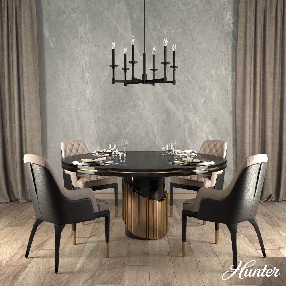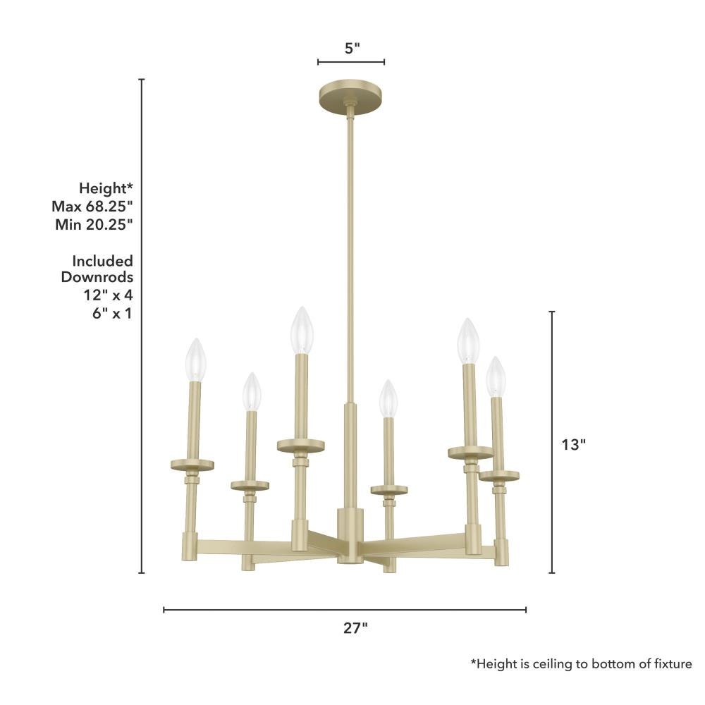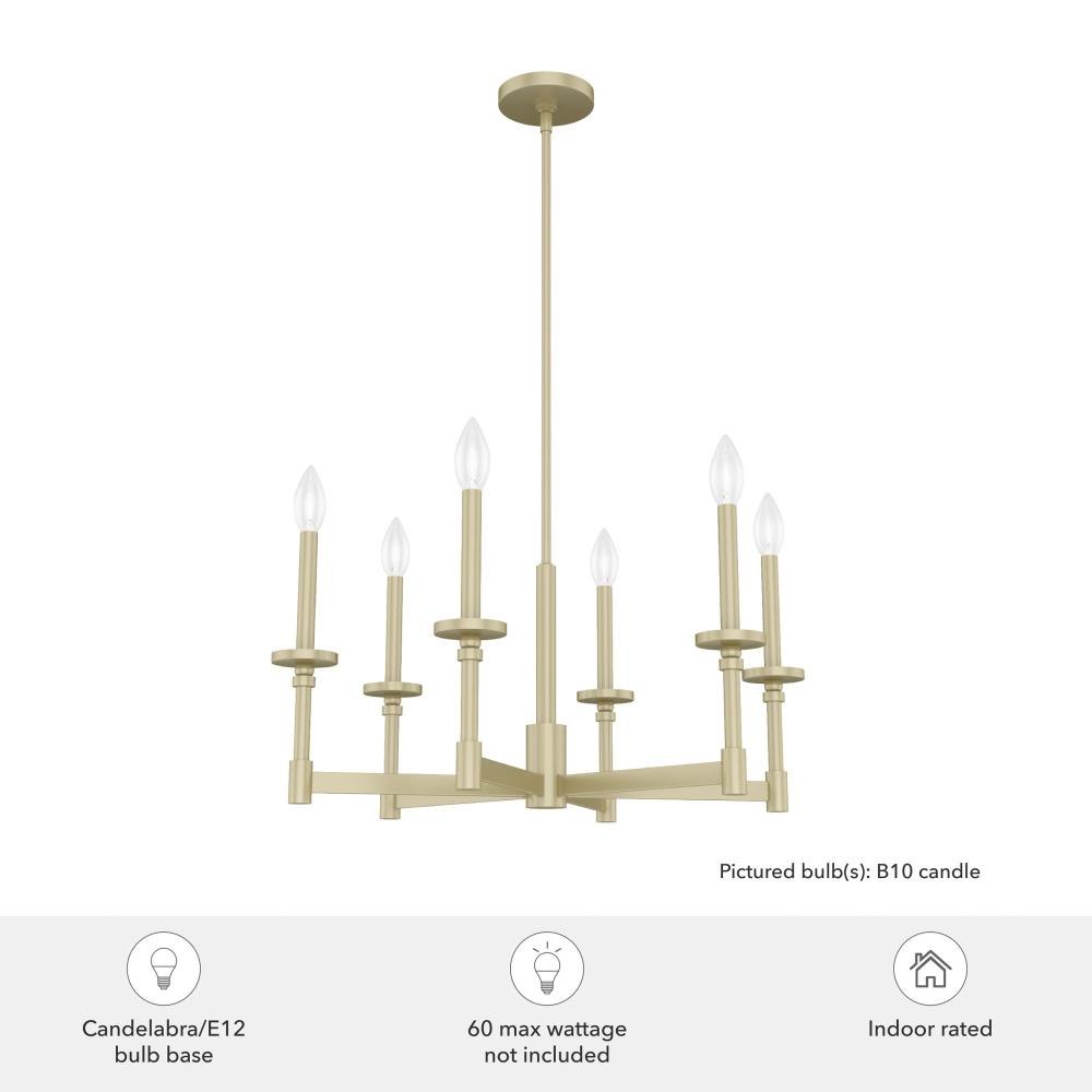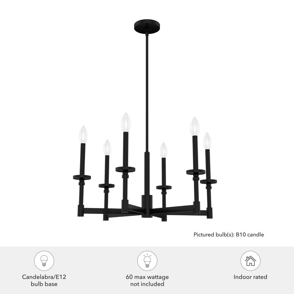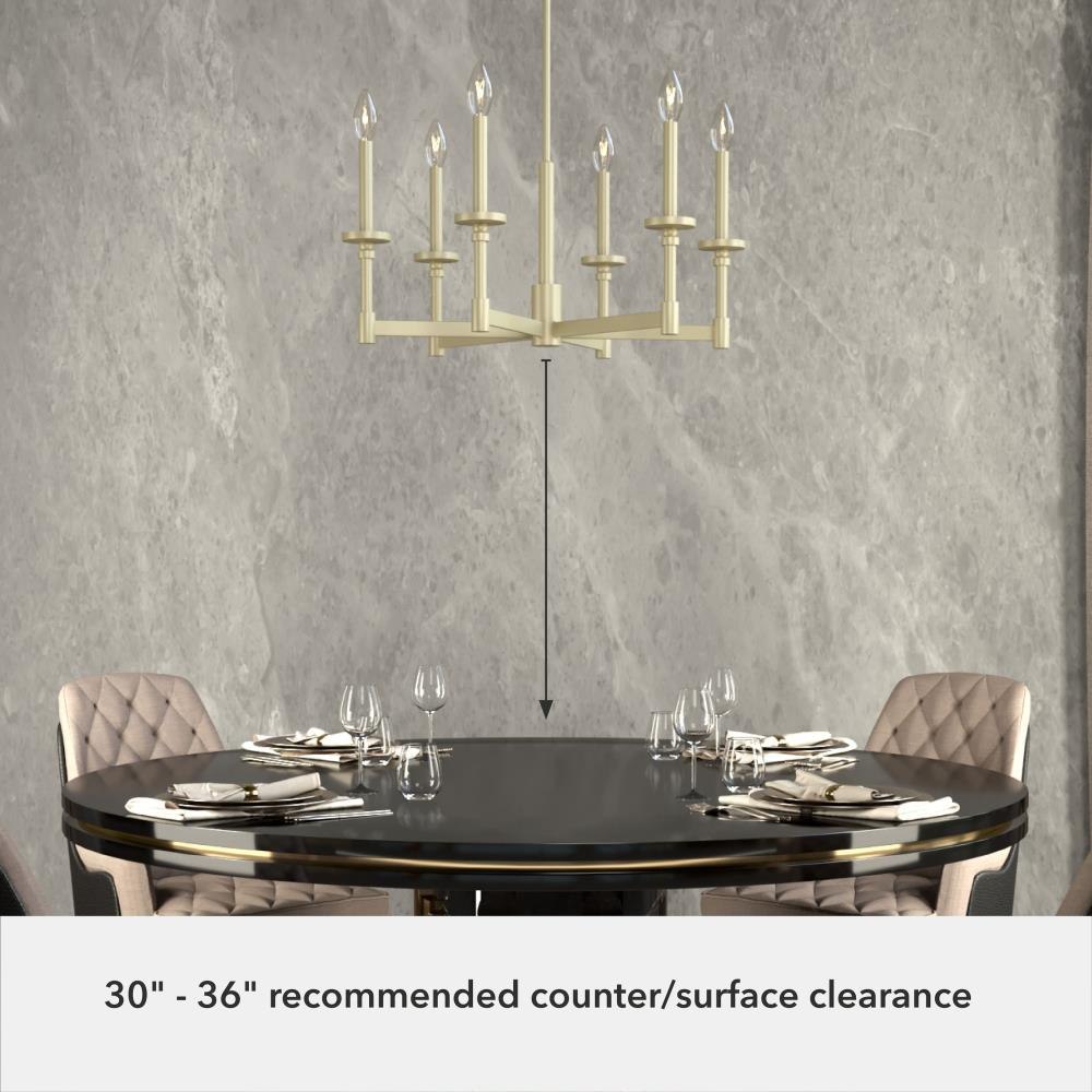 Bring elegance and drama to your space with the Briargrove single tier chandelier. This formal fixture with a modern edge is an eye-catching design that will illuminate your space beautifully. The modern take on formal lighting of the Briargrove collection will elevate any space. Rated for indoor use only Requires 6 E12 bulbs. Bulbs not included. MADE FOR INDOORS: For use in indoor spaces like kitchens, bedrooms, living rooms, dining rooms, and entryways. BULB RECOMMENDATION: Maximum W per light bulb or equivalent LED bulb. Bulbs not included. PICTURED HERE: Match our image using B10 Candle light bulbs. CUSTOMIZABLE HANGING OPTIONS: With the minimum required downrod, the hanging length is 24 inches. When using all of the included downrod, the maximum hanging length is 72 inches.