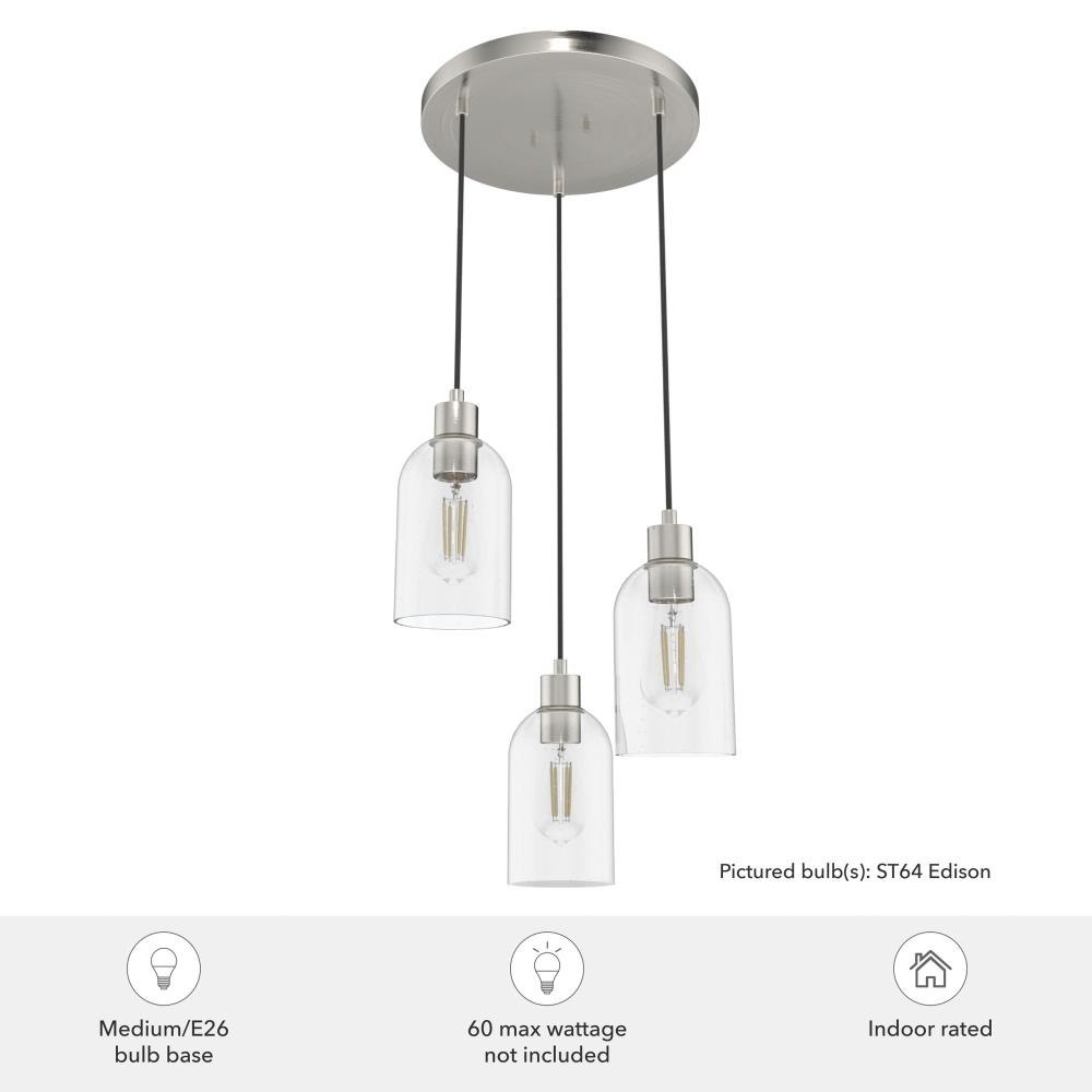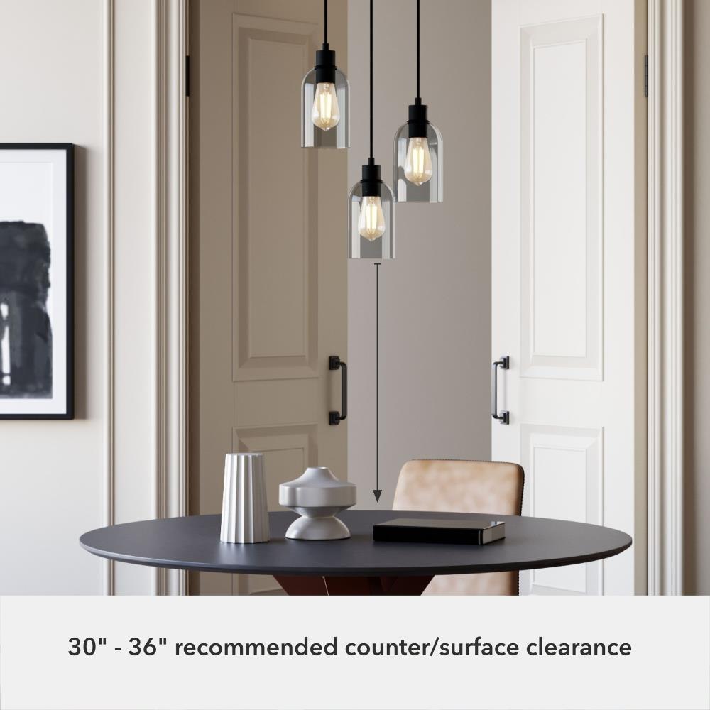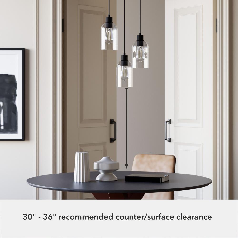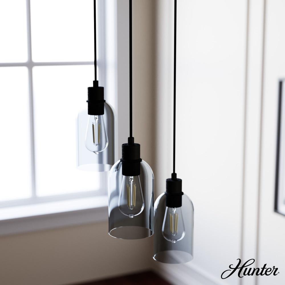 The little black dress of lighting. The minimalist modern design of the Lochemeade round cluster is versatile, featuring striking yet simple clear dome shades. Enjoy three glass pendant lights with one installation, perfect for small spaces like kitchenettes or for a unique alternative to chandeliers above dining tables.Rated for indoor use onlyRequires 3 E26 bulbs. Bulbs not included.MADE FOR INDOORS: For use in indoor spaces like kitchens, bedrooms, living rooms, dining rooms, and entryways.BULB RECOMMENDATION: Maximum 60 W per light bulb or equivalent LED bulb. Bulbs not included.PICTURED HERE: Match our image using ST64 Edison light bulbs.WARRANTY: One-year limited warranty backed by the trusted experts at Hunter.