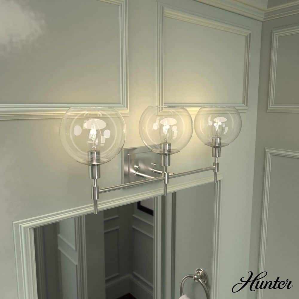 Hunter Xidane 3-Light Bathroom Vanity Light in Brushed NickelStart your day under the striking beauty of modern lights and you'll be ready to face the world. Let the Xidane vanity help you make your morning bright! The glass will allow the ambient light to shine making you feel like a star. Make an impression by adding lights from the Xidane collection throughout your home. Mix and match with fans from our ceiling fan collections to fully finish your space.It measures 10" high x 8" long x 24" wide. Requires 3 E12 bulbs. Bulbs not included.Damp rated. Can be used in humid environments like bathrooms or covered outdoor areas.