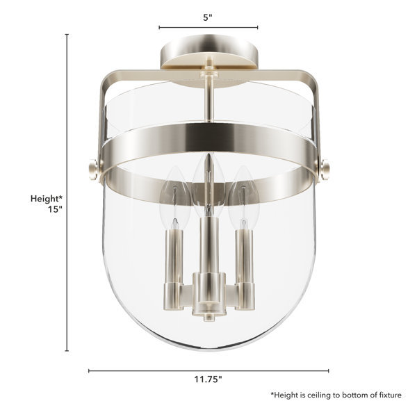 This 3-light semi-flush mount brightens any room with its sleek, streamlined silhouette and modern looks. The fixture and the candelabra base are made from aluminum with a striking metallic finish, and it holds three bulbs (sold separately) to give you a soothing ambient glow wherever you want. This pendant light's corresponding clear glass shade brings a more traditional vibe. It's compatible with LEDs for a more energy-efficient and eco-friendly option. With a hanging height of 15", this mount is ideal for space-conscious areas with lower ceilings.