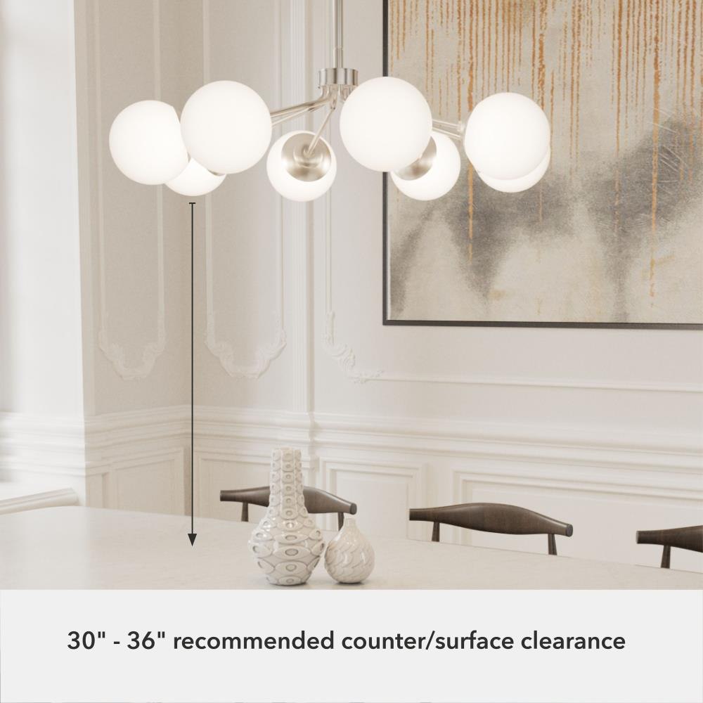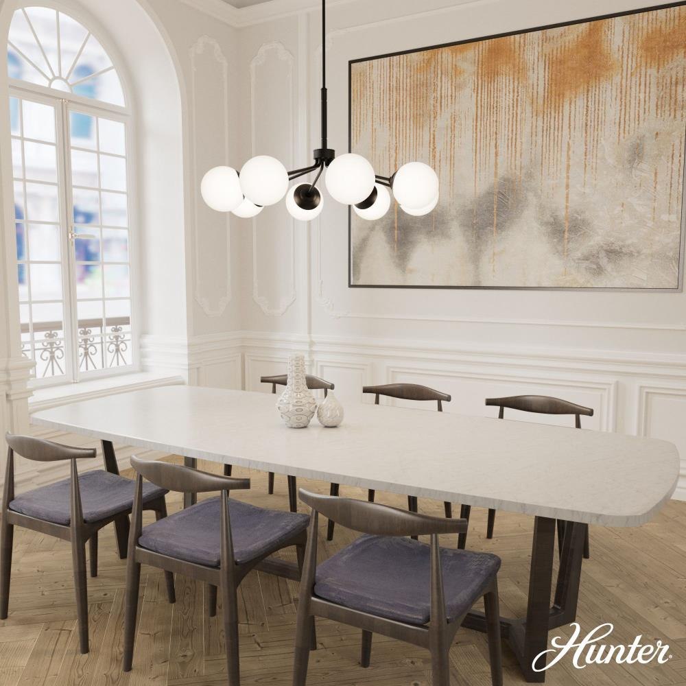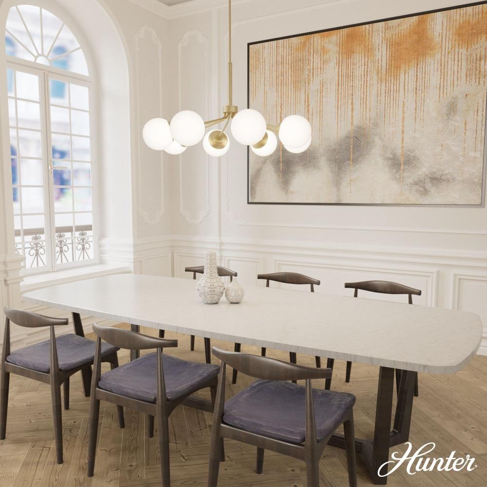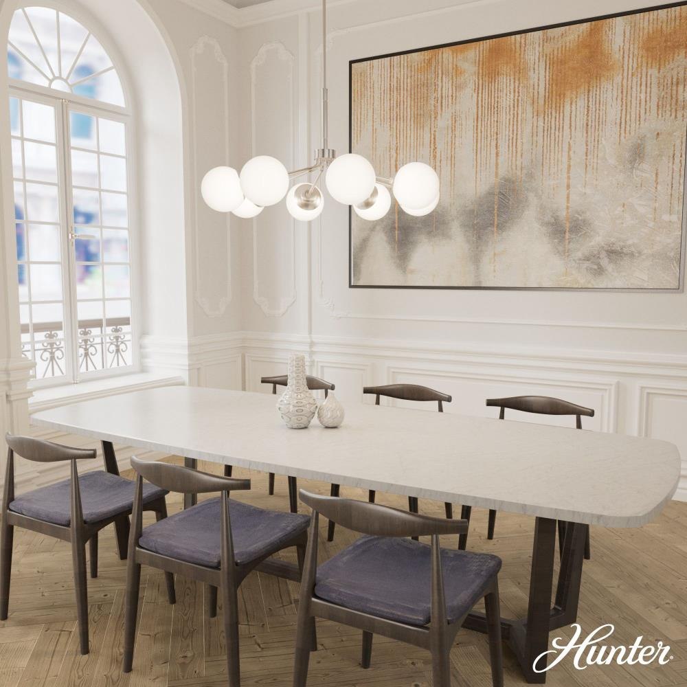 Your style is full-on glam, and you like pieces that reflect it. The Hepburn chandelier is the perfect light for you. This light is stunning with a design inspired by the glamour of old Hollywood! Eight orbs of cased-white glass will cast a flattering glow in your living room. This light offers brilliant illumination to every gathering. Add other lights from the collection for a glam look throughout.. Rated for indoor use only. Requires 8 E26 bulbs. Bulbs not included.. MADE FOR INDOORS: For use in indoor spaces like kitchens, bedrooms, living rooms, dining rooms, and entryways.. BULB RECOMMENDATION: Maximum 60 W per light bulb or equivalent LED bulb. Bulbs not included.. CUSTOMIZABLE HANGING OPTIONS: With the minimum required downrod, the hanging length is inches. When using all of the included downrod, the maximum hanging length is inches.. WARRANTY: One-year limited warranty backed by the trusted experts at Hunter.