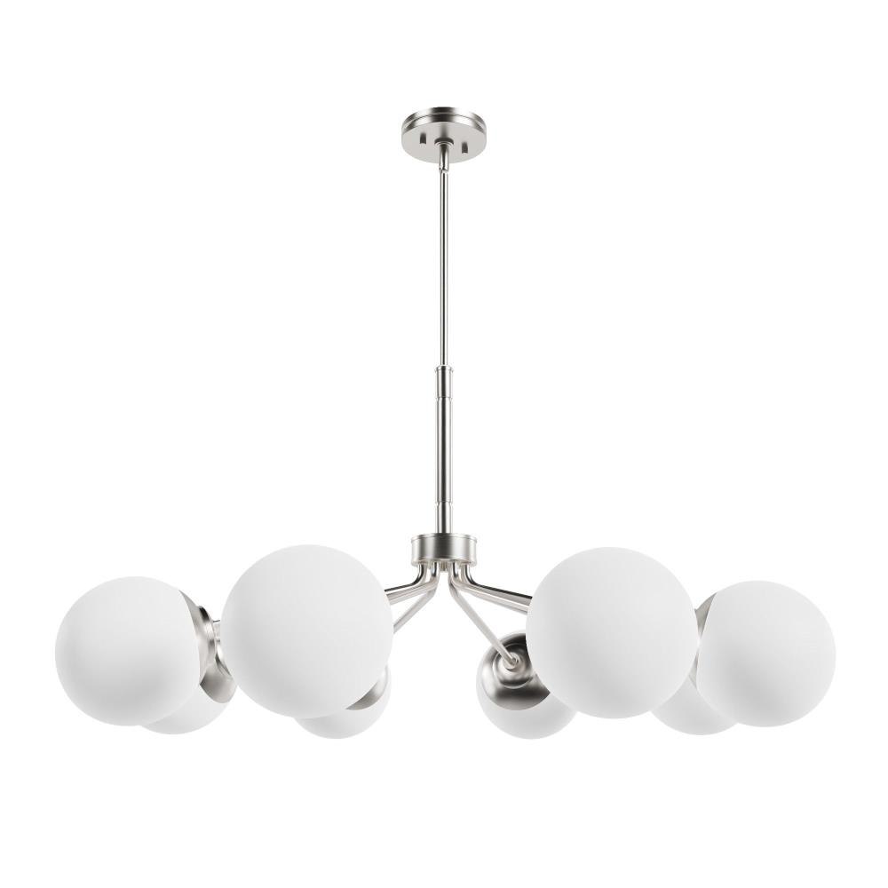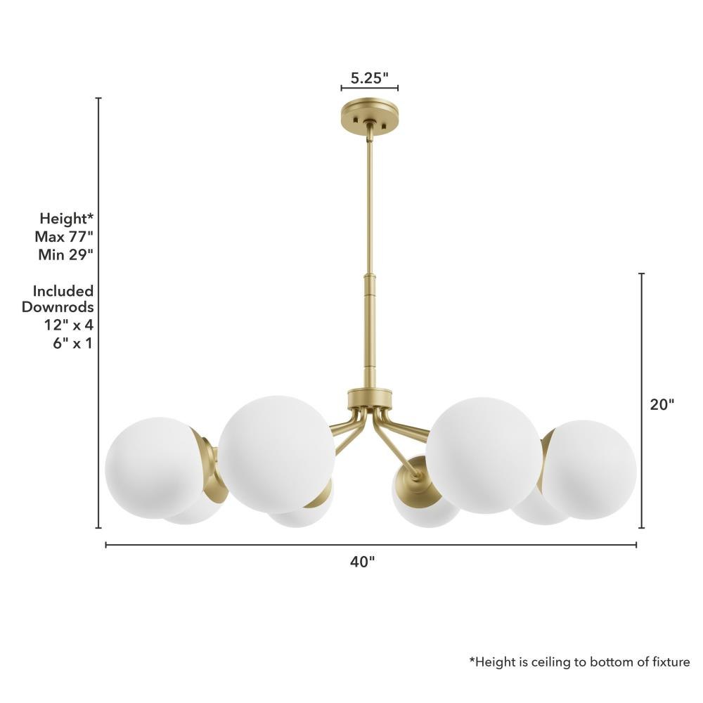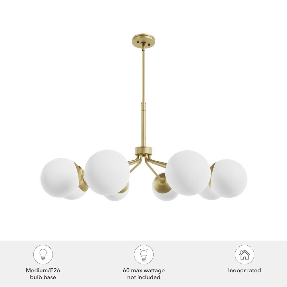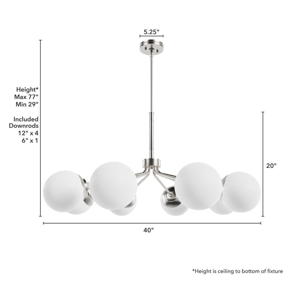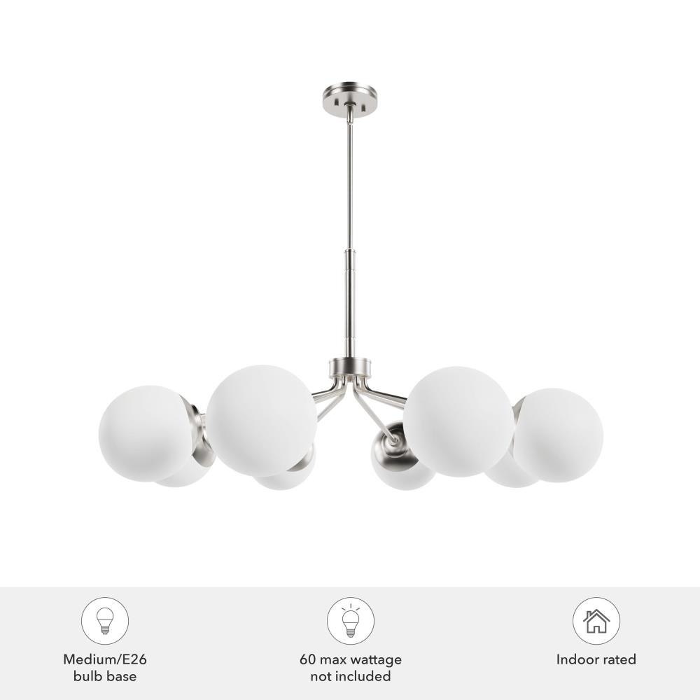 Your style is full-on glam, and you like pieces that reflect it. The Hepburn chandelier is the perfect light for you. This light is stunning with a design inspired by the glamour of old Hollywood! Eight orbs of cased-white glass will cast a flattering glow in your living room. This light offers brilliant illumination to every gathering. Add other lights from the collection for a glam look throughout.. Rated for indoor use only. Requires 8 E26 bulbs. Bulbs not included.. MADE FOR INDOORS: For use in indoor spaces like kitchens, bedrooms, living rooms, dining rooms, and entryways.. BULB RECOMMENDATION: Maximum 60 W per light bulb or equivalent LED bulb. Bulbs not included.. CUSTOMIZABLE HANGING OPTIONS: With the minimum required downrod, the hanging length is inches. When using all of the included downrod, the maximum hanging length is inches.. WARRANTY: One-year limited warranty backed by the trusted experts at Hunter.