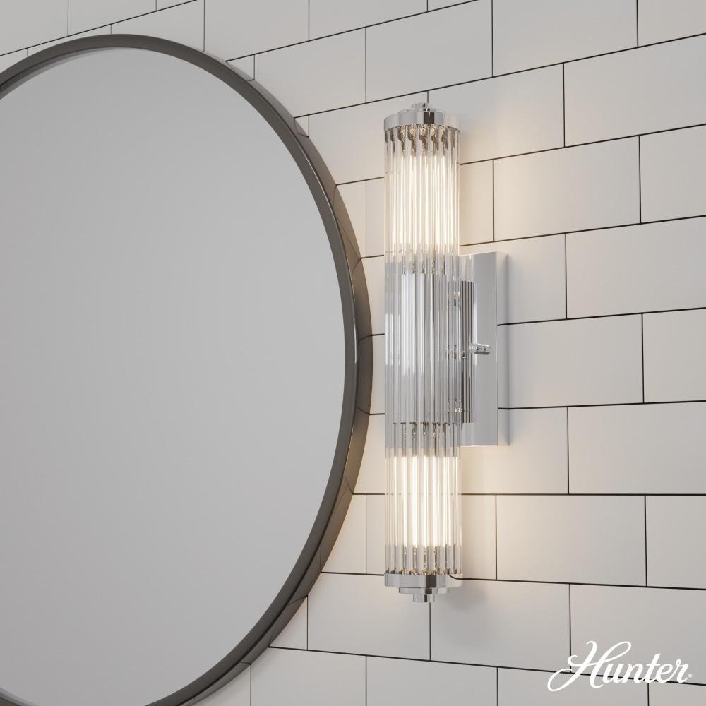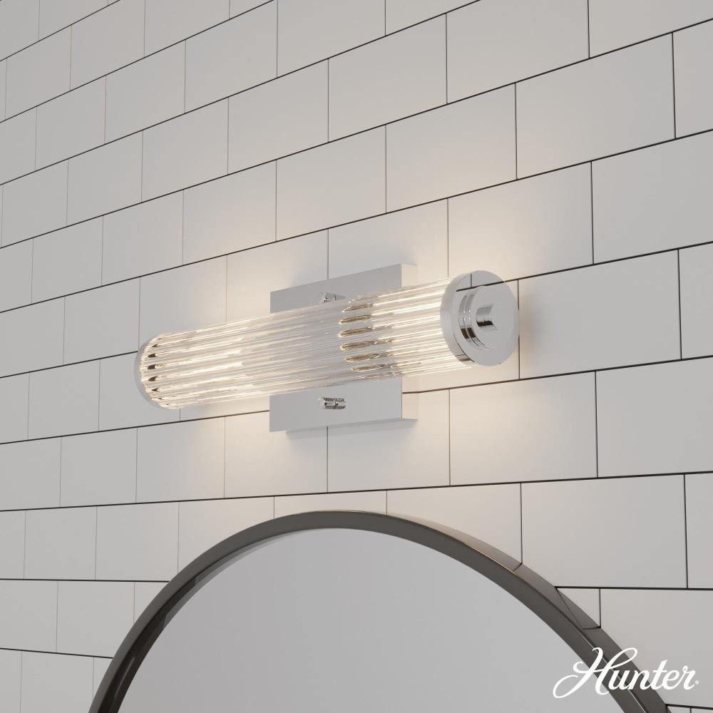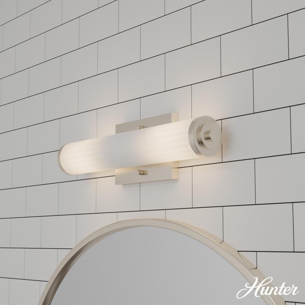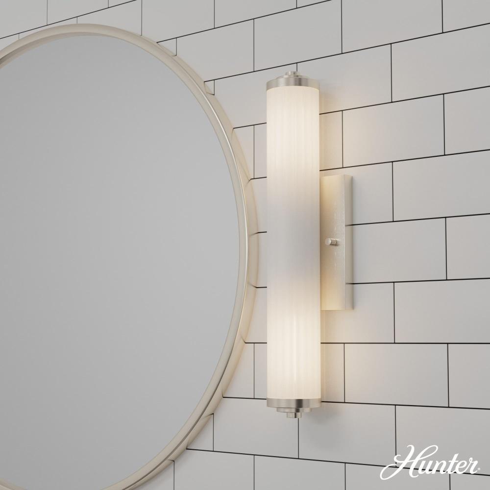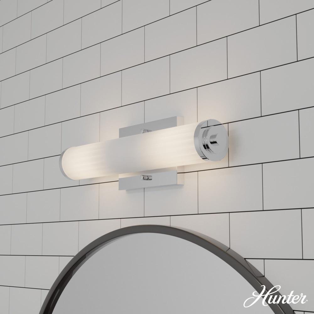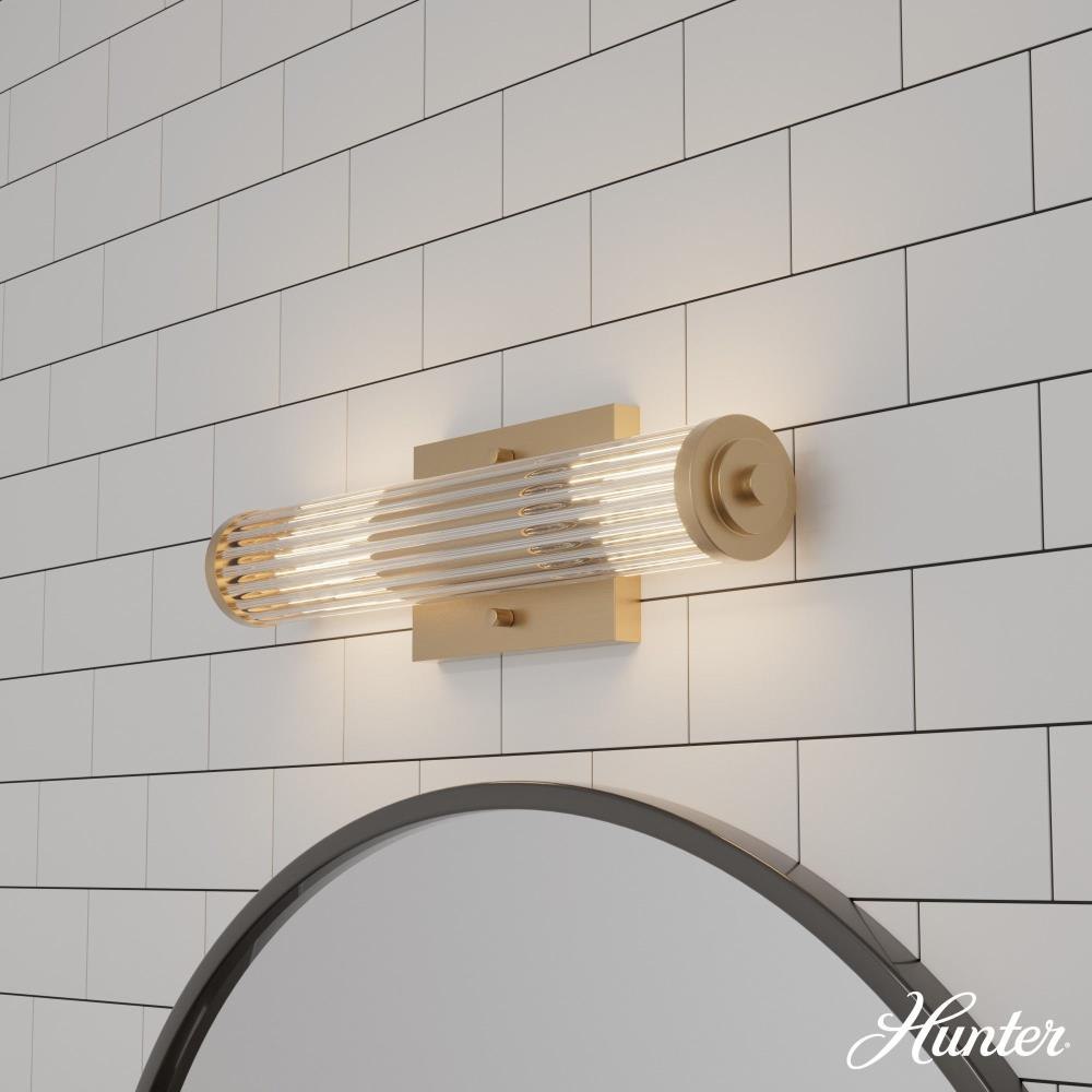 Perhaps the graceful design of the Holly Grove vanity light encourages its use beyond the powder room. The shade, like a rolled scroll clasped by a metal band, is both art deco and elegant, making it a suitable accent light over art or shelves. Make your home modern and fashionable with the Holly Grove collection. Mix and match with fans from our ceiling fan collections to fully finish your space.. Rated for indoor spaces exposed to humidity. Requires 2 E26 bulbs. Bulbs not included.. INDOOR-DAMP RATED: For use in indoor spaces exposed to humidity like bathrooms and laundry rooms.. BULB RECOMMENDATION: Maximum 60 W per light bulb or equivalent LED bulb. Bulbs not included.. PICTURED HERE: Match our image using T10 Tubular light bulbs.. WARRANTY: One-year limited warranty backed by the trusted experts at Hunter.