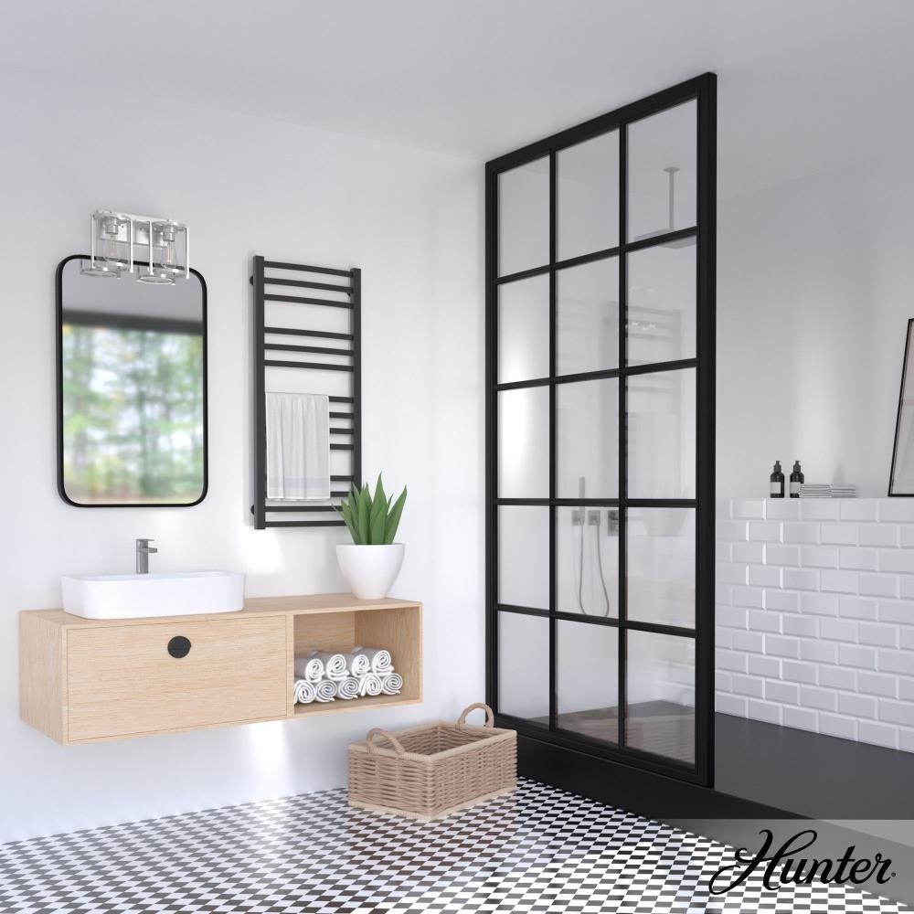 Add powerful illumination to your home. The Astwood’s art deco-inspired vanity light makes a statement wherever it’s mounted. With its damp rating, this vanity light works wonderfully in places exposed to moisture, such as bathrooms or kitchens. Overall, this Astwood vanity light’s clean lines and casual modern touches stand out in spaces that deserve intentional lighting. mix andmatch with other fixtures from this collection or from our ceiling fan designs.. Rated for indoor spaces exposed to humidity. Requires 2 E26 bulbs. Bulbs not included.. INDOOR-DAMP RATED: For use in indoor spaces exposed to humidity like bathrooms and laundry rooms.. BULB RECOMMENDATION: Maximum 60 W per light bulb or equivalent LED bulb. Bulbs not included.. PICTURED HERE: Match our image using ST64 Edison light bulbs.. COORDINATING COLLECTION: Works with Astwood ceiling fan collection. WARRANTY: One-year limited warranty backed by the trusted experts at Hunter.