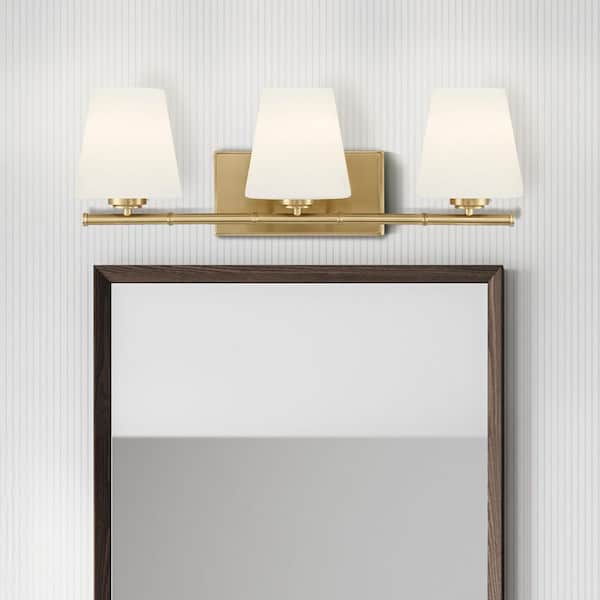 • Transitional gold vanity light with cone-shaped shades