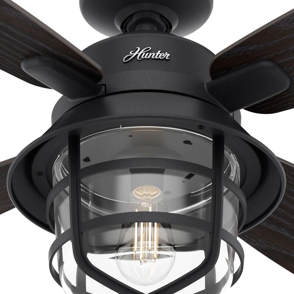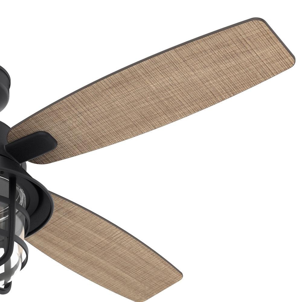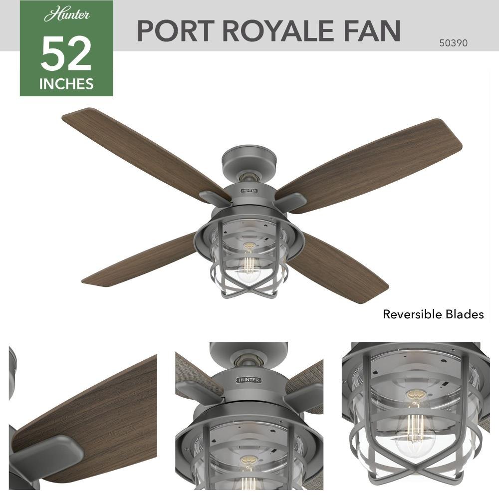 Rustic finishes and vintage details bring the Port Royale outdoor ceiling fan to life. The roasted maple blade finishes complement the lantern-inspired light fixture and energy-efficient LED Edison bulb. This farmhouse-inspired ceiling fan includes a handheld remote for easy changes to fan speed and light dimming. The damp rated Port Royale ceiling fan is perfect for covered porches and patios as well as indoor living rooms and bedrooms.