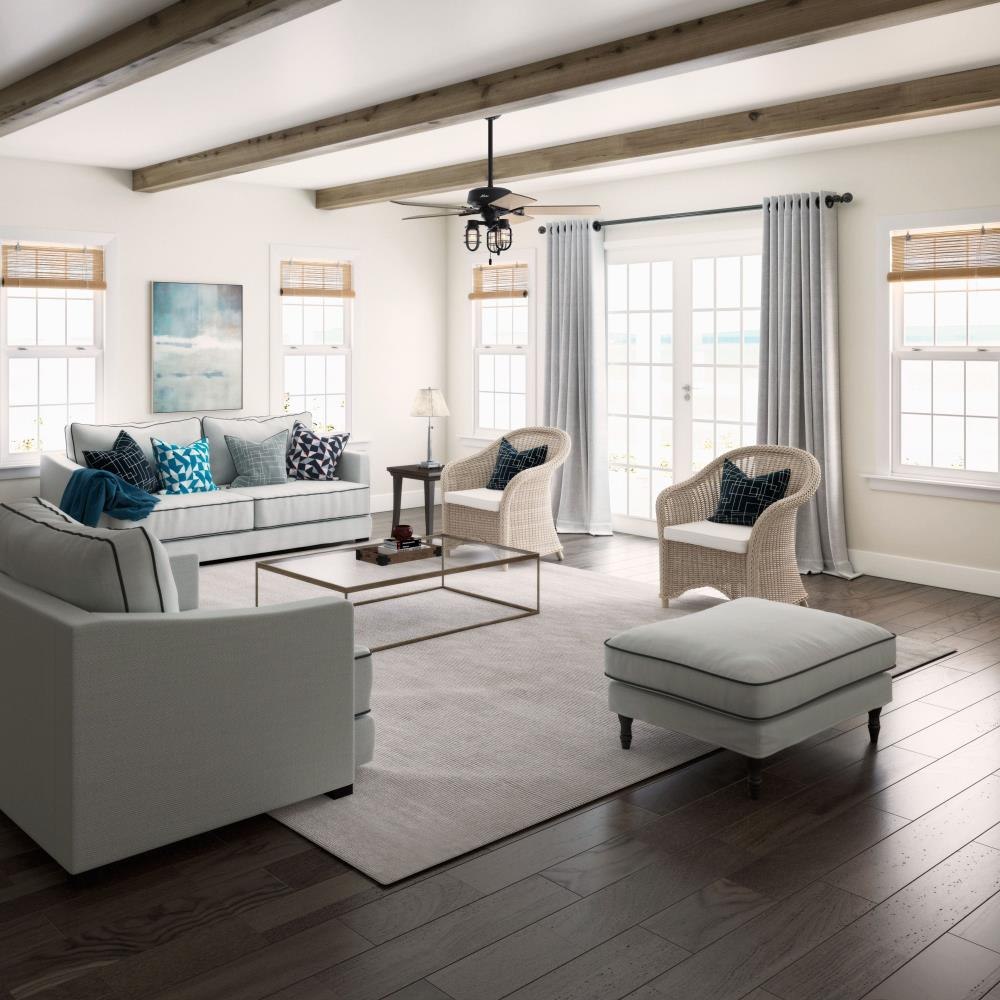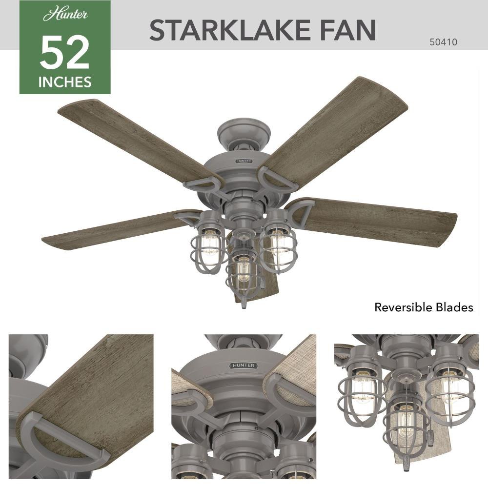 The Starklake ceiling fan dominates rustic indoor and outdoor spaces with its industrial farmhouse style. This five-bladed fan includes our 3-speed WhisperWind- motor, energy-efficient Edison LED bulbs, and reversible fan blades. It is damp rated to withstand outdoor elements while also creating the perfect look to your porch or patio. Shop the Starklake and make a statement in your farmhouse space.