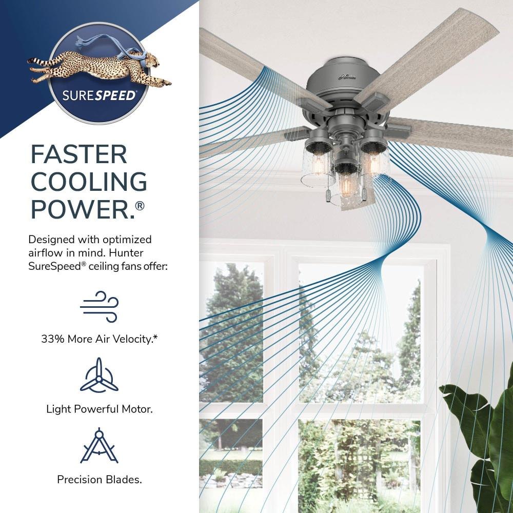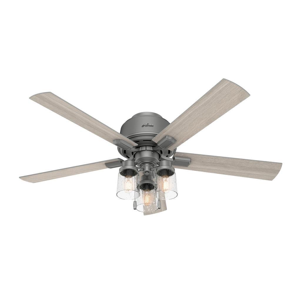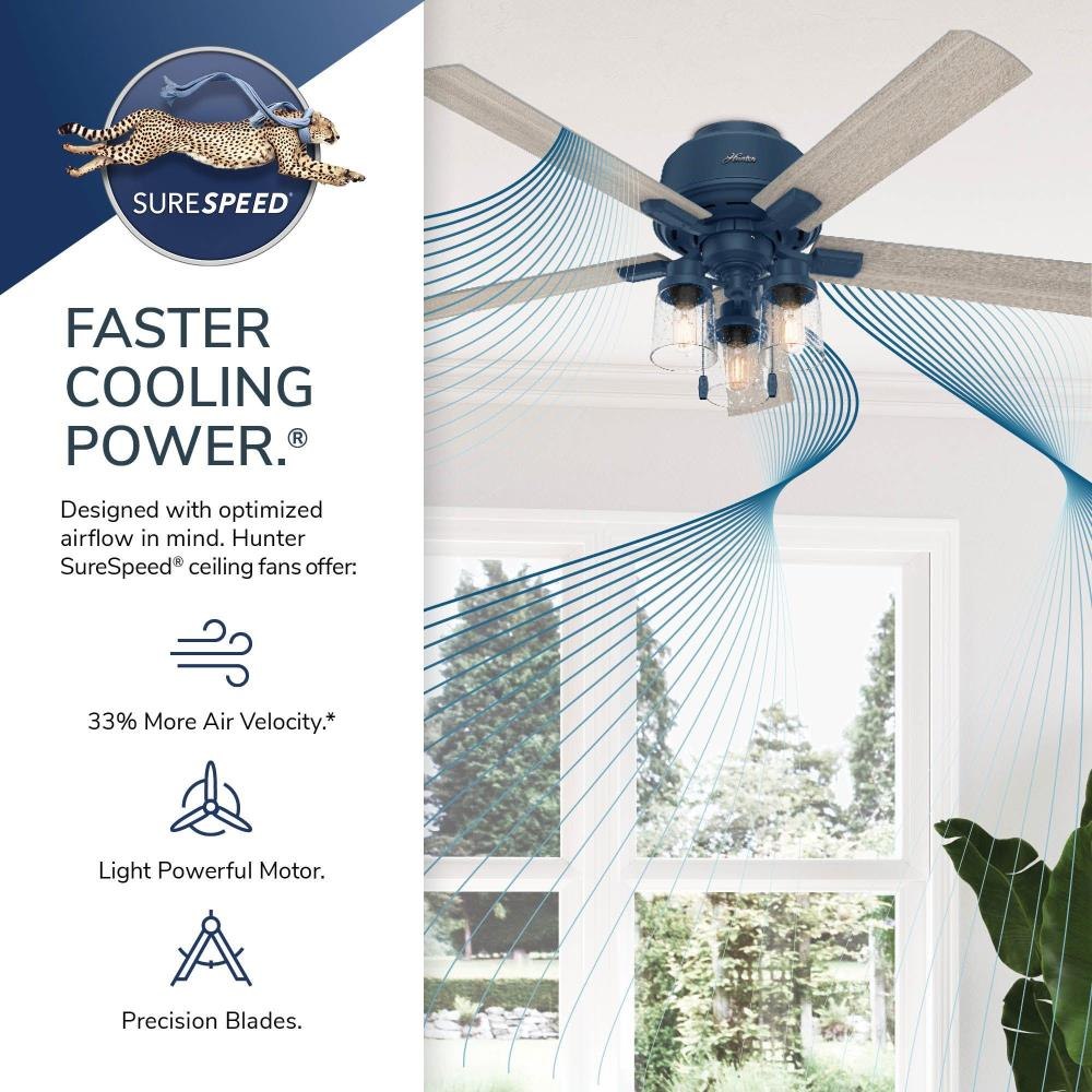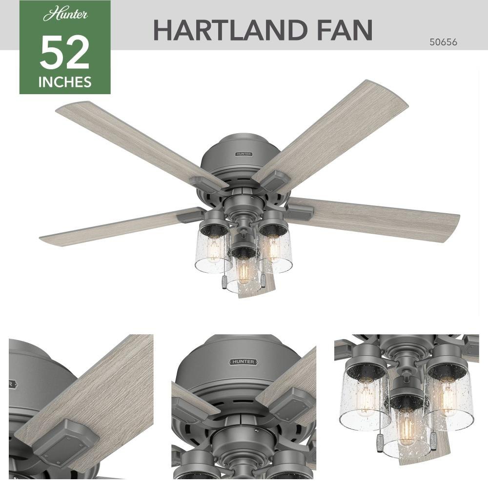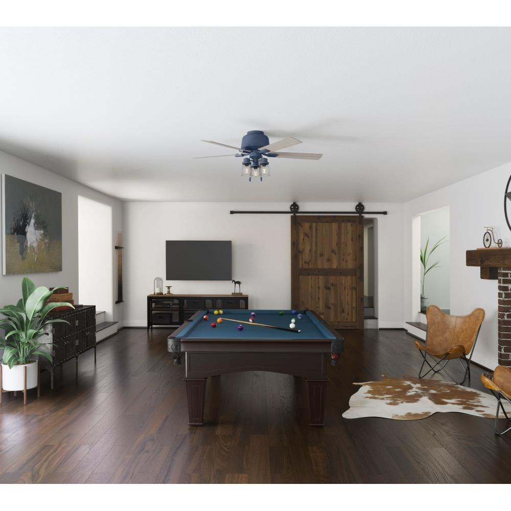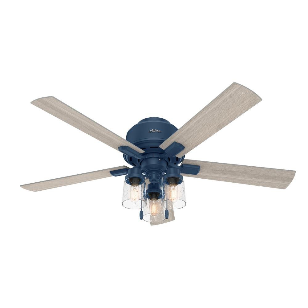 The Hartland chandelier inspired ceiling fan's clear seeded glass and included Edison LED light bulbs create a stunning look in large, casual spaces. This large ceiling fan is designed to fit flush in rooms with ceilings less than 9 feet high. Use the Indigo Blue finish to add a subtle pop of color or complement other fixtures in your space with the Noble Bronze or Matte Silver finish. Create a cohesive look in your space by pairing the Hartland ceiling fan with the coordinating light fixtures in its collection.3 Speeds13 degree blade pitch optimized to ensure ideal air movement and peak performance5 Light Gray Oak blades includedSpecially designed low-profile housing fits flush to the ceiling making it ideal for use in rooms with low ceilings less than 9'Low Profile housing is specially designed to fit flush to the ceiling and is ideal for use in rooms with low ceilingsIndigo Blue finishIncludes pull chains for quick and easy on/off and speed adjustmentsControl dimming with a handheld remote or wall controlIncludes 3 Light light kit with Clear Seeded glassIncludes 3 3.5W energy-efficient, dimmable LED bulbs to give you control of the ambiance in your spaceLED light kit for lower energy consumption, brighter light output and a longer lifespan than traditional bulbsRated for indoor spaces onlyLimited Lifetime Motor Warranty is backed by the only company with over 130 years in the fan business.