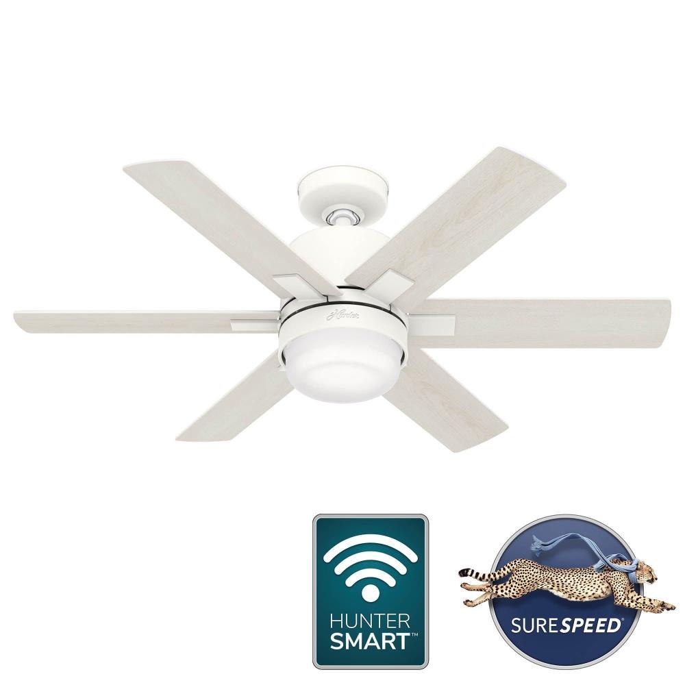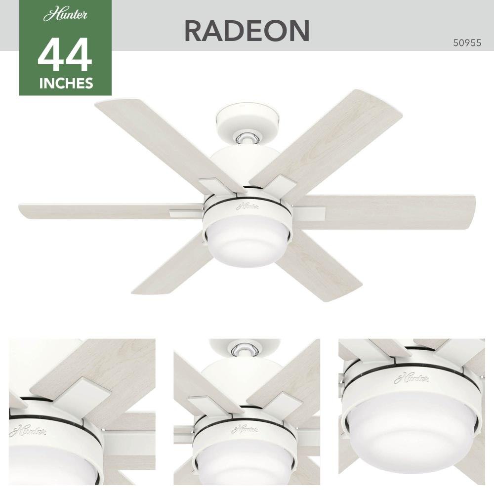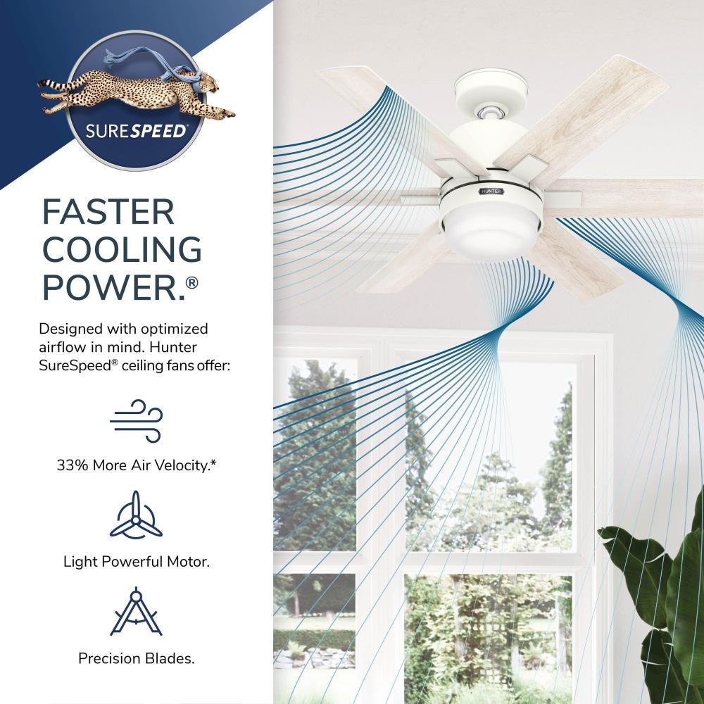Smart fan and high-speed cooling. The perfect fit for your small spaces. The Radeon smart fan is built with our SIMPLEconnect Wi-Fi capabilities to easily connect with your smart devices. Couple that with our SureSpeed Guarantee for optimized, cooling power, this modern ceiling fan will keep things comfortable and convenient in your small rooms.Built with our SureSpeed Guarantee to deliver faster airflow you can feelRated for indoor use only2 bulbs includedWall control includedAIRFLOW YOU FEEL: Built with our SureSpeed Guarantee, this fan delivers high airflow velocity while maintaining quiet, wobble-free performance.SMART HOME FAN: SIMPLEconnect Wi-Fi fan capabilities compatible with smart home devices including Apple HomeKit, Google Assistant, and Amazon Alexa.PRE-INSTALLED RECEIVER: Control receiver built into the fan. One less step for installation.EASY CONTROL FUNCTION: Use the control to adjust the fan speed and dim the light.WHISPER-QUIET MOTOR: 4-speed, WhisperWind reversible motor for optimal performance in summer and winter.SMALL ROOM FAN: Ideal size for home offices, laundry rooms, and bedrooms.STANDARD PROFILE MOUNTING: 3 inch and 2 inch downrods included.COMPATIBLE ACCESSORIES: Works with Hunter and Casablanca accessories, not including Hunter Original accessoriesWARRANTY: Limited Lifetime Motor Warranty backed by the only company with over 135 years in the fan business