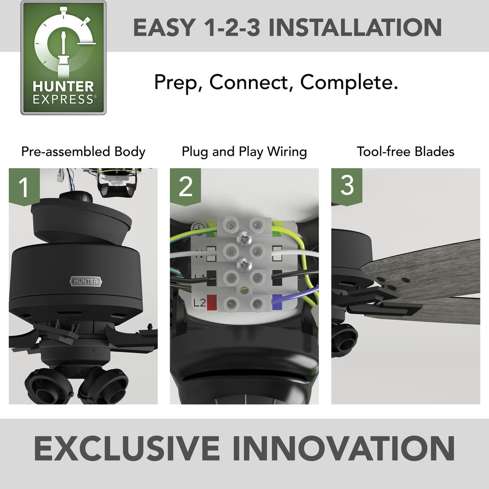 - HunterExpress®: With pre-assembled components, with less steps for easy 1-2-3 installation