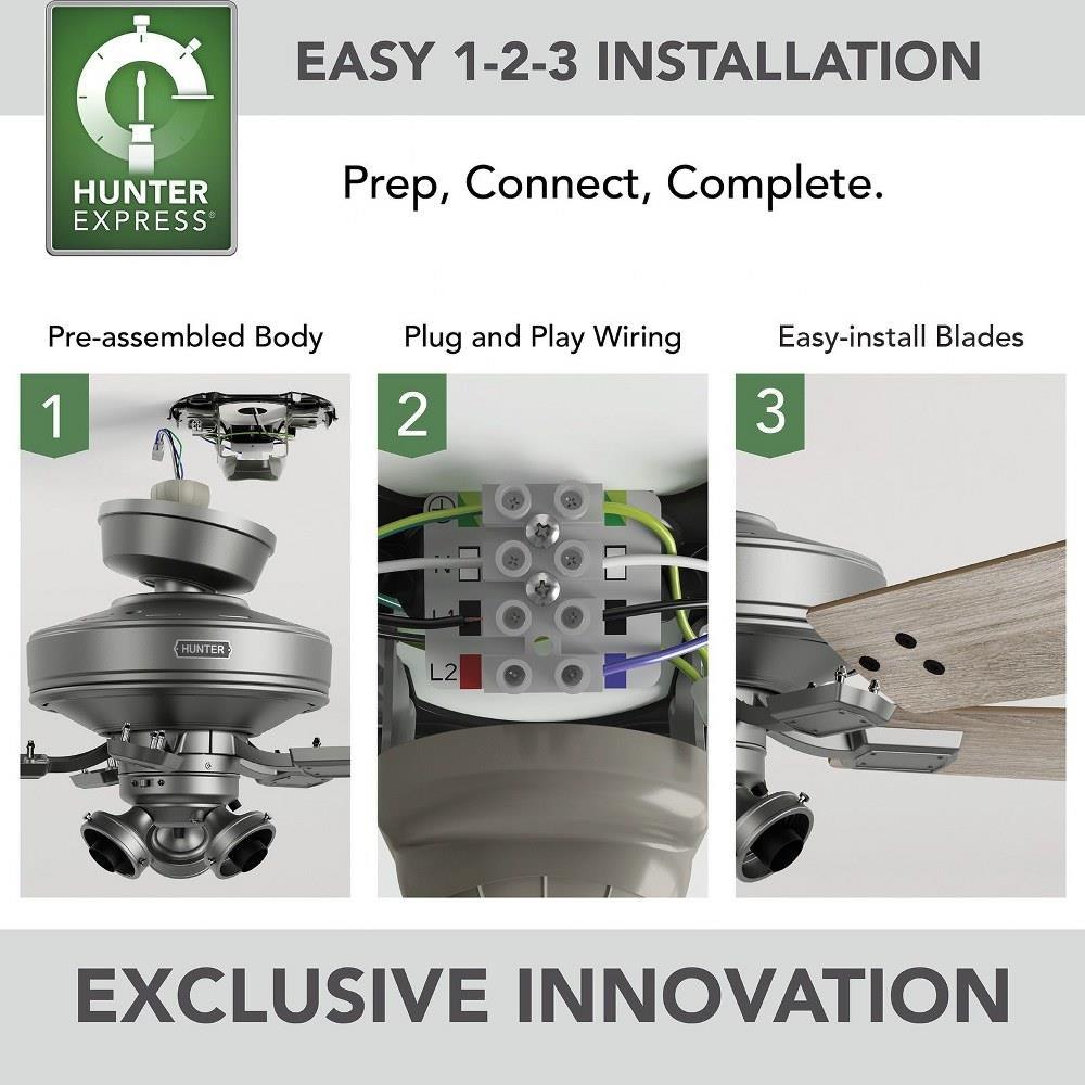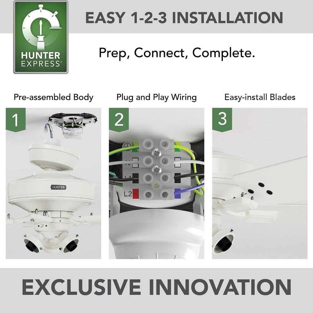 • HunterExpress® fans are created for easy 1-2-3- installation that comes with a pre-assembled body, plug & play wiring, and tool-free blades