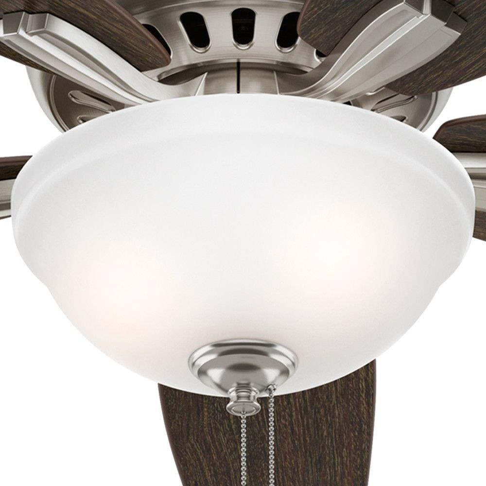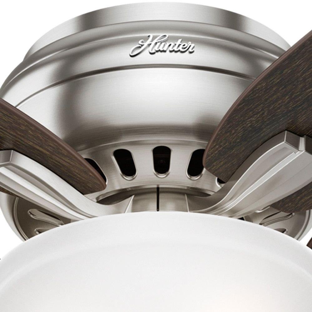 With its charming appearance, the Newsome low-profile ceiling fan with light will complement your casual design style. The clean line details throughout the fan body and blade irons work together to create a coherent design that will fit any standard or large room with a low ceiling. The handsome bowl light fixture provides your ideal ambiance while the 52-inch blades are powered by a three-speed WhisperWind motor delivering superior air movement and whisper-quiet performance so you get all the cooling power you want without the noise. The Newsome Collection offers you the freedom to choose from many different sizes, light kits, and other options to maintain a consistent look throughout every room in your home.