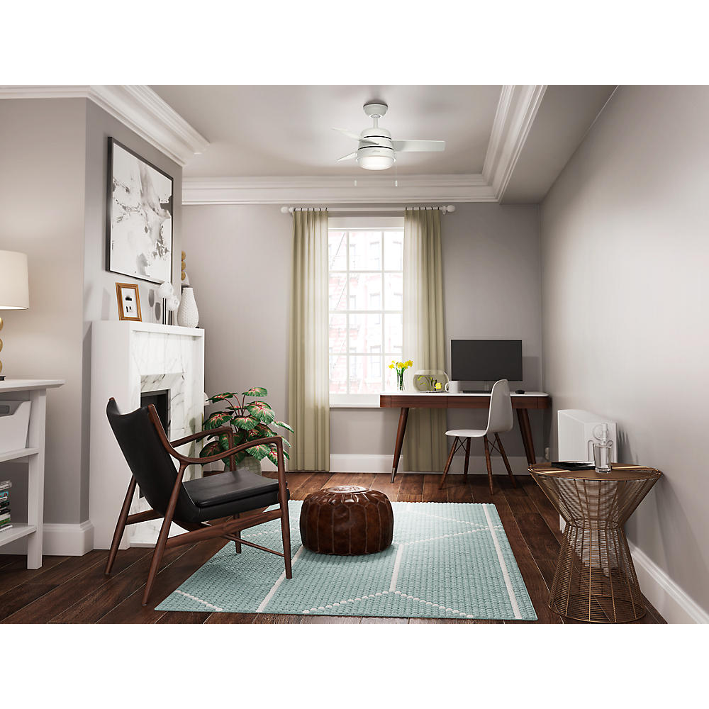 With a 36-inch blade span, the Hunter Aker ceiling fan is perfect for spaces like home offices, hallways, and even bathrooms. This small Scandinavian-style ceiling fan features dimmable, energy-efficient LED bulbs that provide just the right amount of light while the reversible, three-speed WhisperWind motor delivers ultra-powerful air movement with whisper-quiet performance.