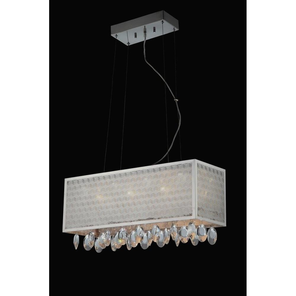 Polished chrome rectangular frames with two toned patterned lurex, accented by full cut assorted drop crystals make a glamorous statement for your home. Three distinct lighting levels with one remote, first press sets the mood with LED lighting, second press switches to a crisp Halogen lighting, third press brings the LED and Halogen on together for a dramatic entertaining setting.